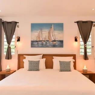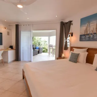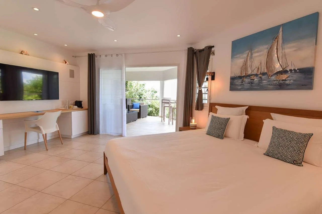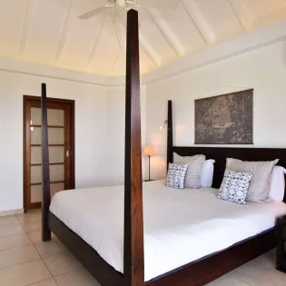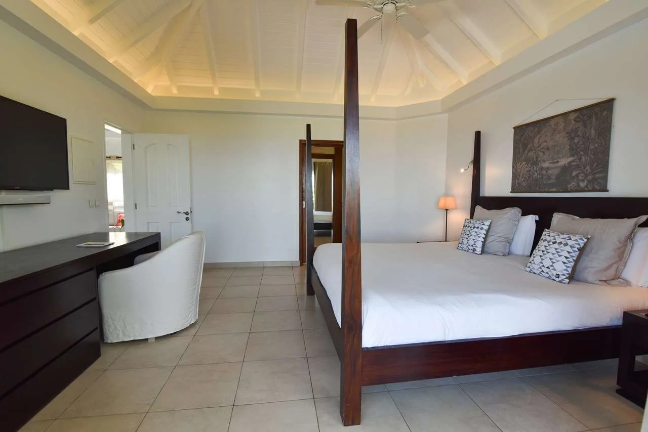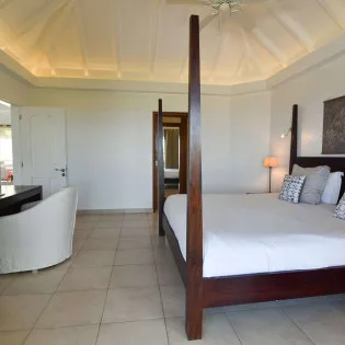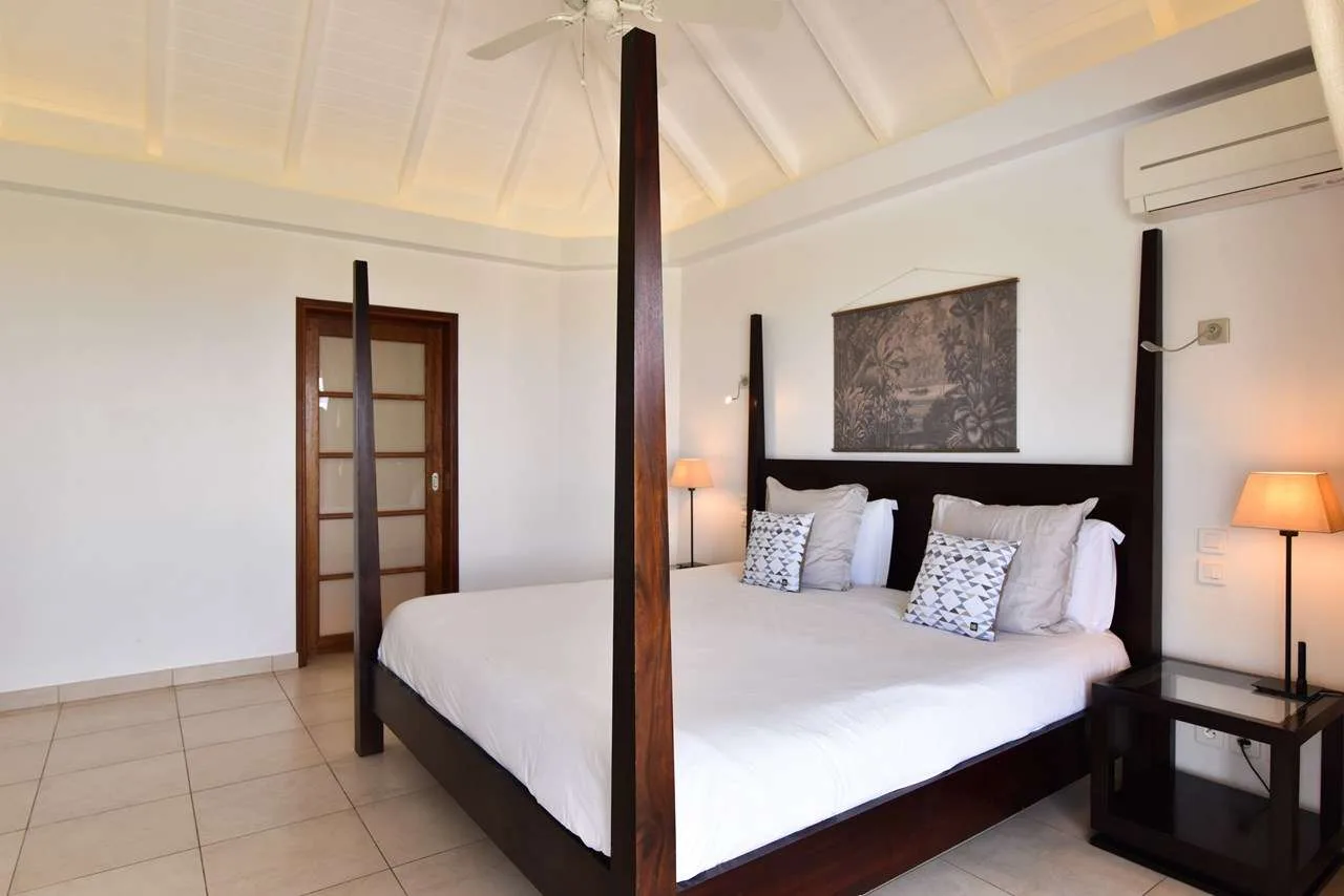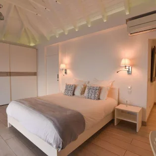 There are 3 bedrooms at Villa Au Coeur du Rocher, both providing privacy for guests. The master bedroom, which is connected to the living room, offers a king-size bed, and ensuite bathroom with tub, and opens to the terrace with an ocean view.