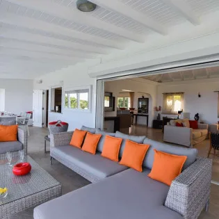 The spacious living room is furnished with comfortable white sofas and opens onto the terrace, pool, and view. It’s a tempting spot to kick back with a cool drink, gazing out at the beguiling views over St. Barts.