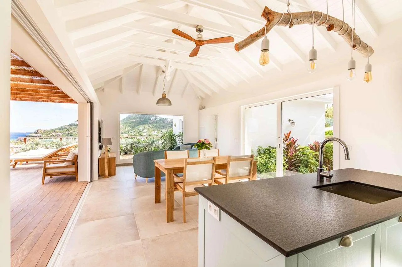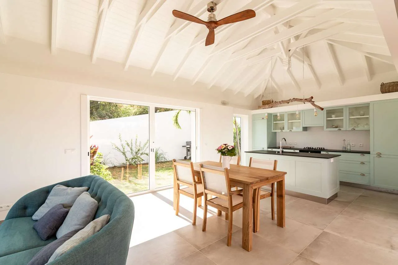 Between the kitchen and living room is a small dining table, ideal for meals inside the villa. A screened door on one side leads out to a charming inner courtyard with a lawn and tropical plants. On the terrace in the other direction is a second dining table, the ideal place for a relaxed meal while the sunset fades across St. Barts.