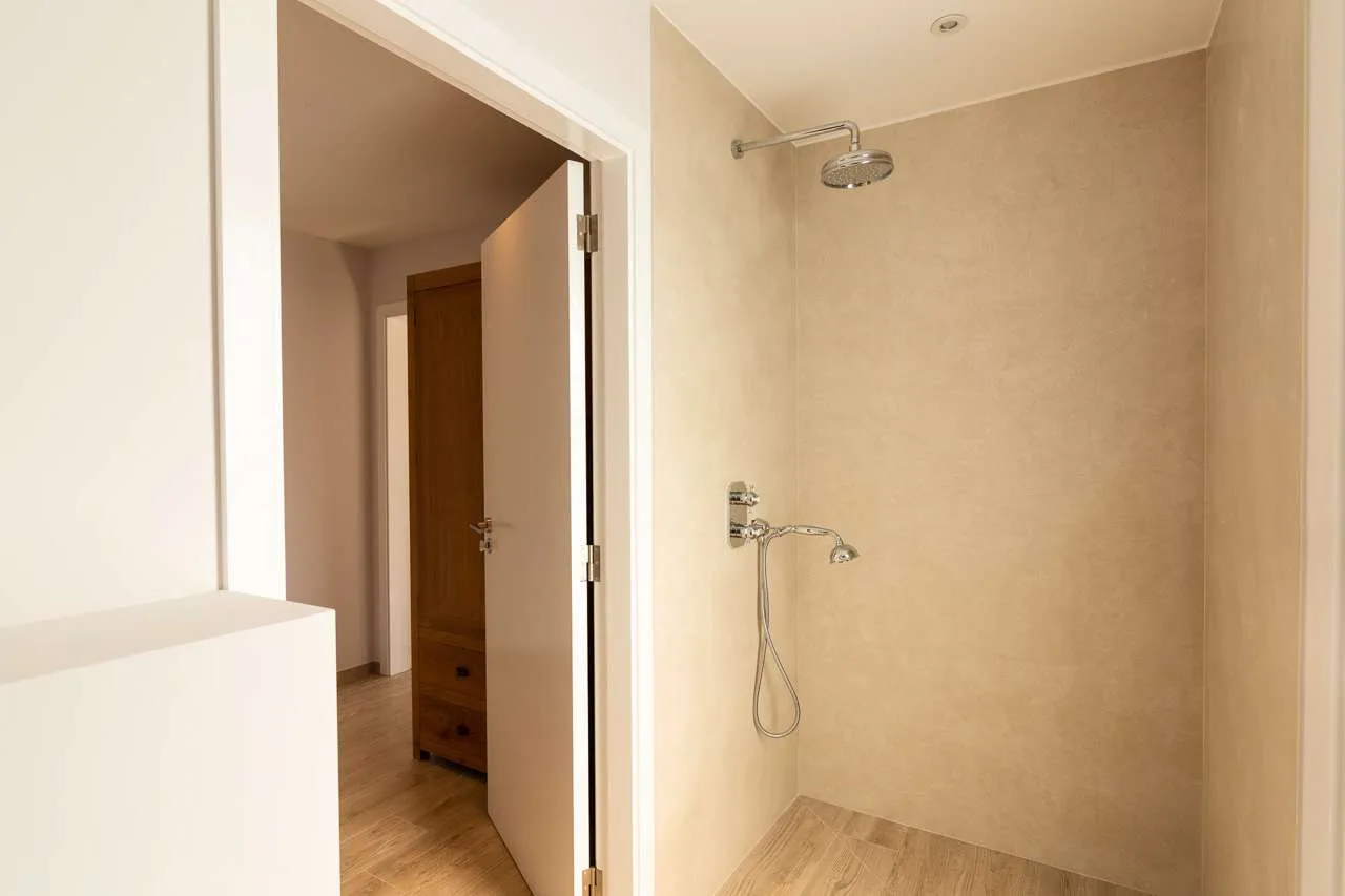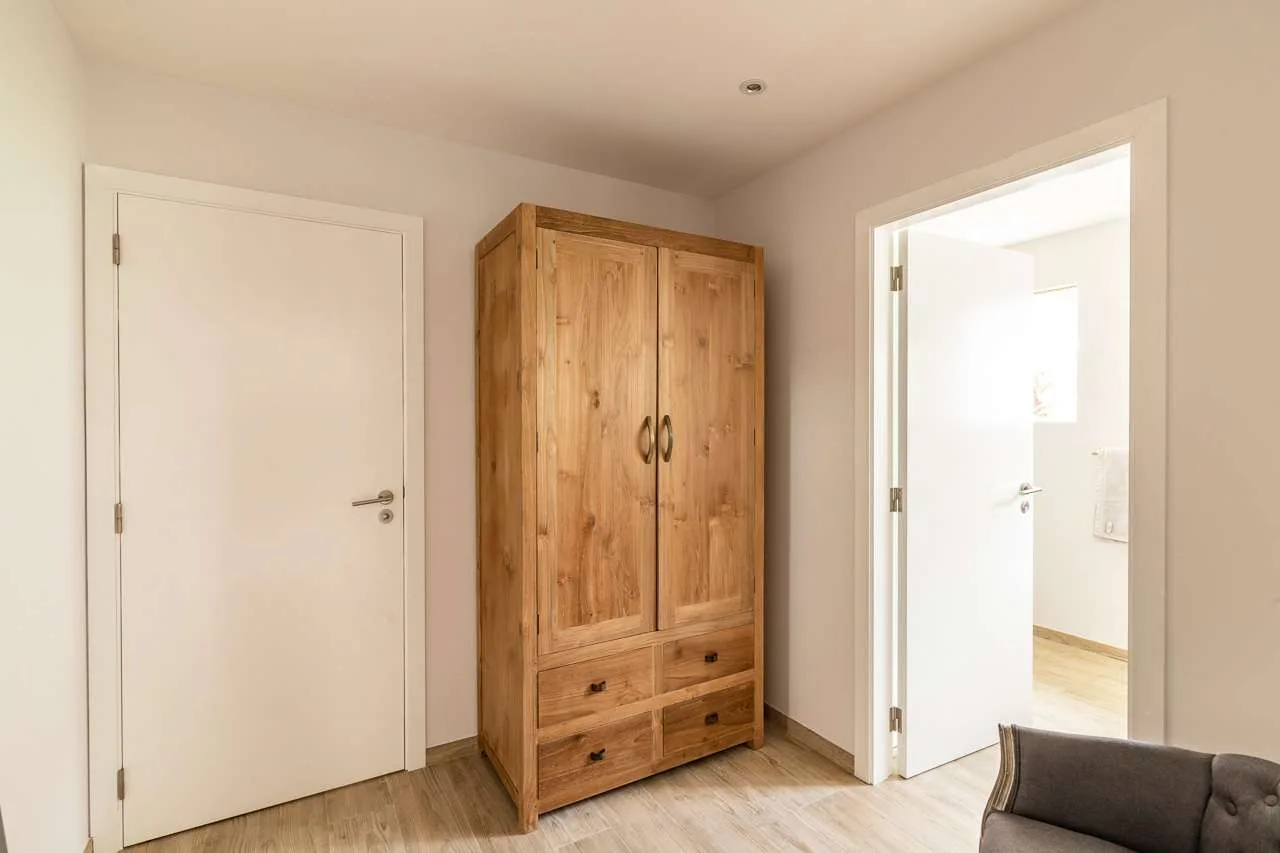 The first bedroom is connected to the living room, with large windows letting in plenty of light and offering gorgeous views. It has a Euro king-sized bed, ensuite dressing room, and bathroom with shower. The second bedroom is situated in a separate bungalow next to the entrance.