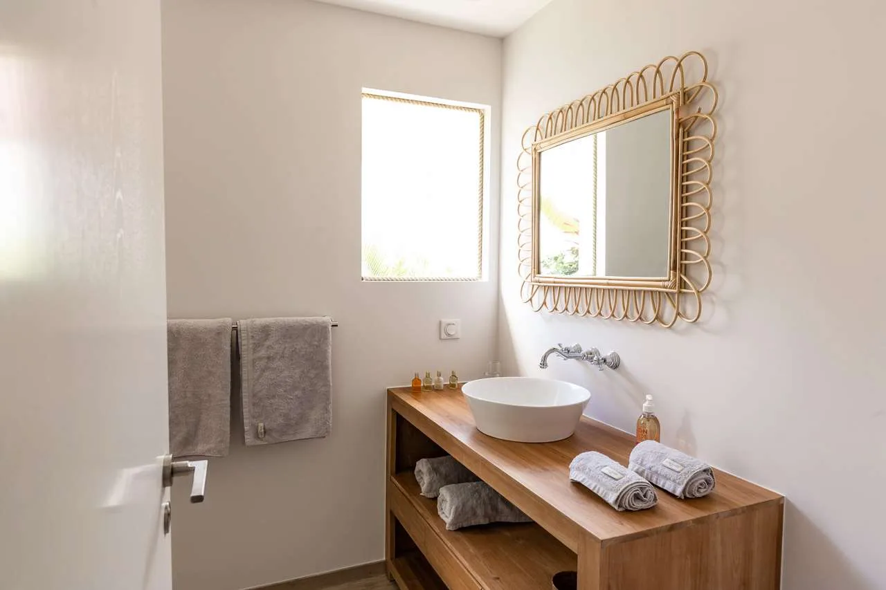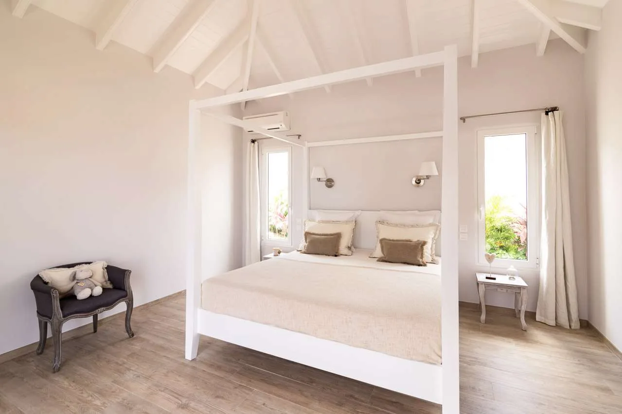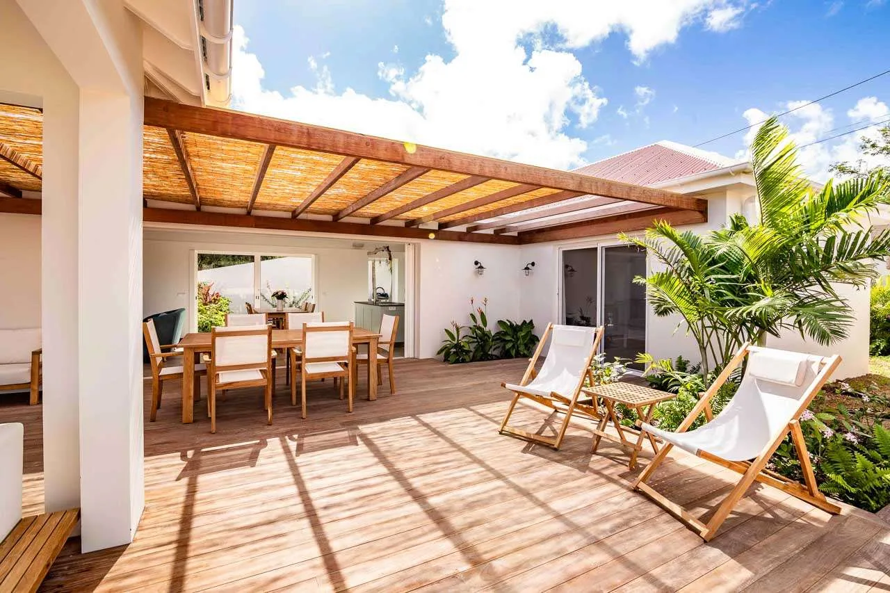 Cozy, warm, and welcoming, Villa Au Paille En Queue is a masterclass in French sophistication. Surrounded by lush gardens, the villa spans two separate bungalows, connected with beautiful wooden terraces. The open-plan design superbly blends inside and out, providing ample space for lounging, sunbathing, and enjoying the island breezes.