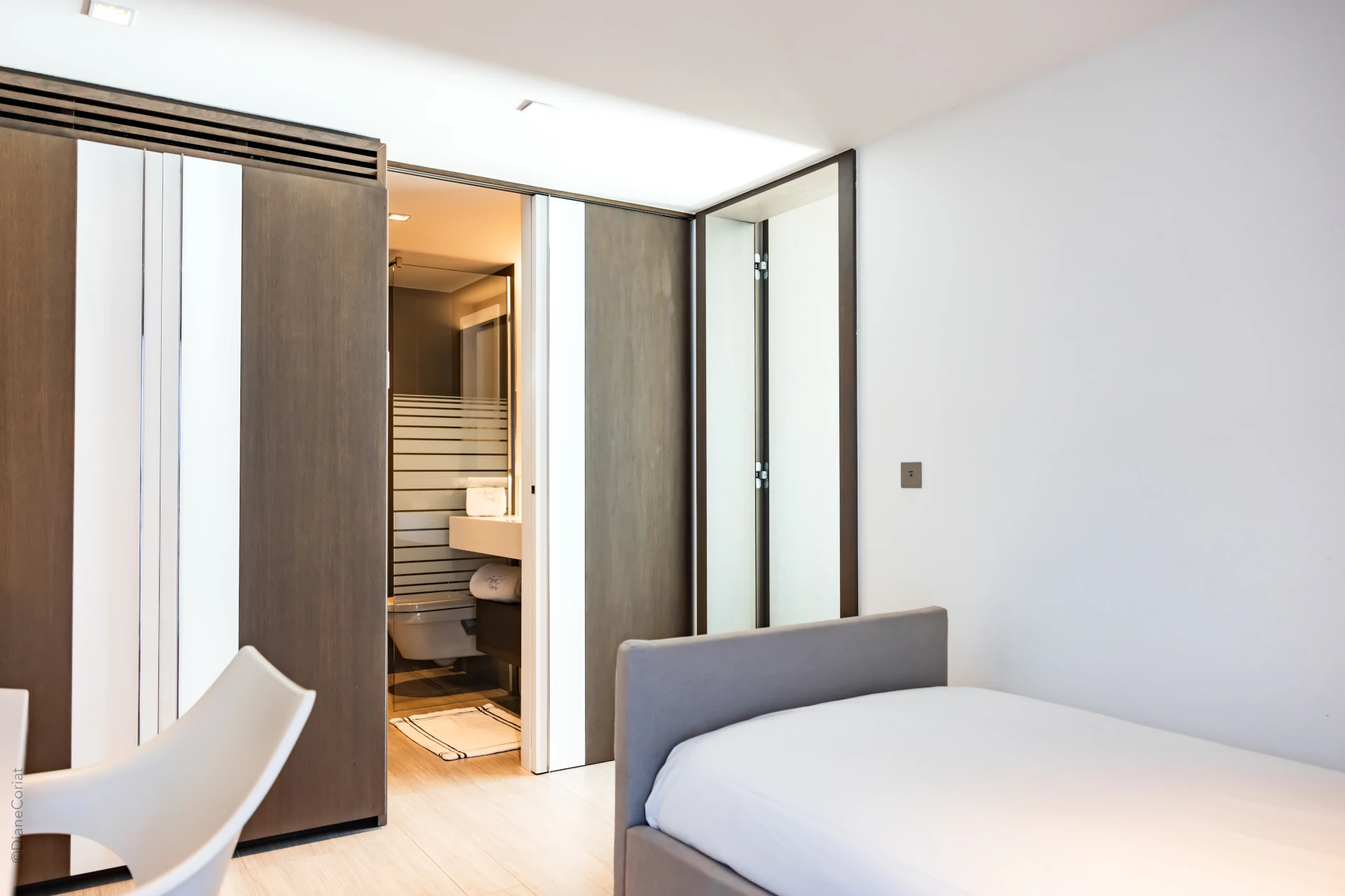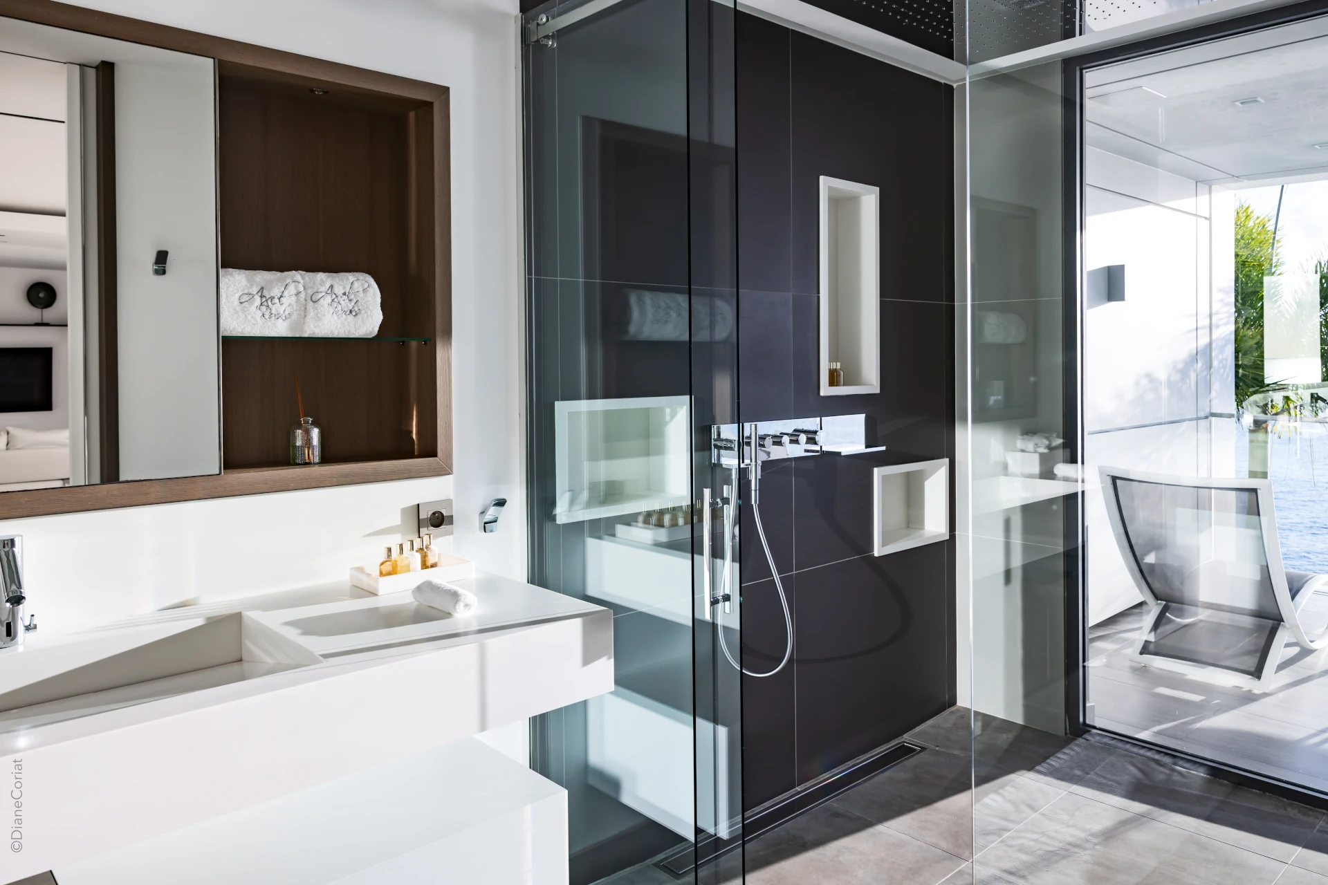 One of the bedrooms is off the living area, with direct access to the terrace. The other three bedrooms, including the luxurious master suite, are on the upper level. Each of these bedrooms has a private terrace with loungers. The master suite terrace also has its own outdoor sofa, a good spot to enjoy the ocean views and a spot of stargazing after dark. A small bedroom with a bath is located off of the third bedroom, and is also accessible from the outside; it has a single bed and is only suitable for older children of a staff member.