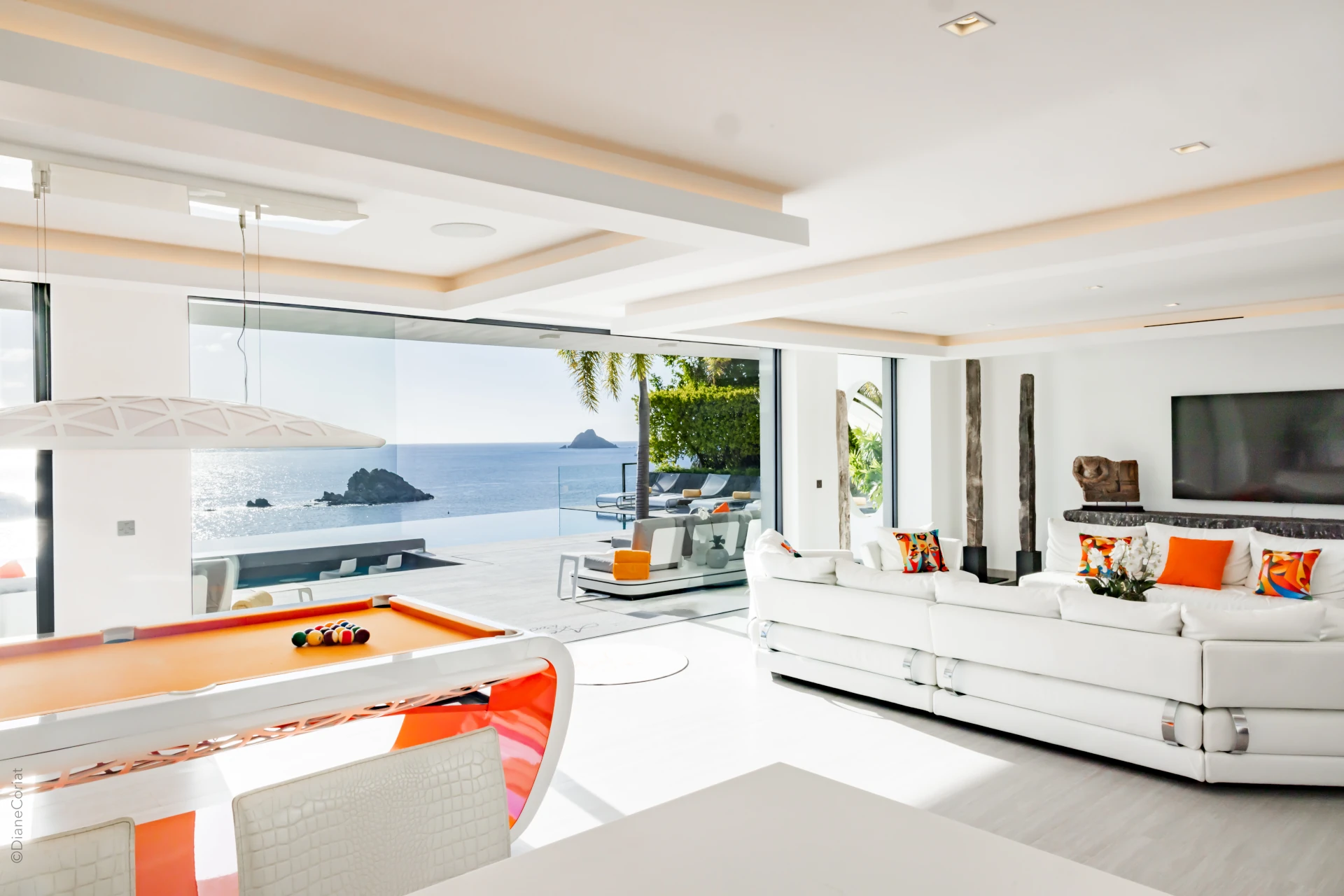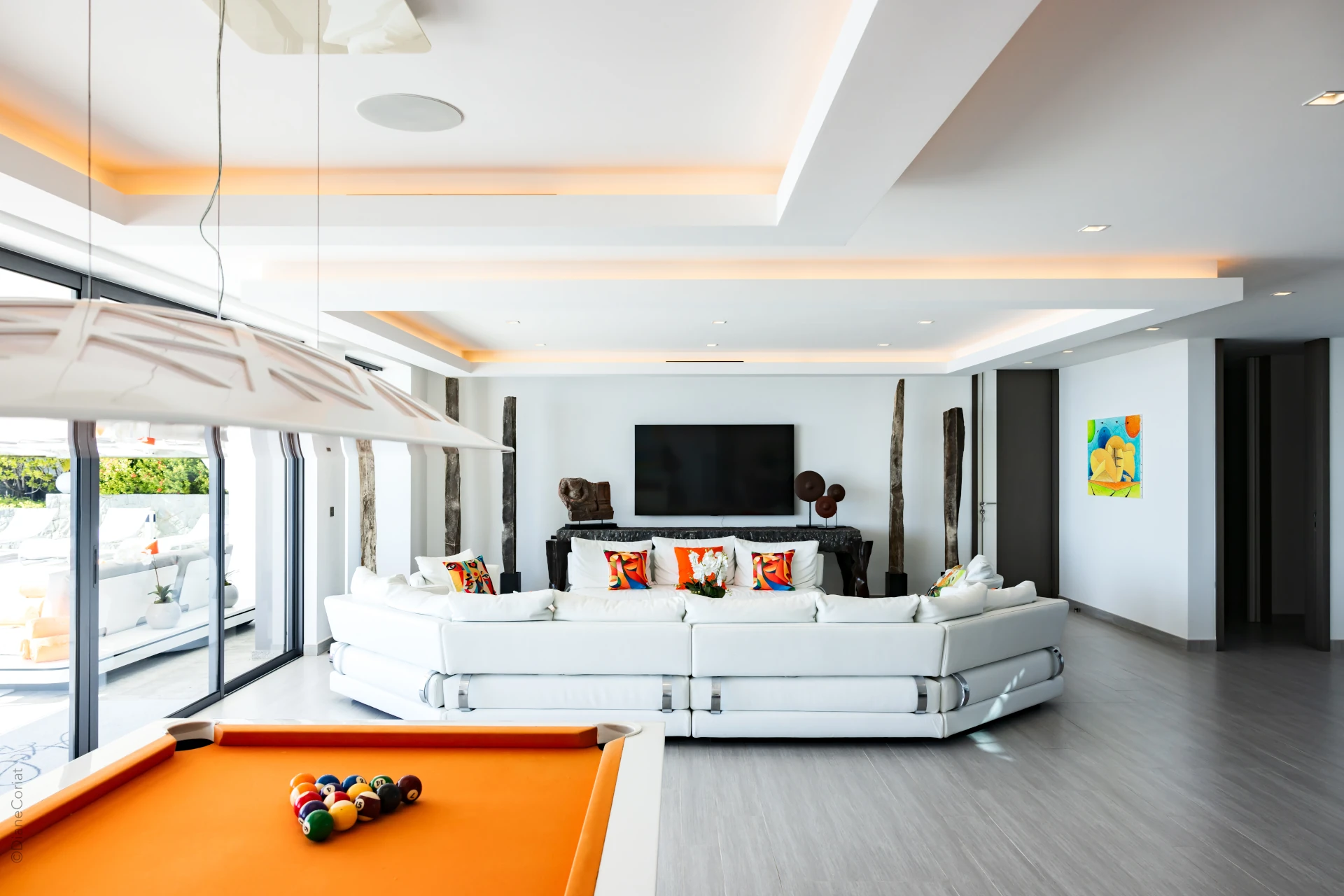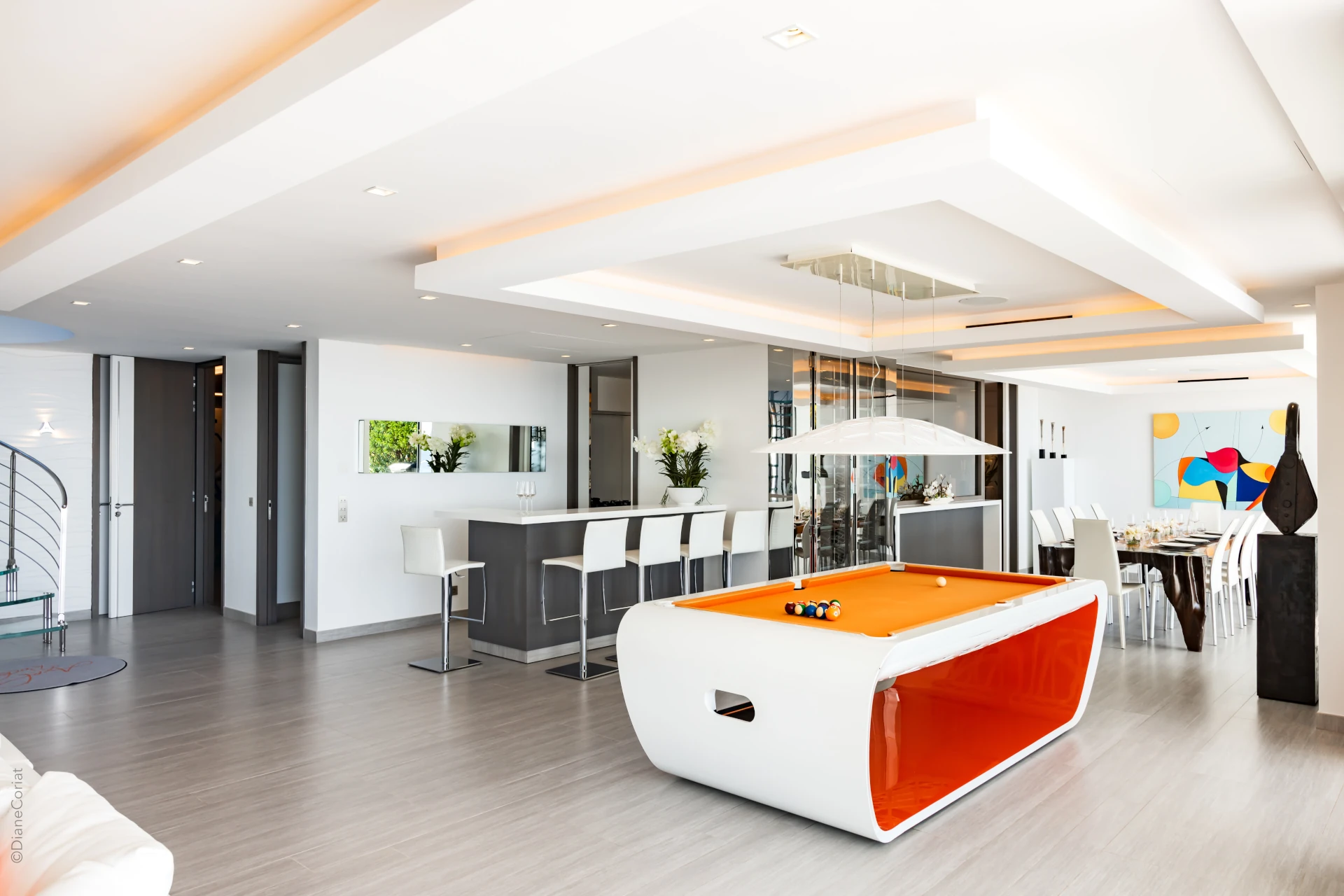 Even more entertainment options are next to the living room, with a modern pool table and the villa’s bar. Across the entire room, the villa’s Sonos sound system can quickly turn any evening into an island party.