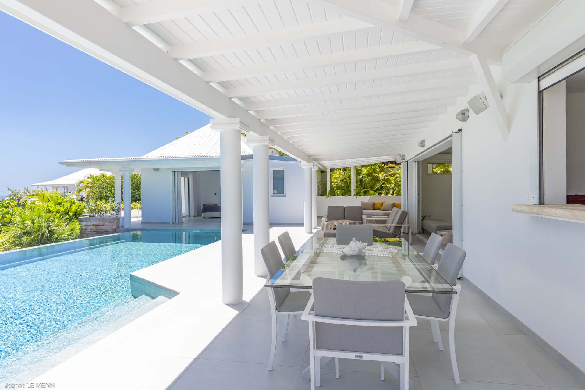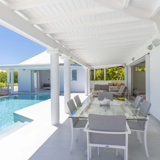 A breakfast bar is an ideal spot for a quick espresso before diving into the pool. Next to it is the indoor dining room with seating for 8 guests, ideal for hosting dinner parties. For alfresco meals, a covered terrace has an outdoor dining area poolside.