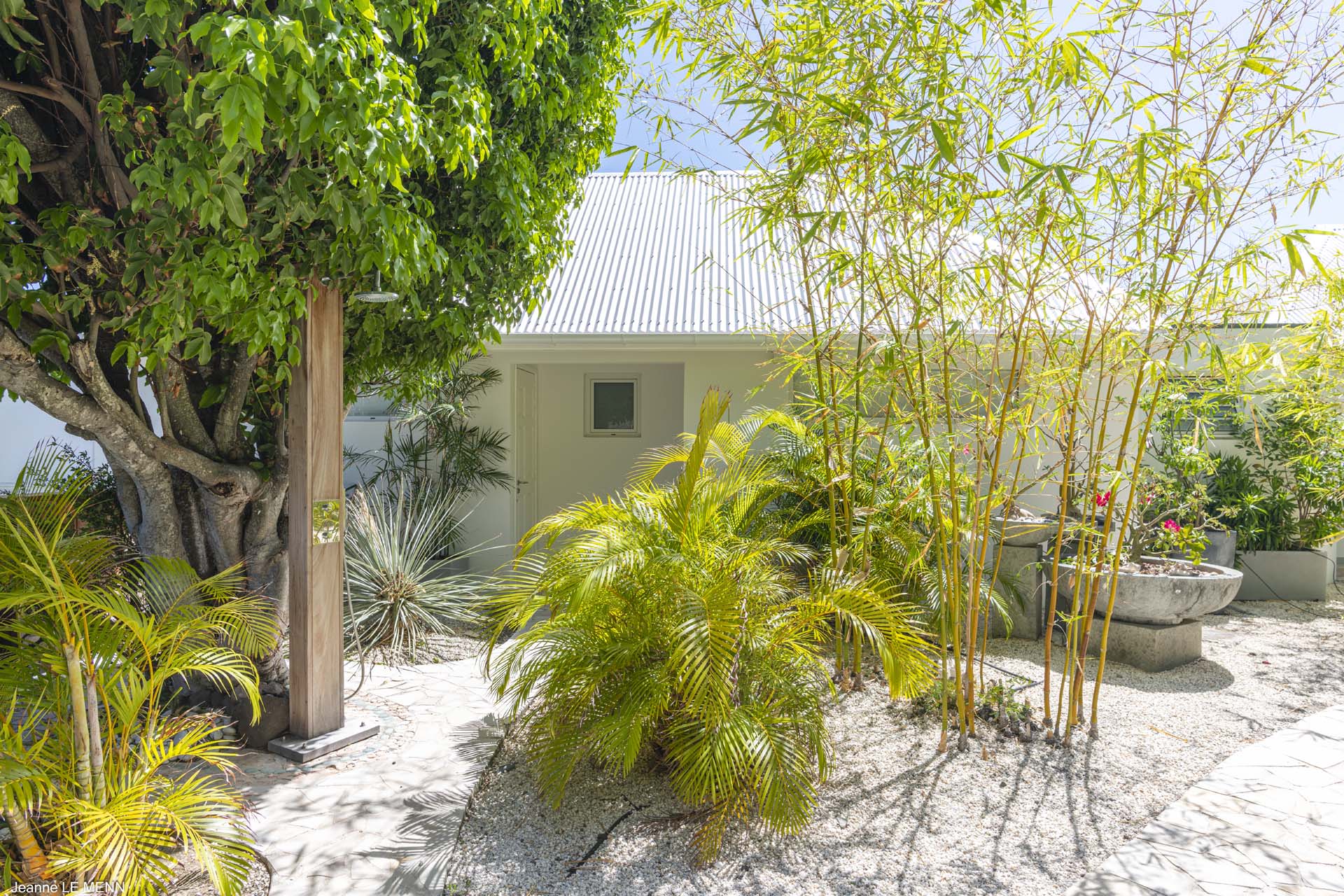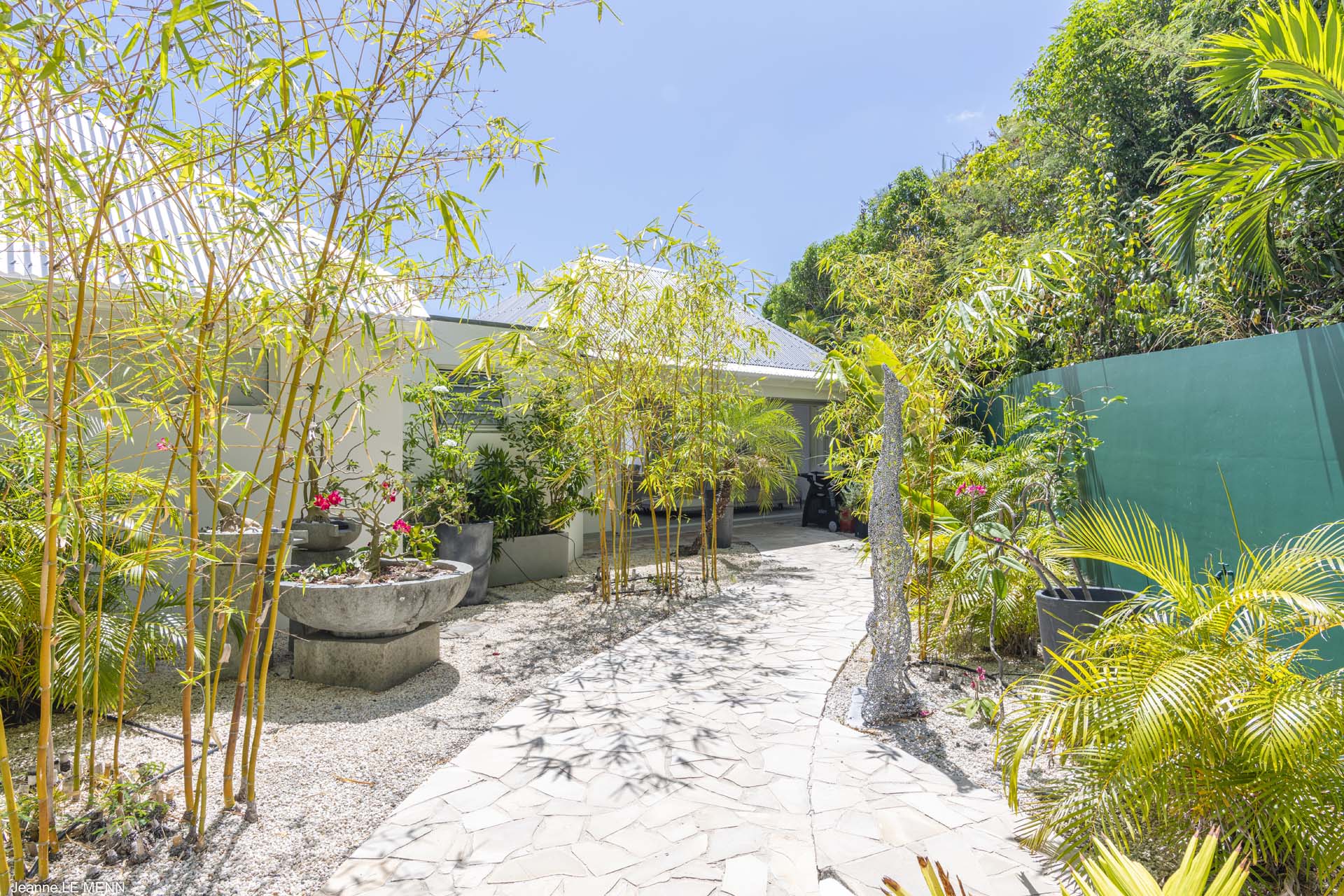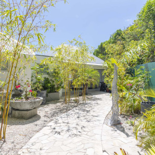 Lots of bamboo plantings at the entrance of the villa with a fountain