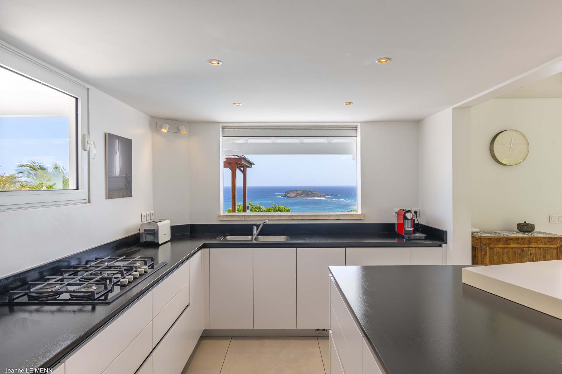 Blender, Coffee Maker, Icemaker, Juicer, Microwave, Nespresso Coffee Machine, Toaster, Gourmet kitchen with granite counter tops and breakfast bar, opens onto pool and view.