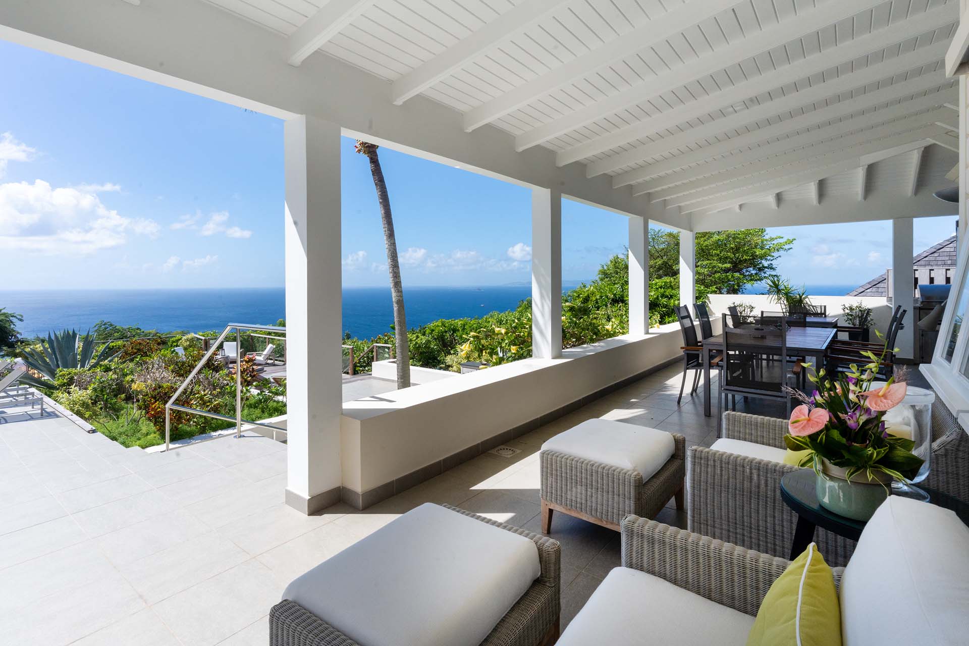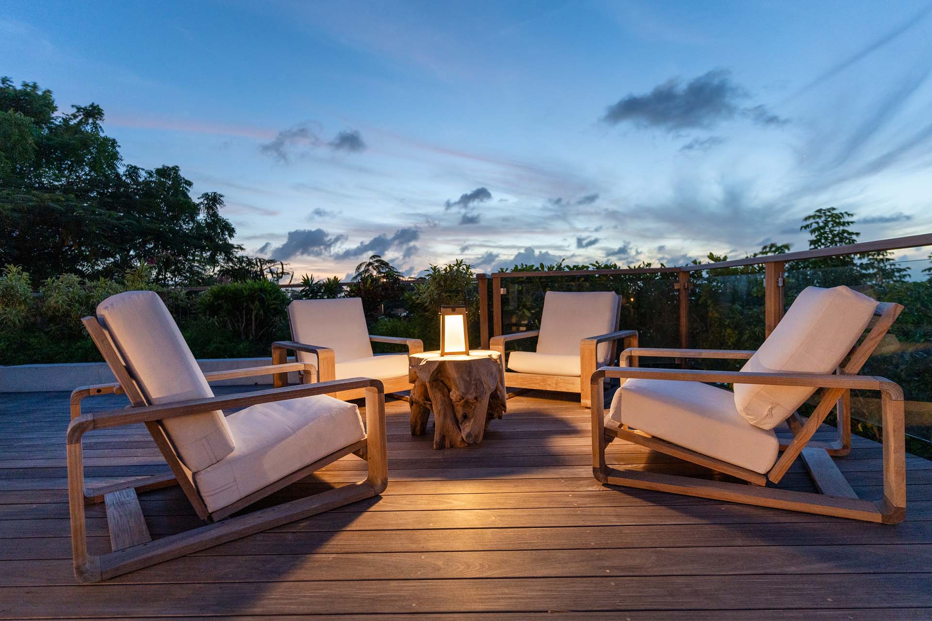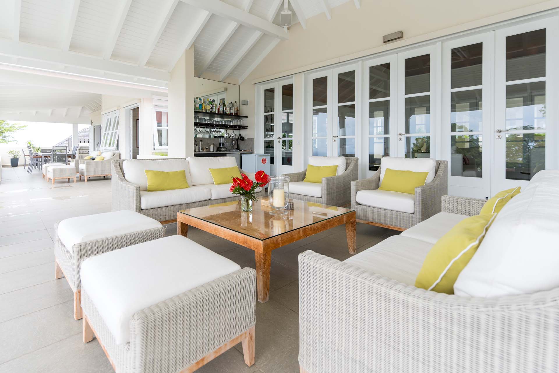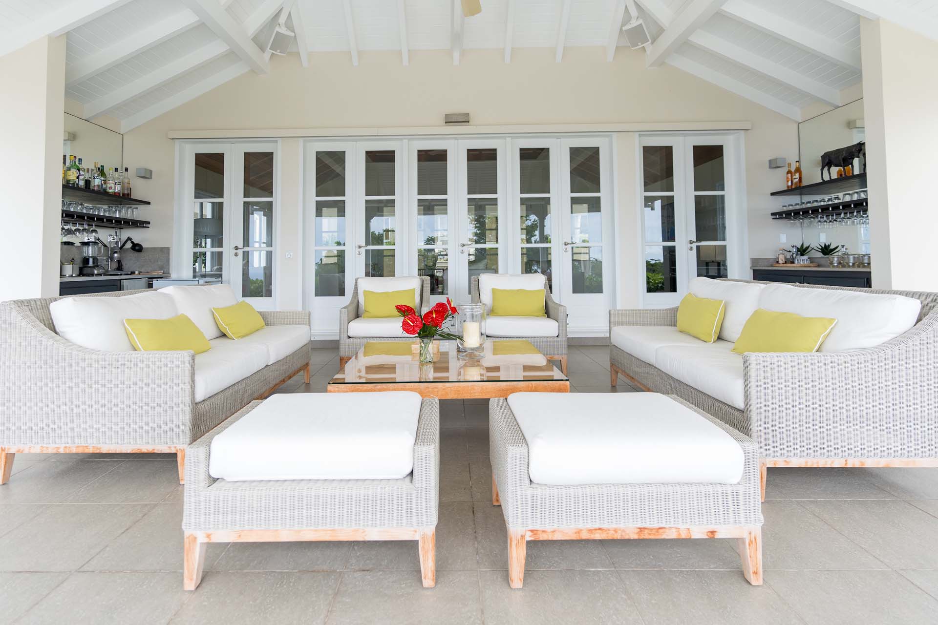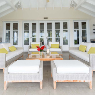 Outside the main living room is the expansive covered deck. A comfortable lounge area with Rattan sofas offers a nice spot to sink in, open a bottle of wine, and enjoy the stunning sunsets across the sea and islands.