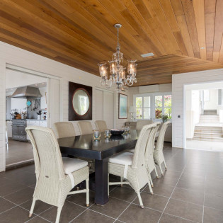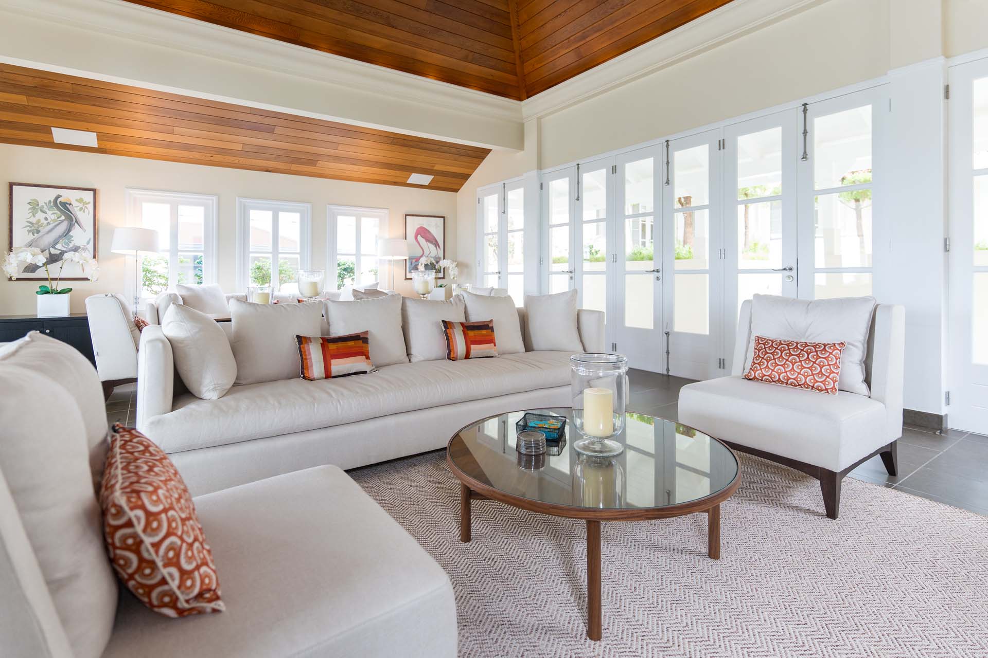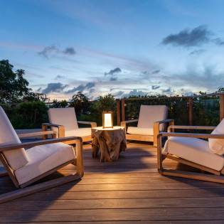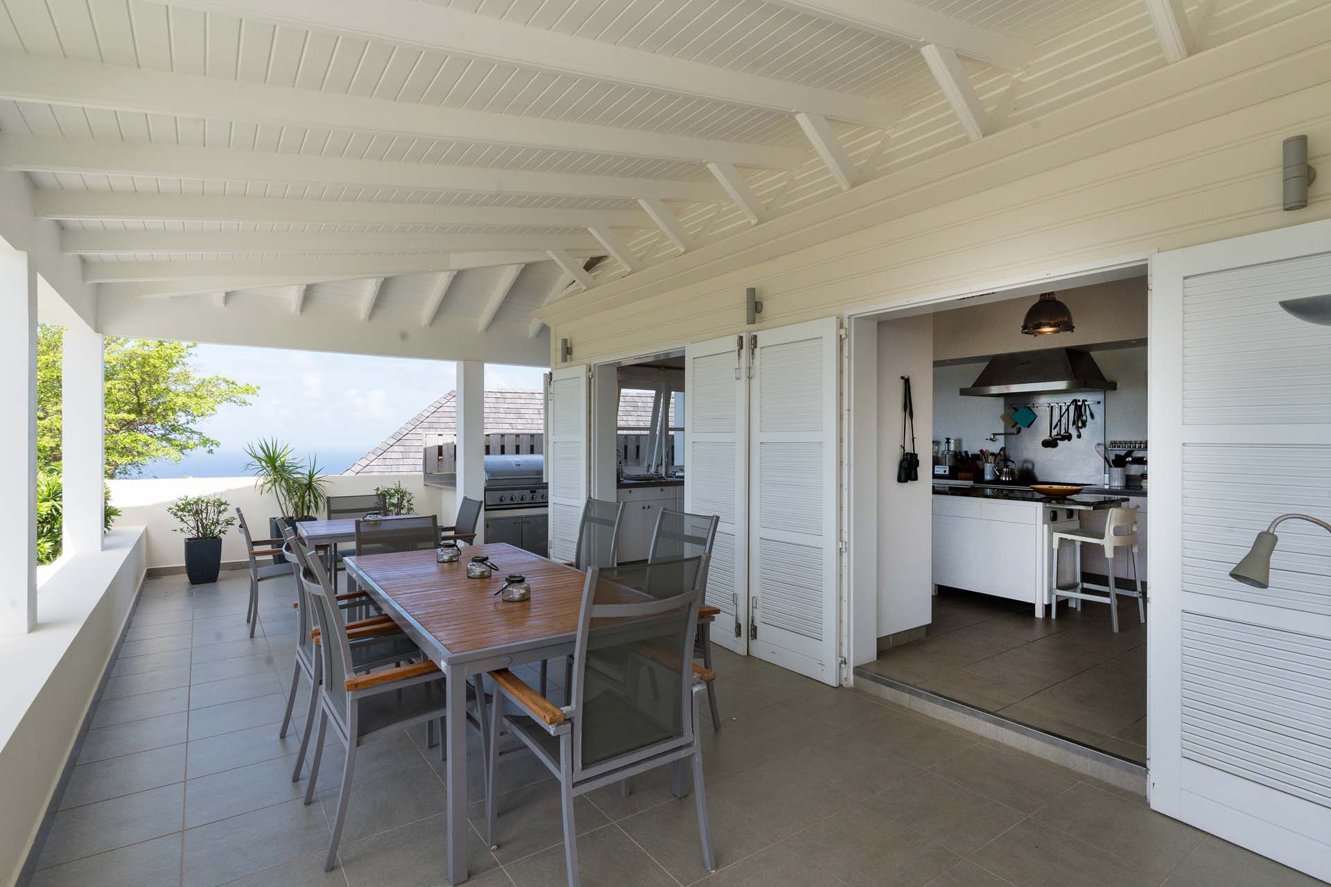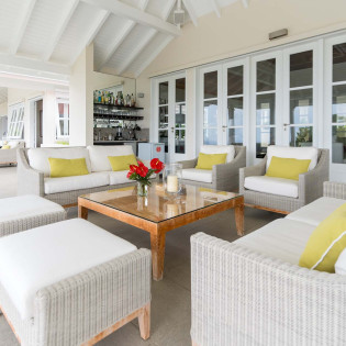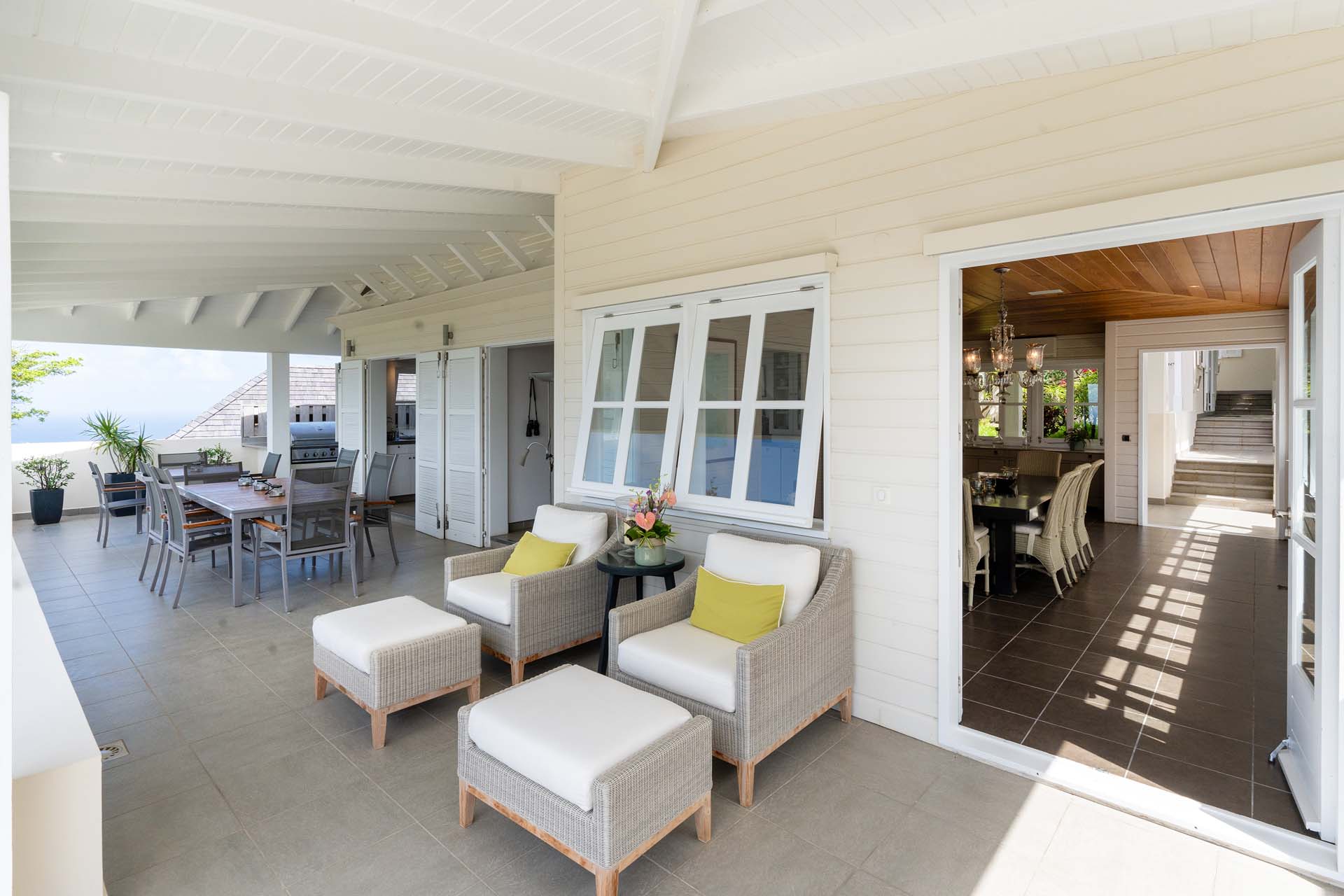 Outside the main living room is the expansive covered deck. A comfortable lounge area with Rattan sofas offers a nice spot to sink in, open a bottle of wine, and enjoy the stunning sunsets across the sea and islands.