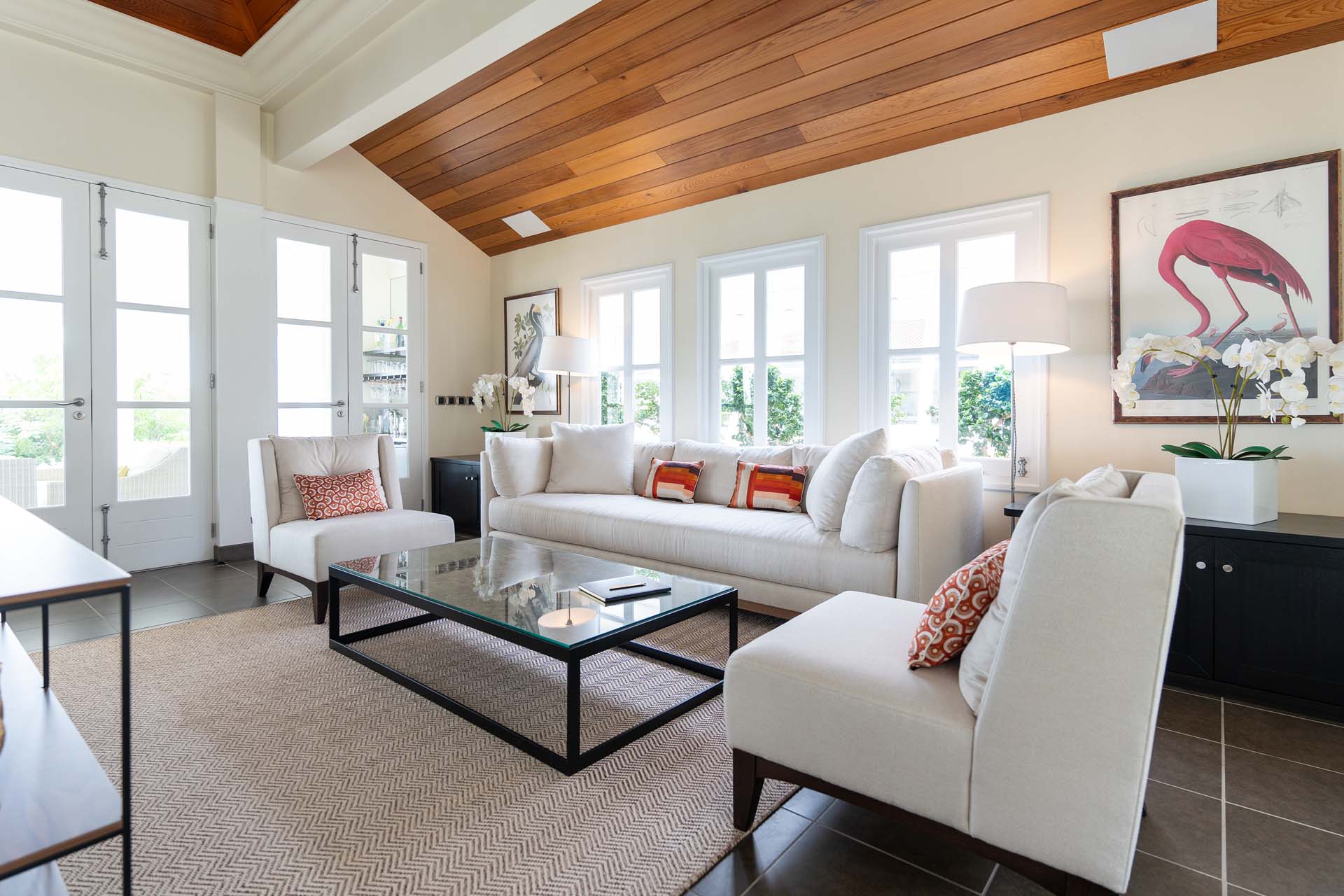 The large living room pavilion features French doors opening towards the outdoor terrace and ocean views. Sofas, armchairs, and artworks all pop with vibrant patterns, contrasting with dark wooden details and accents.