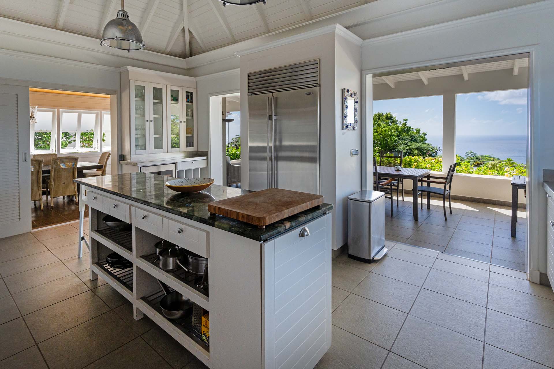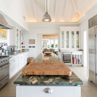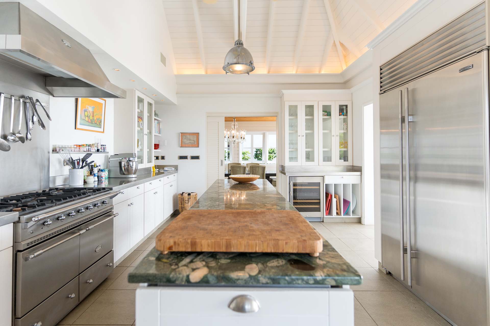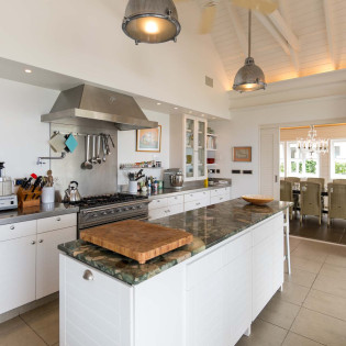 Villa Belle Bague’s kitchen has stainless steel appliances and granite countertops and opens to an outdoor dining area and a full bar under a covered terrace. A formal dining room with a French sideboard has seating suitable for up to 10 guests under an antique chandelier. It’s a magnificent setting for elegant dinners with family and friends.
