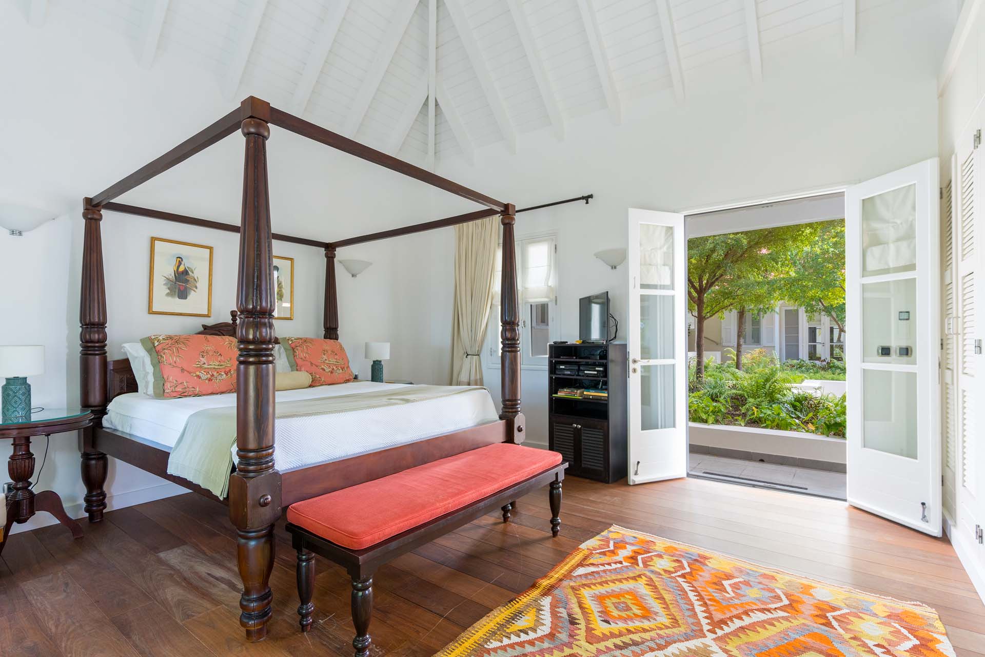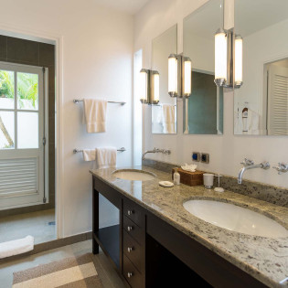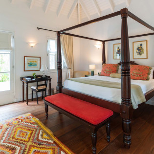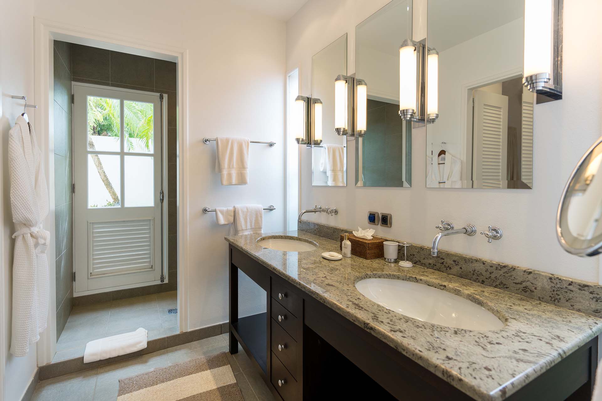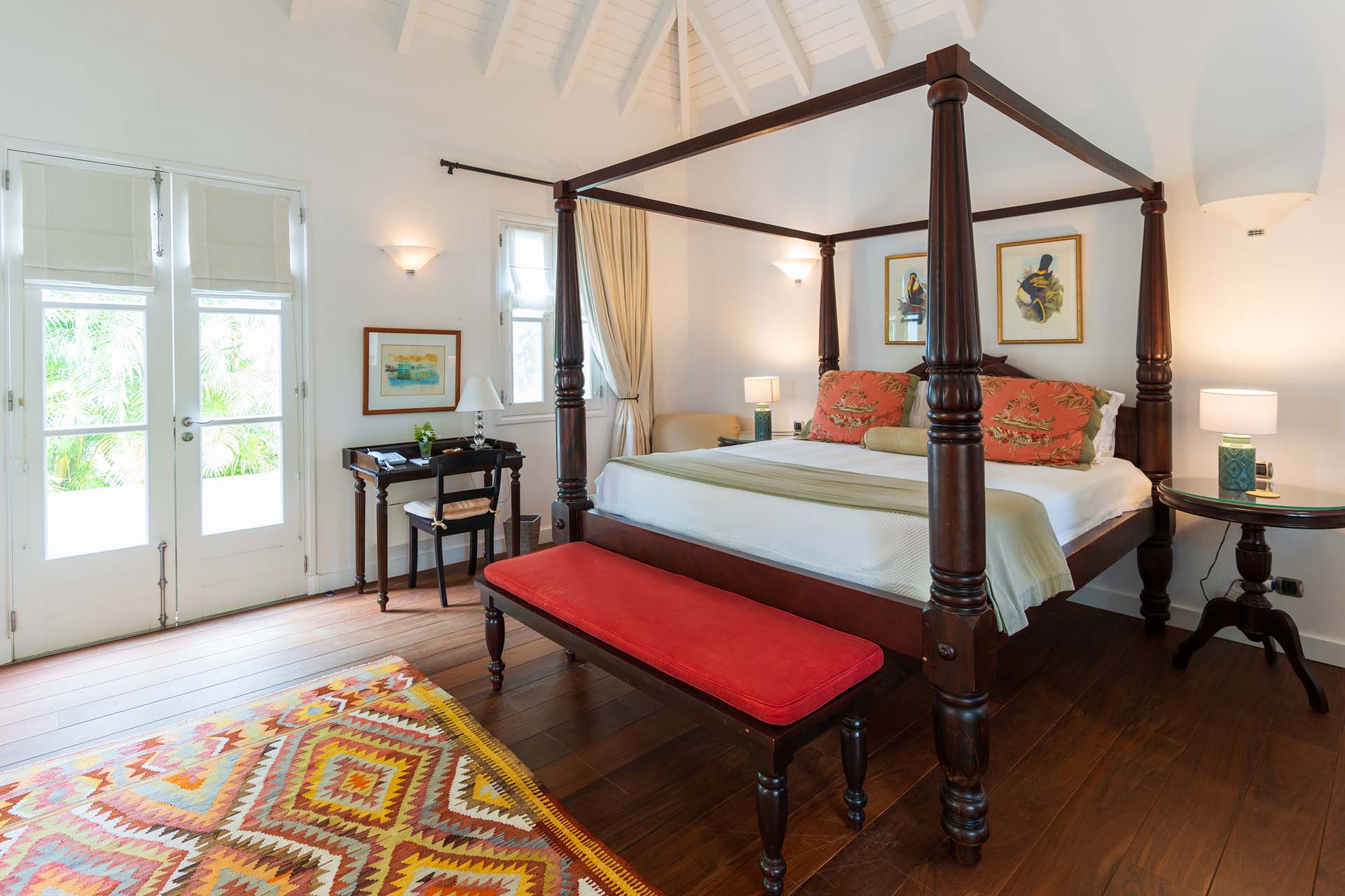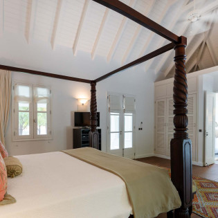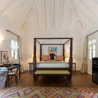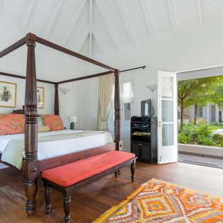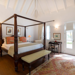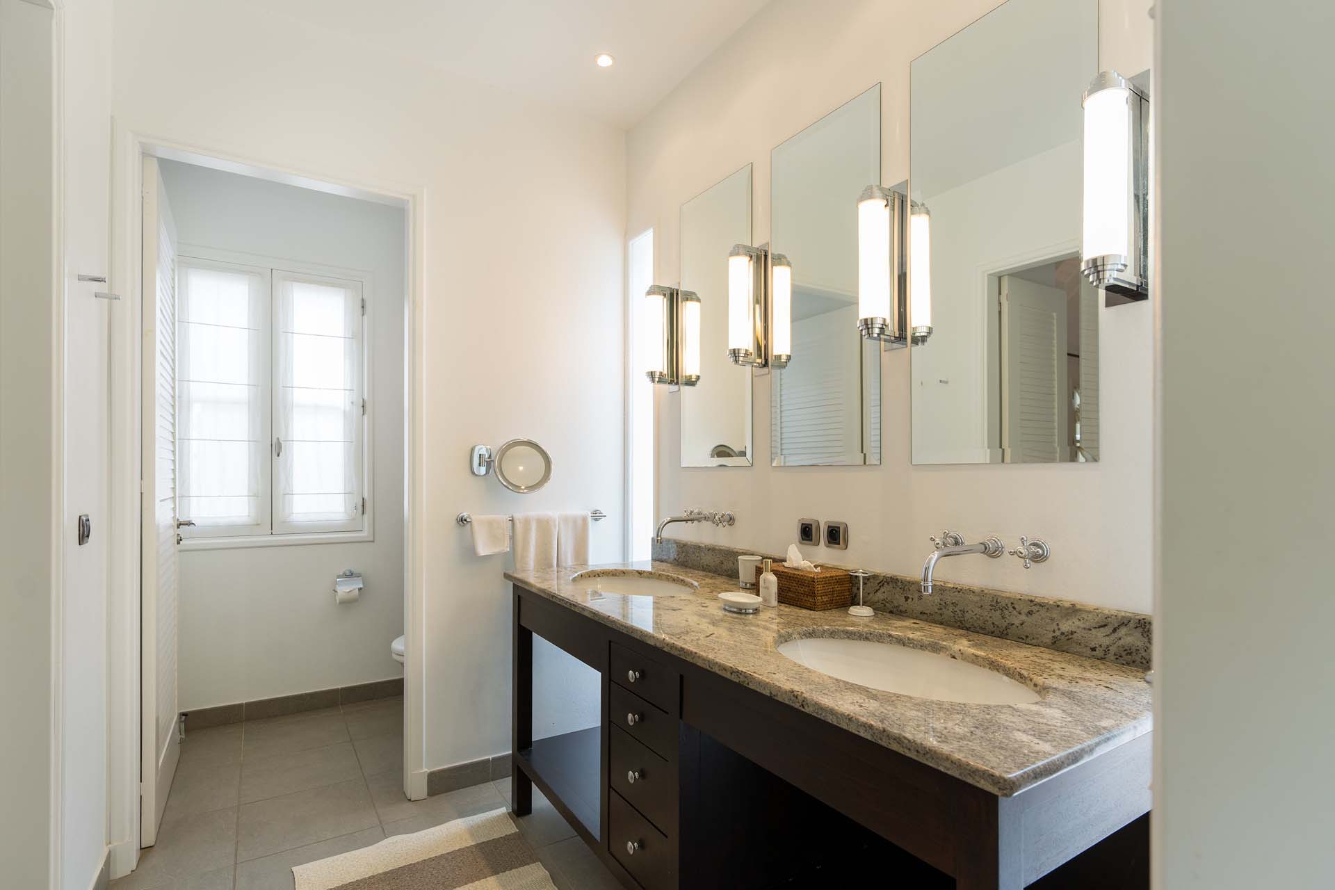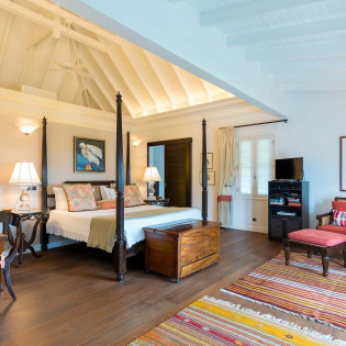 Three of the four bedrooms are in separate cottages, located around the central cloister. Each bedroom has colonial-style furnishings and a queen-sized bed, offering a fantastic night’s sleep. The rooms also come with an ensuite bathroom with granite-topped vanities and a private terrace ideal for sunbathing. The fourth bedroom is similarly furnished and opens towards the pool terrace.