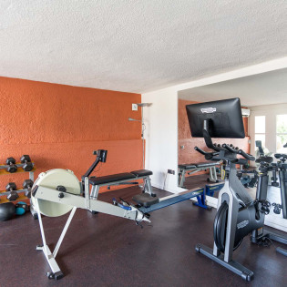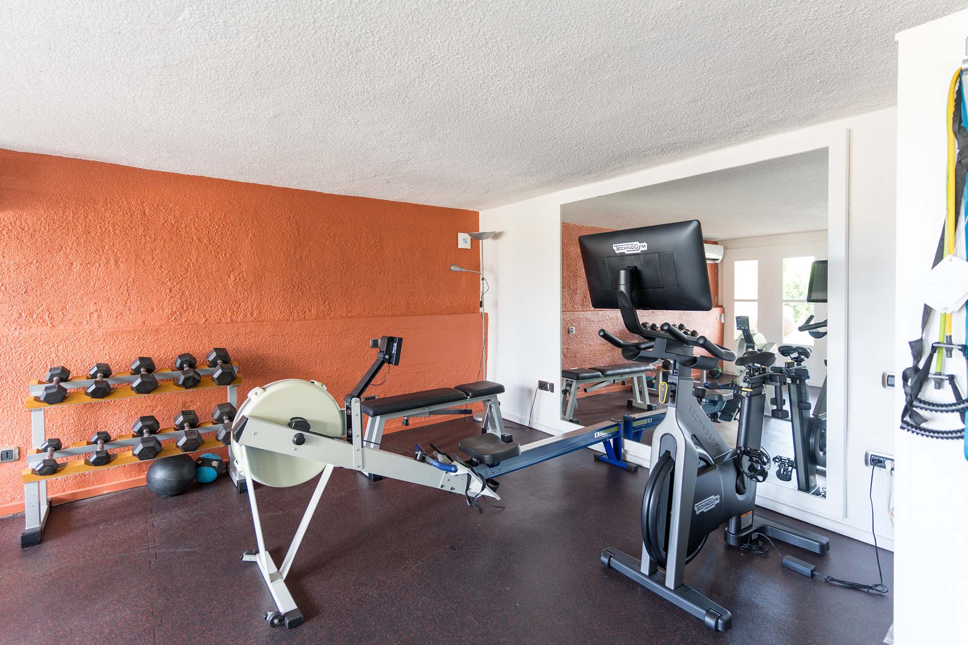 A gym equipped with weights, a rowing machine, and an elliptical is an ideal spot to work up a sweat. For those that need to get some work done, behind the kitchen is also a spacious office, complete with a computer and printer.