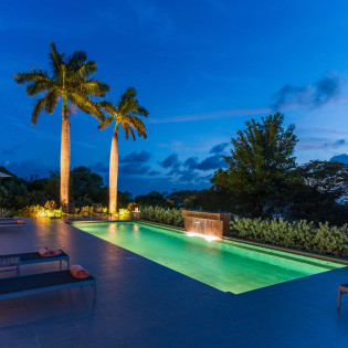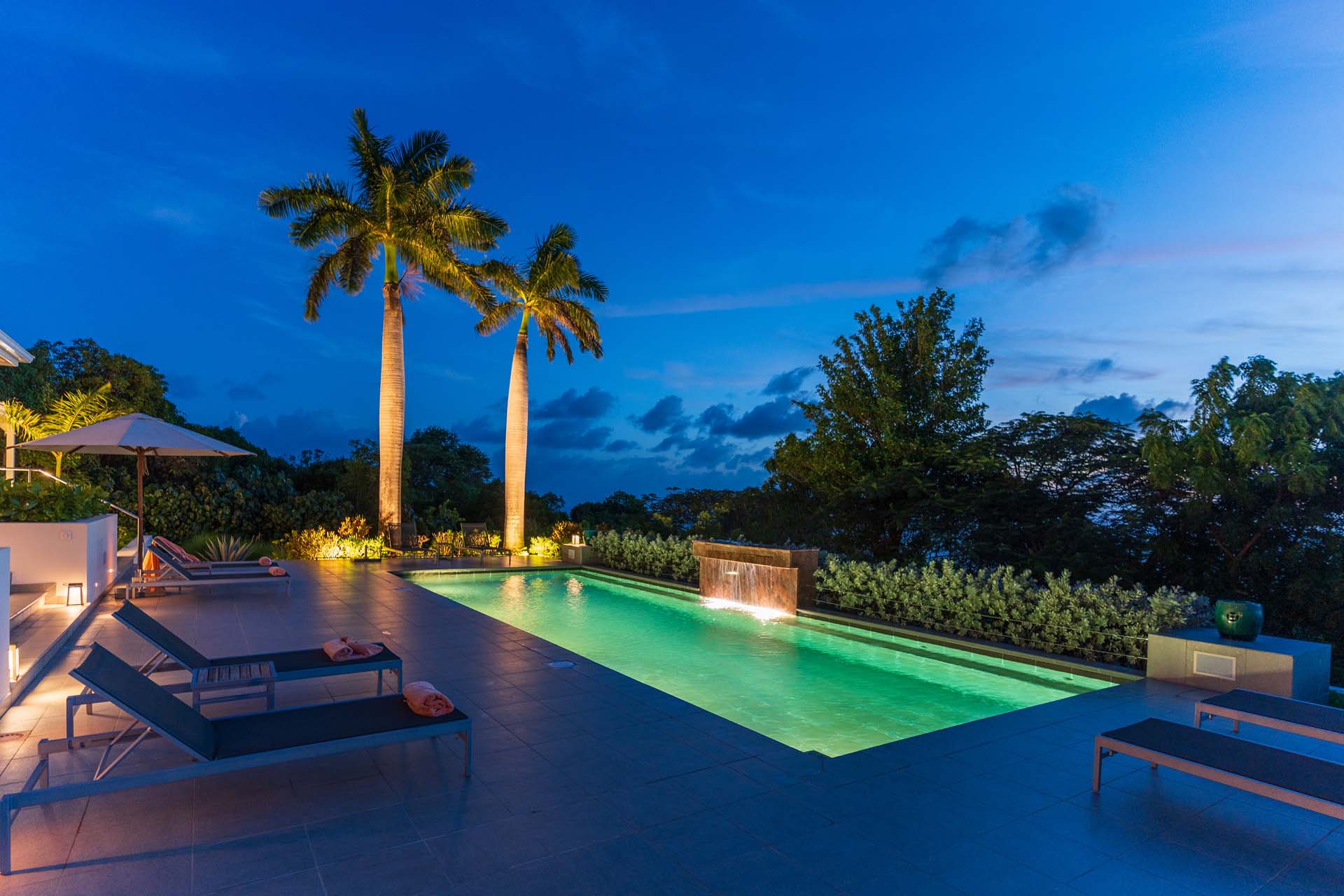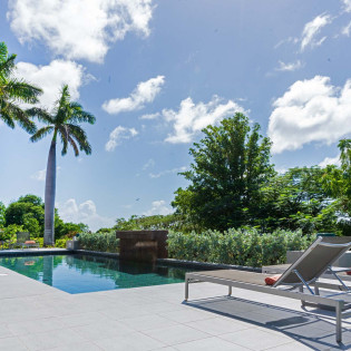 Steps lead down towards the large, heated pool, featuring a striking granite-faced waterfall. Surrounding the pool is a wooden deck furnished with plenty of loungers, letting you soak up the island sun.