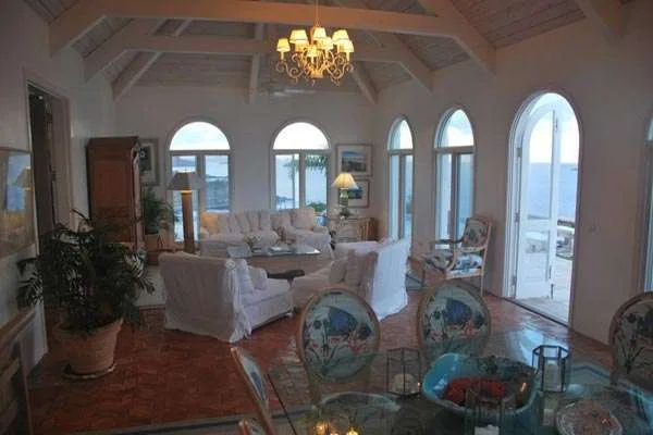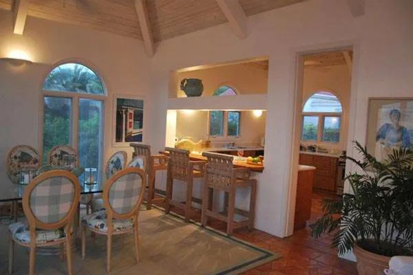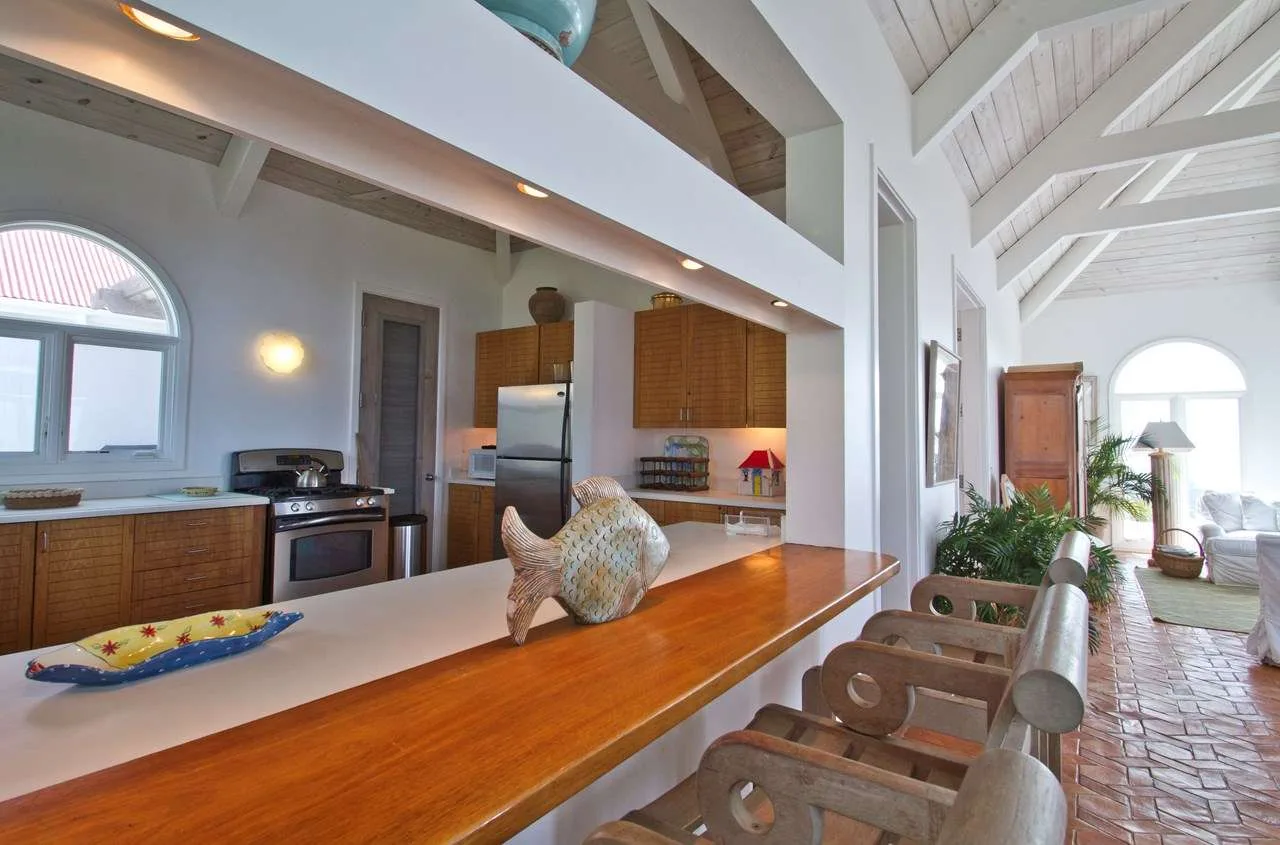 The comfortable living room has plush white sofas, inviting spots to sink in and relax. Throwing open the nearby doors lets you enjoy the ocean breezes, the ideal accompaniment to a cool island cocktail.