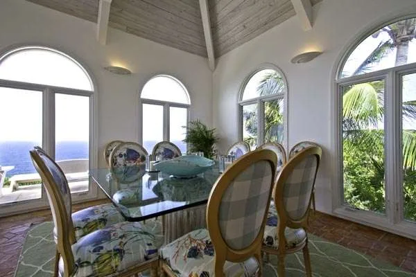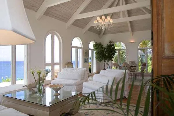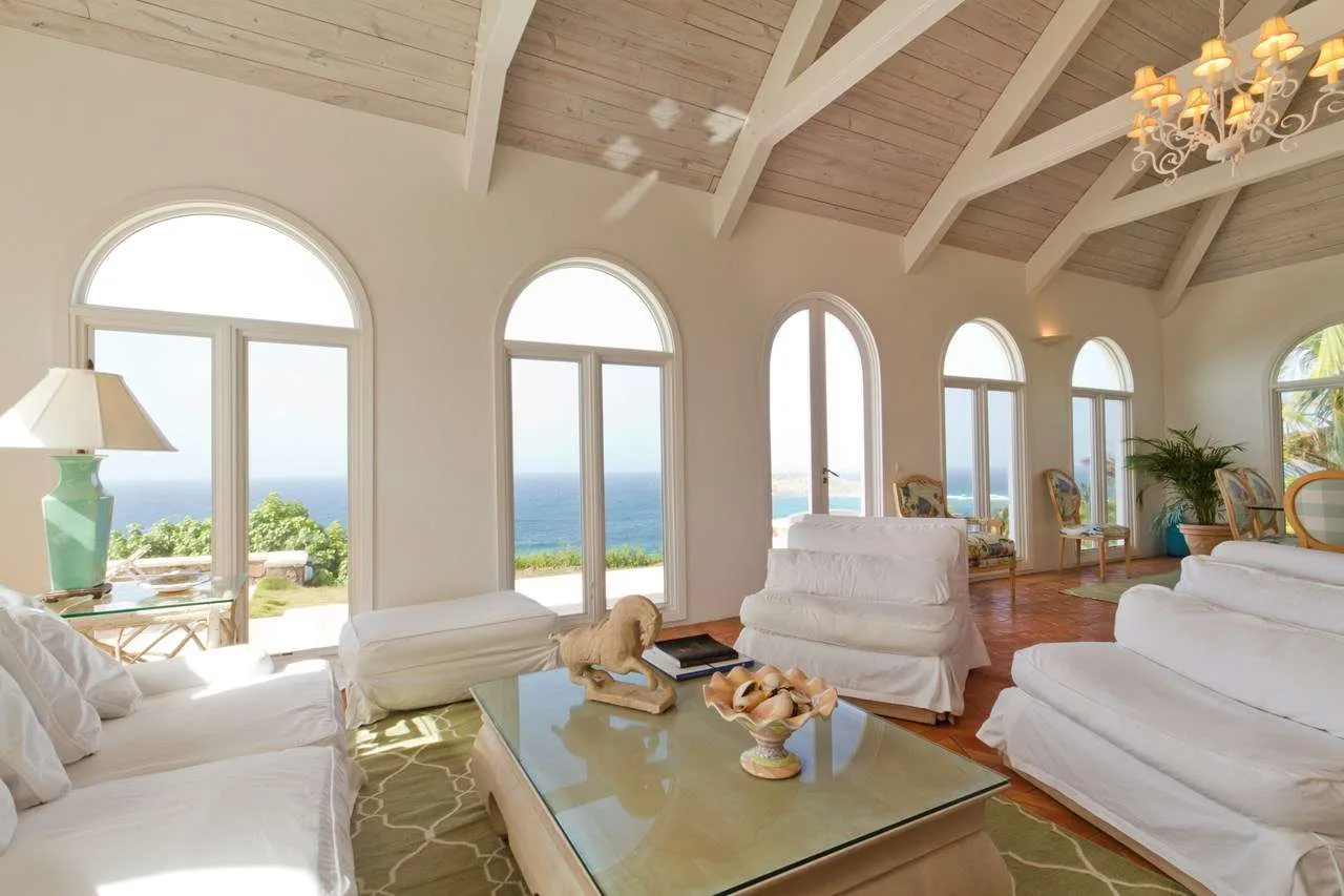 The bright and sunny great room at Villa Beverly is home to the living room, dining area, and kitchen. Vaulted ceilings capture plenty of natural light, while terracotta tiles help keep the space cool. From here, you can enjoy stunning views of the ocean and the rugged coastline of St. Barts.