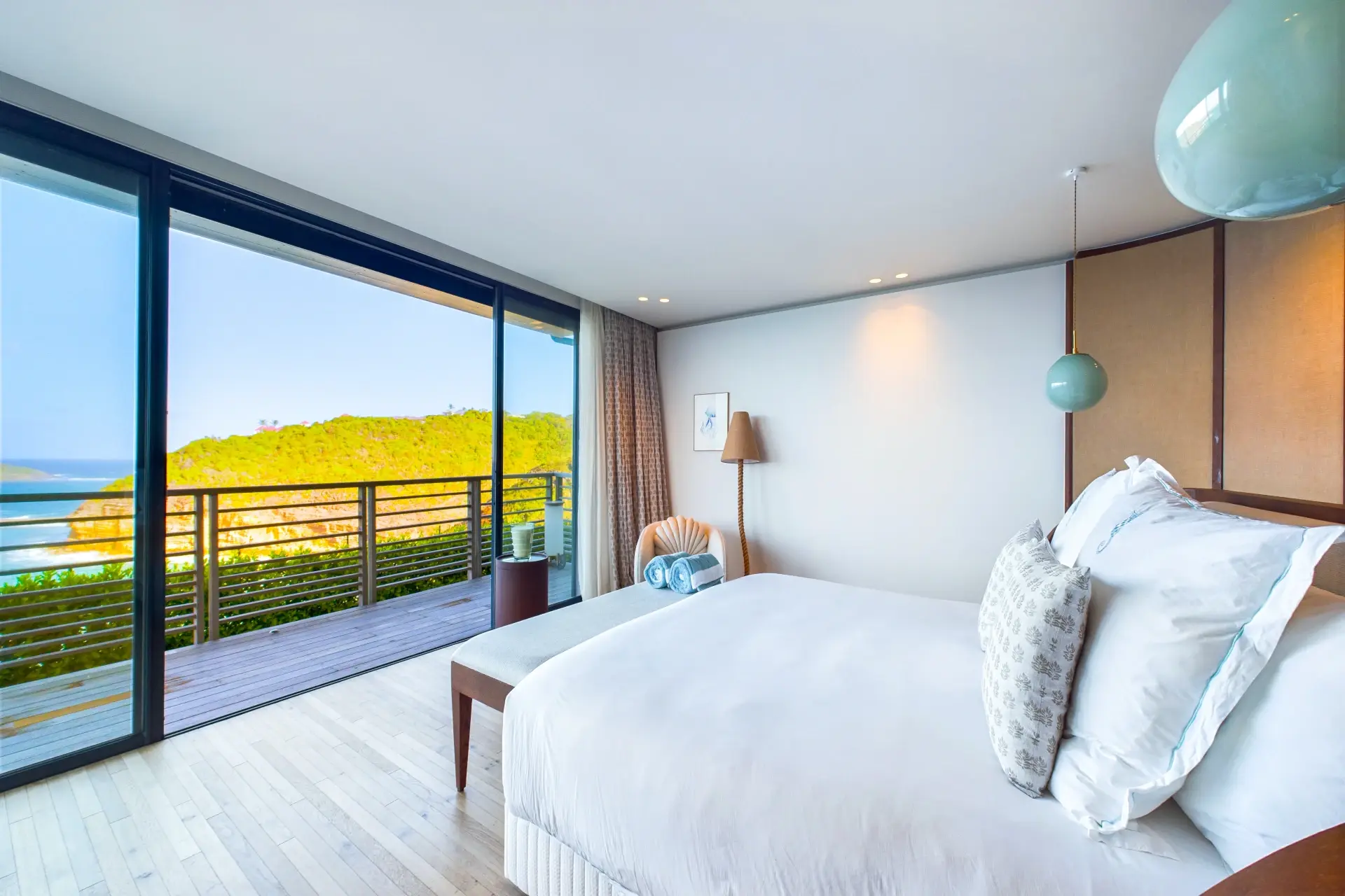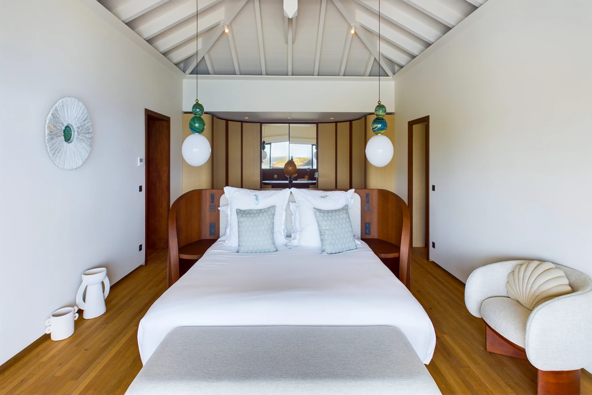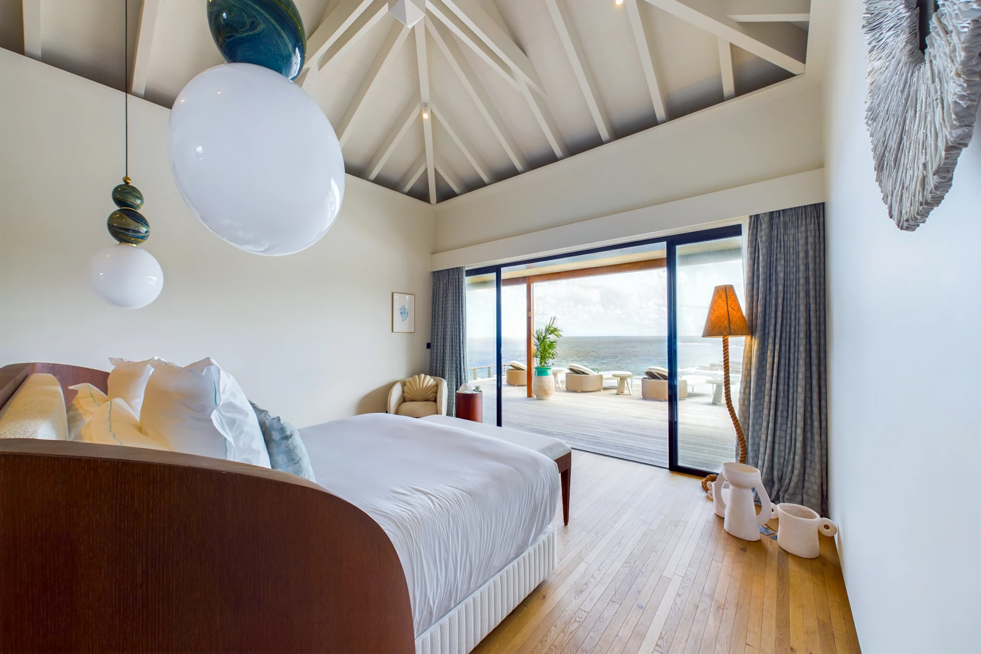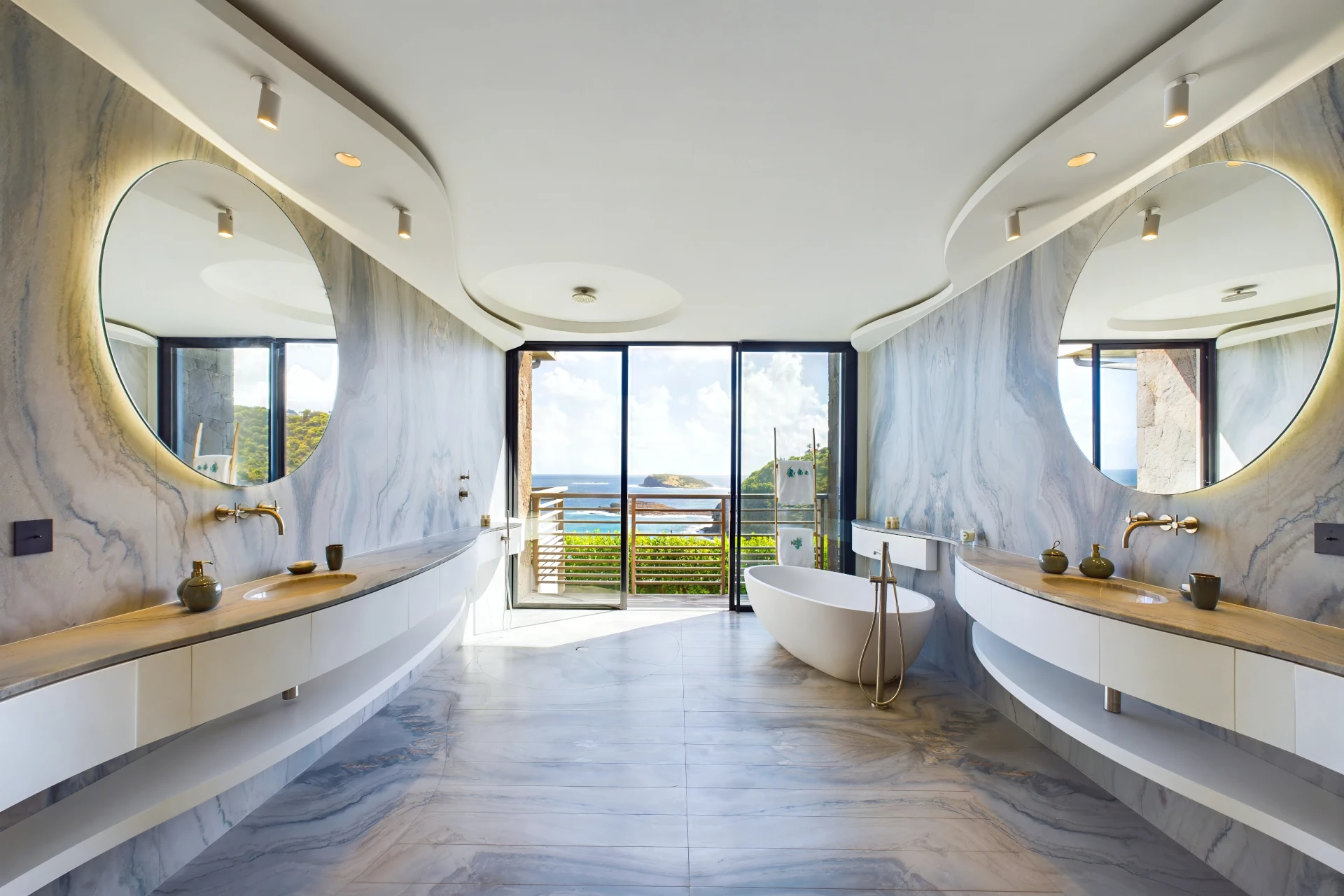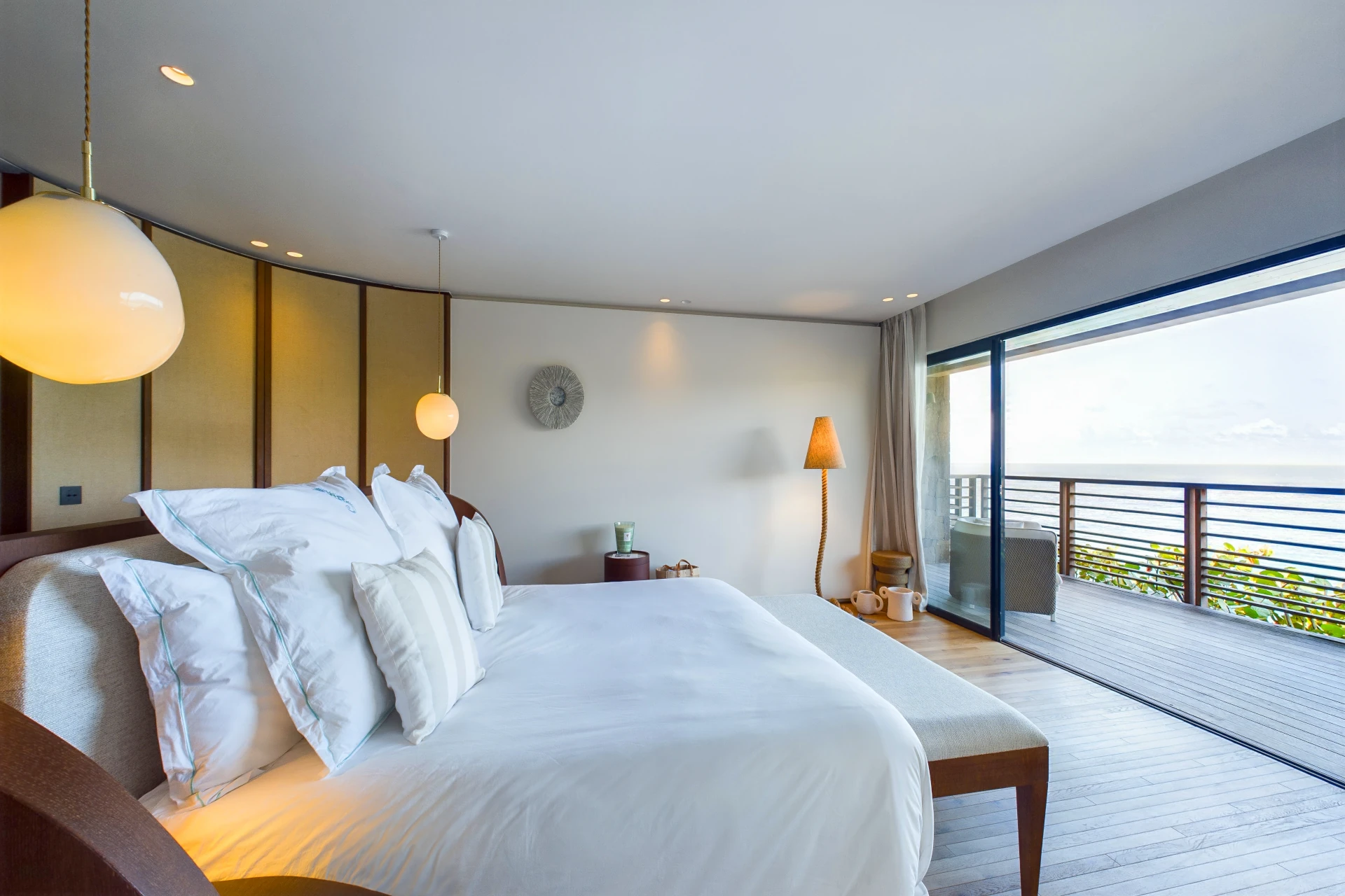 Each bedroom is an elegant retreat, with ocean or garden views, private terraces, smart TVs, walk-in closets, and ensuite bathrooms with double vanities and spacious walk-in showers. Two of the bedrooms are on the entrance level, one on each side of the living room. The master bedroom, slightly larger, features a king-size bed, a large dressing area, and an expansive bathroom.