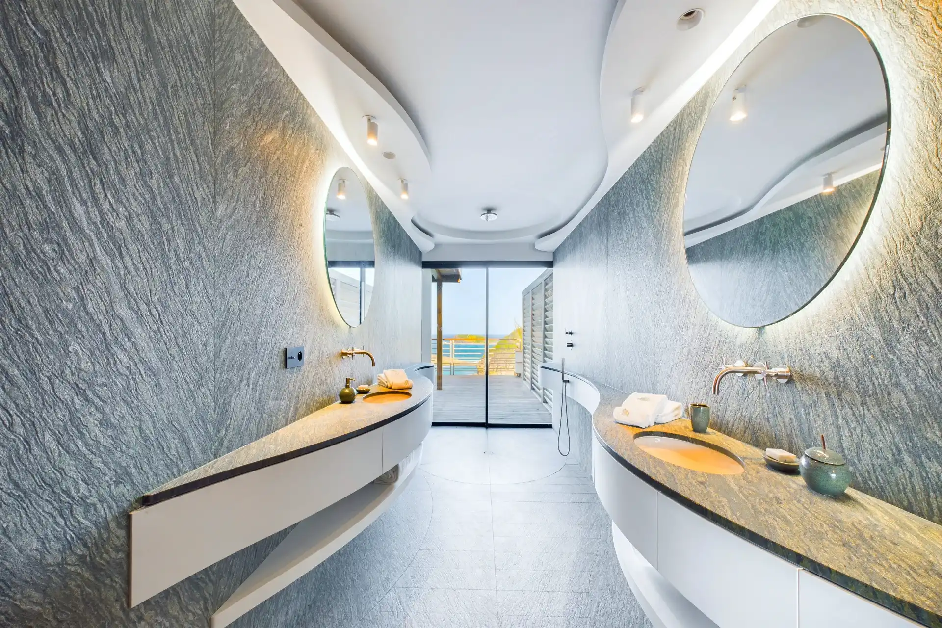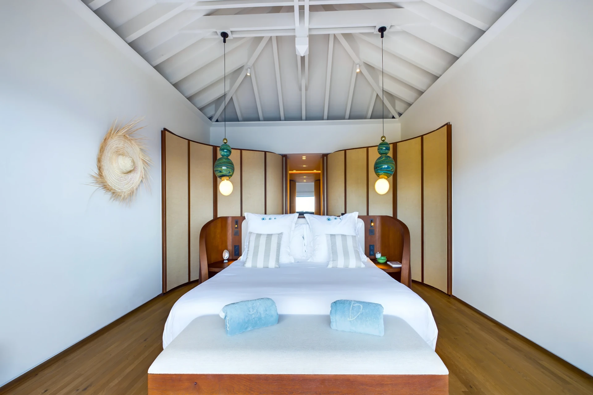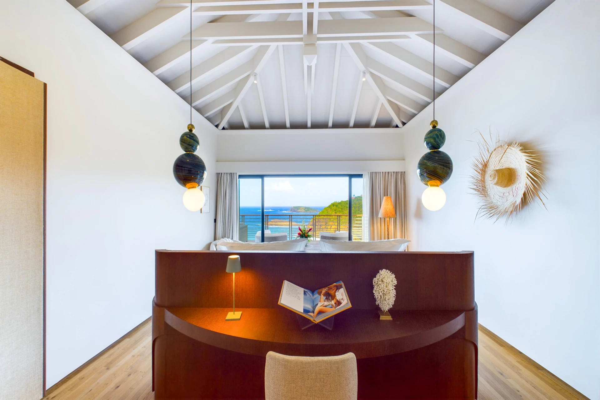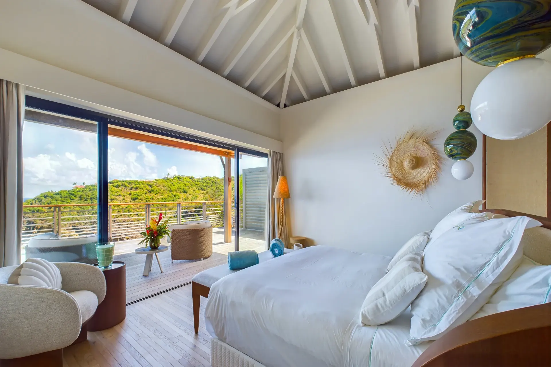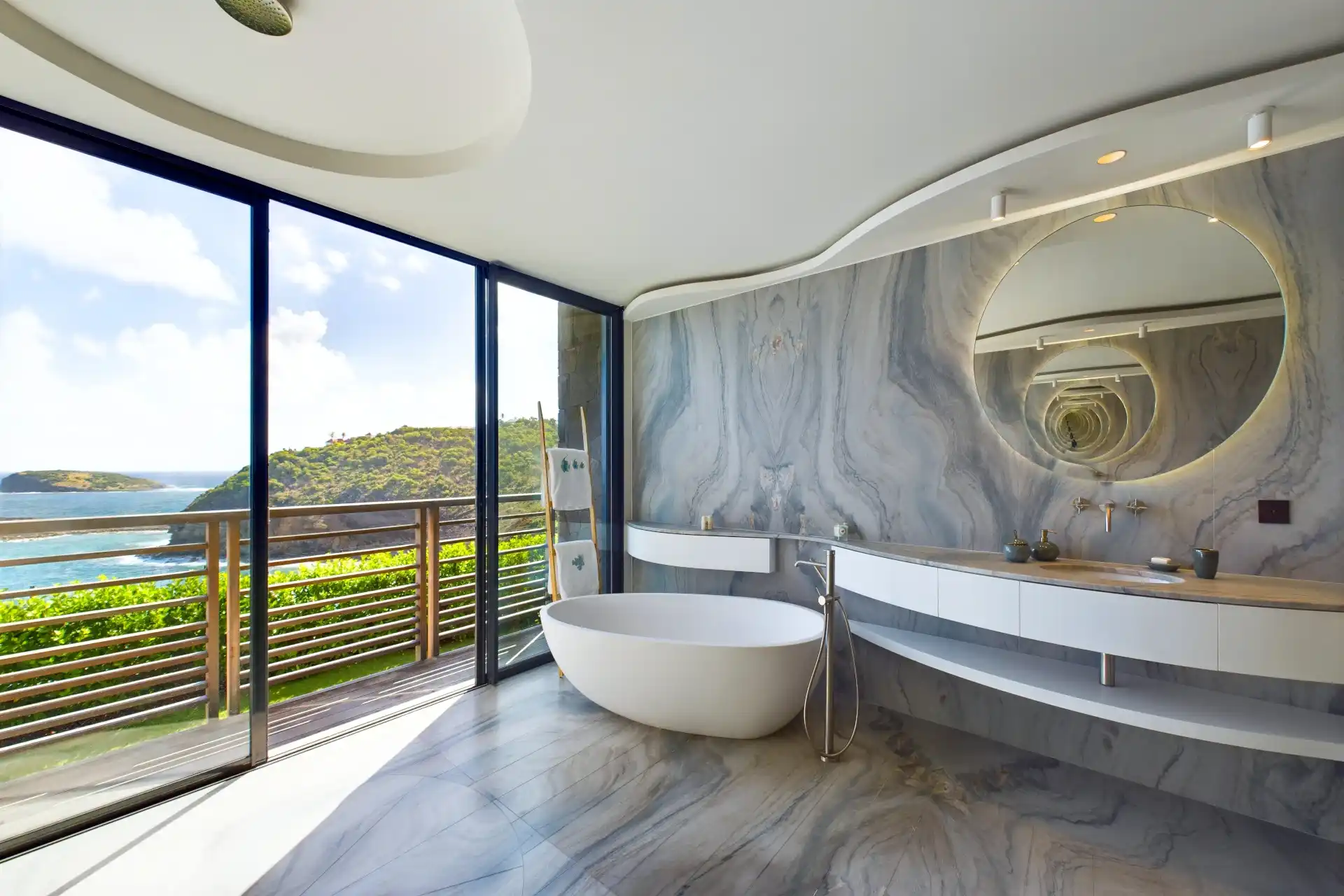 Each bedroom is an elegant retreat, with ocean or garden views, private terraces, smart TVs, walk-in closets, and ensuite bathrooms with double vanities and spacious walk-in showers. Two of the bedrooms are on the entrance level, one on each side of the living room. The master bedroom, slightly larger, features a king-size bed, a large dressing area, and an expansive bathroom.