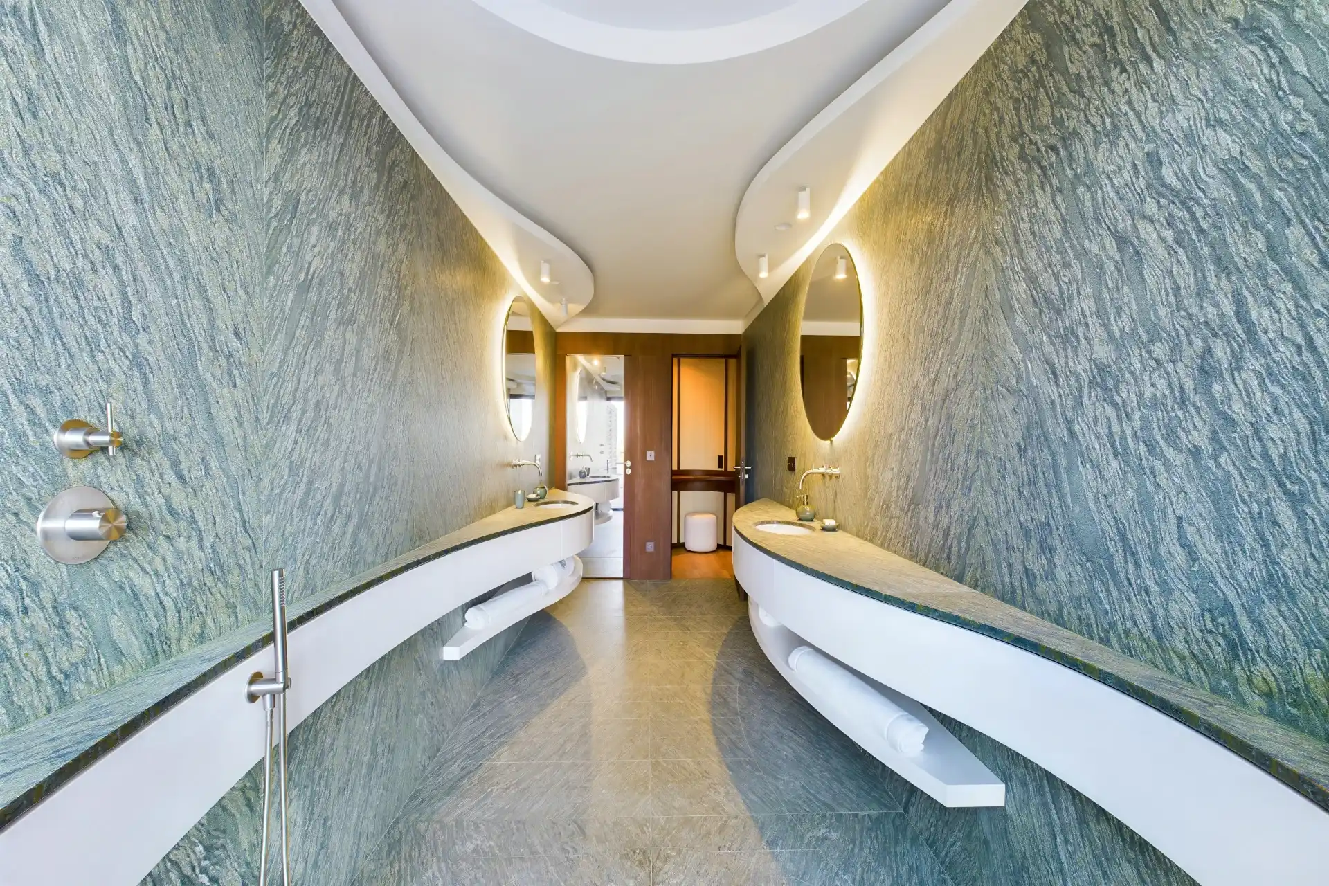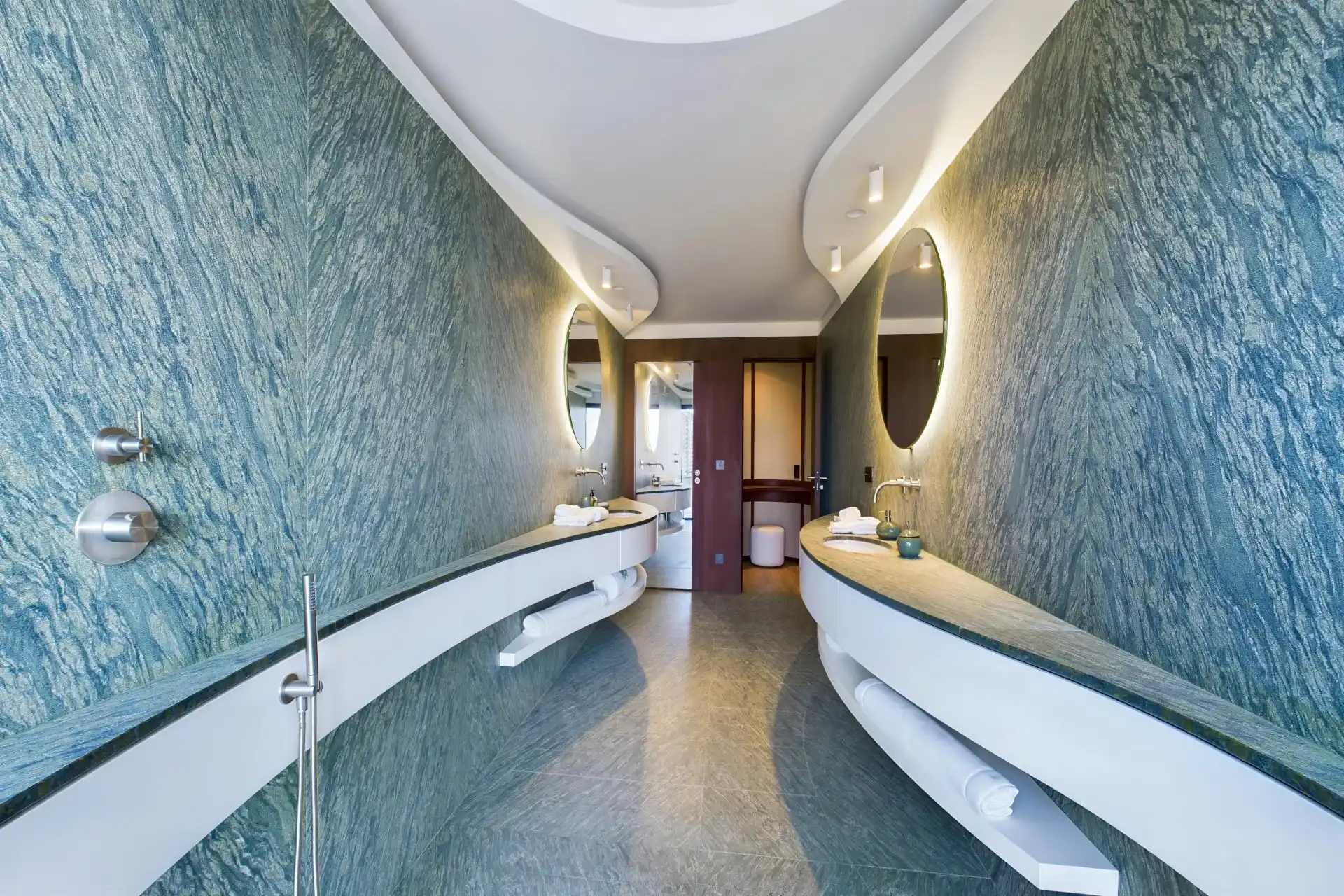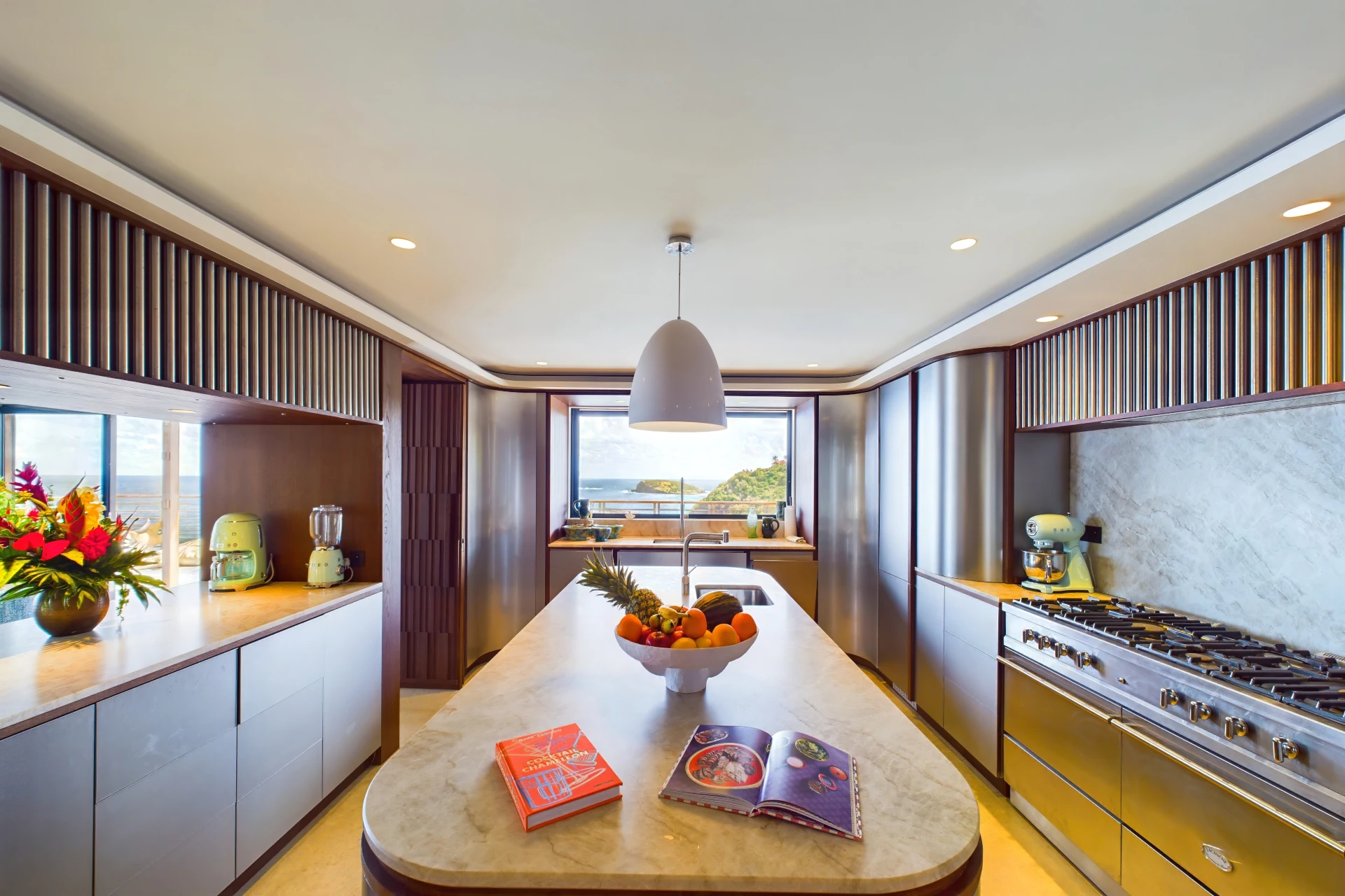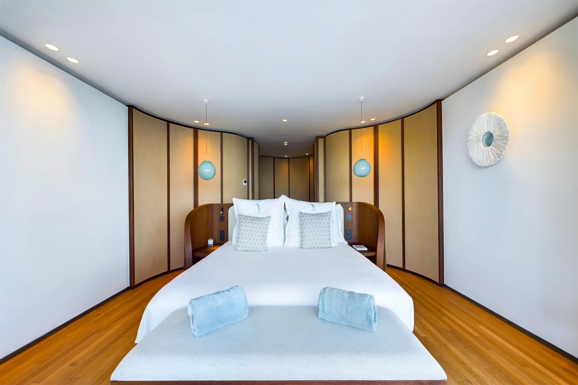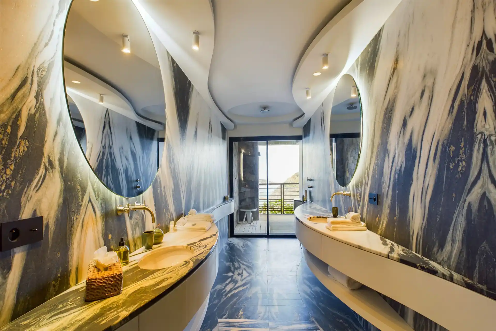 Each bedroom is an elegant retreat, with ocean or garden views, private terraces, smart TVs, walk-in closets, and ensuite bathrooms with double vanities and spacious walk-in showers. Two of the bedrooms are on the entrance level, one on each side of the living room. The master bedroom, slightly larger, features a king-size bed, a large dressing area, and an expansive bathroom.