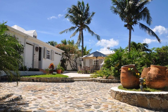 Downstairs, the two bedrooms share another outdoor dining table, this one more suited to casual meals. A small garden area has more seating options, an ideal spot to kick back with a drink, gazing out at the Caribbean. A swinging hammock in the shade nearby offers a lazy spot to read a book or drift off to sleep with the island breeze rustling the palms above.