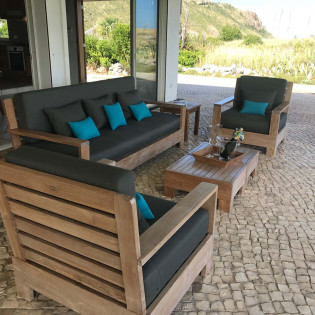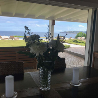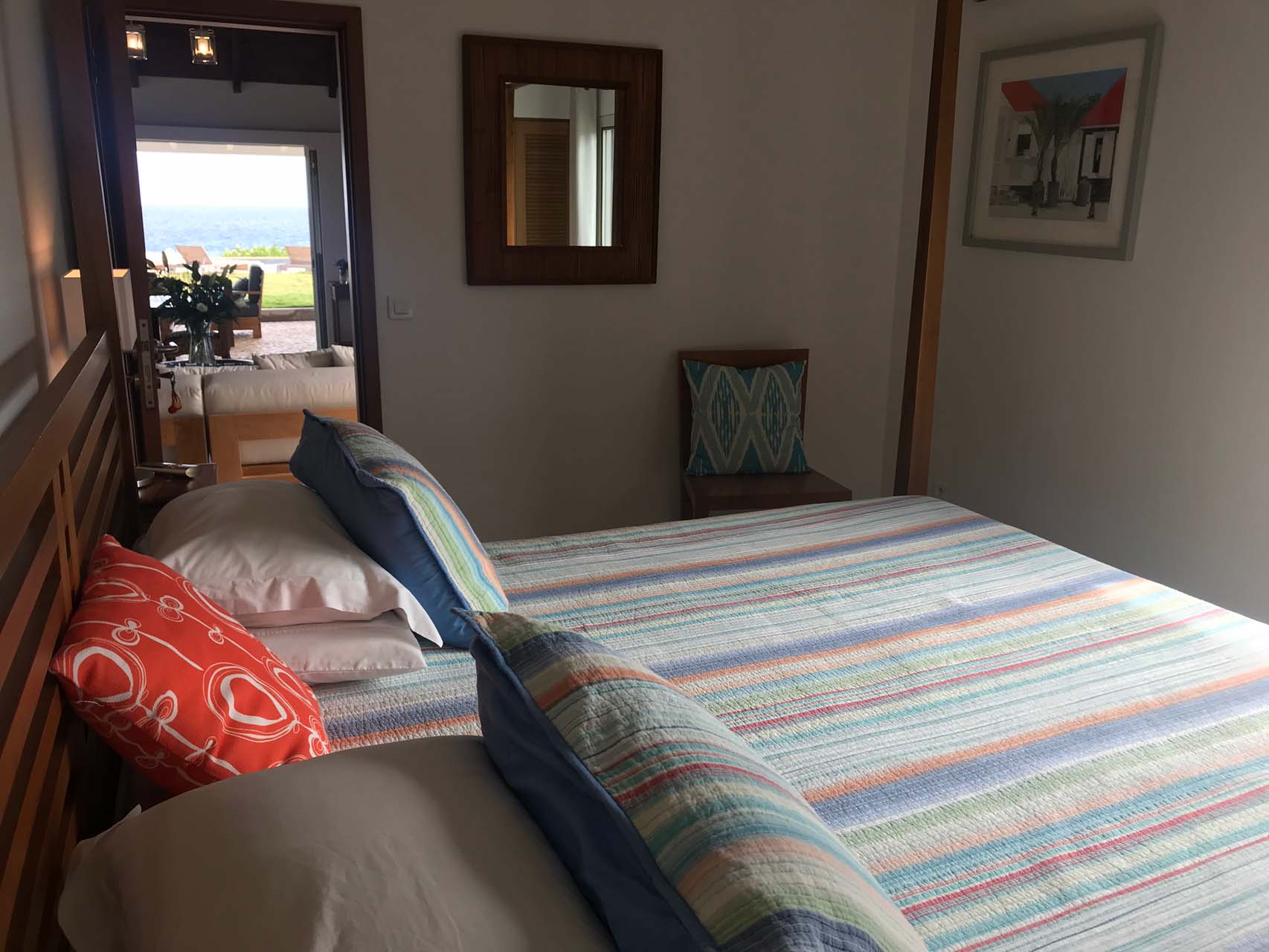 Lush, tropical gardens adorn the grounds, while the outdoor terraces are laid with Portuguese stones. Loungers surround the large swimming pool facing the ocean view.
