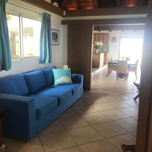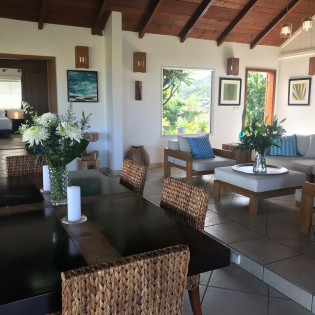 The living room is brightly decorated with colorful furnishings and opens to the covered outdoor dining area, which comfortably accommodates 6 guests. A breakfast bar with stools separates the well-equipped kitchen from the indoor dining area, which accommodates 8 people.