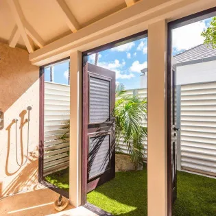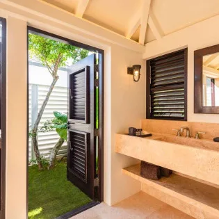 The master bungalow is at the far end of the property. This spacious room enjoys a dressing room, a large ensuite with a shower that opens to the outside, and an outdoor seating area in the rear.