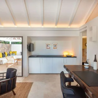 Between the kitchen and living room is a long, wooden dining table, the ideal spot for elegant meals in the villa. You could also whisk your plates outside, where a second table lets you pair your meal with the cool island air and the stunning views.