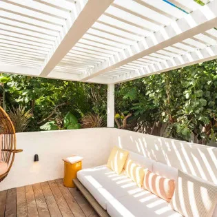 The main house opens to the large, covered terrace, a shady and cool spot to relax during the heat of the day. Next to the dining table is an outdoor living area, with comfortable benches lined with plush cushions. This semi-enclosed area has wooden louvers that can close off on winter days, creating a cozy and private atmosphere.