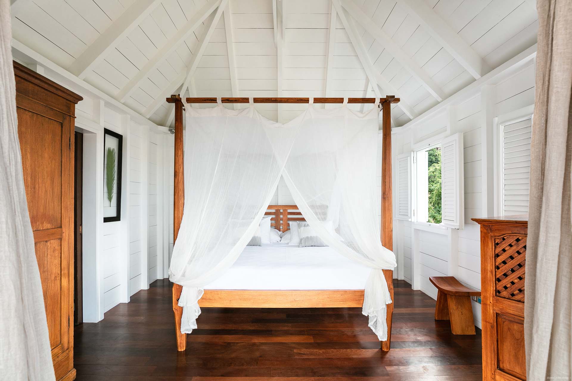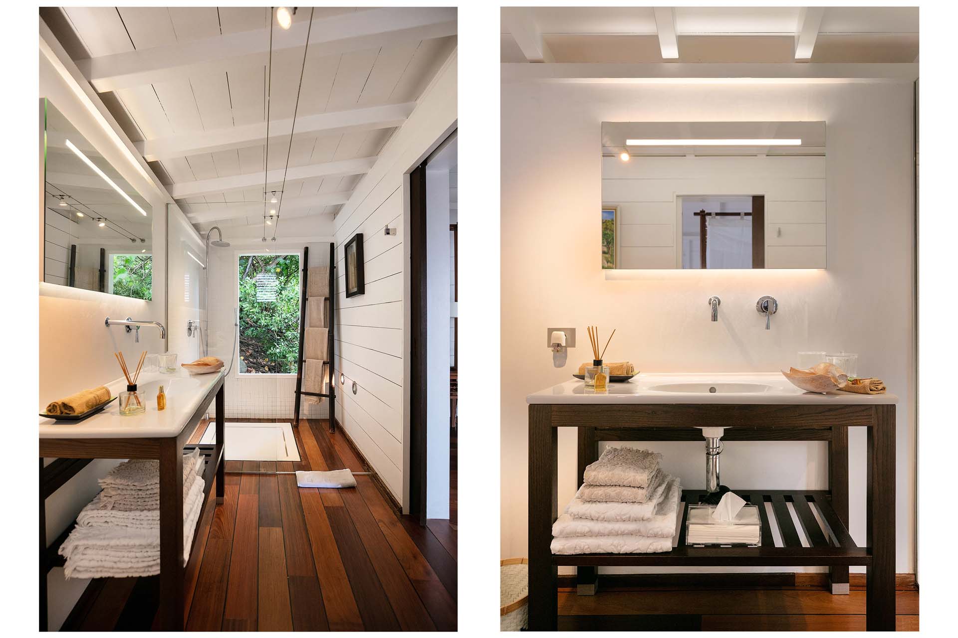 The bedrooms at Villa Casa Roc are spread across the home to provide privacy and quiet between guests. The master bedroom is behind the living room on the main floor, with a lavish king-sized bed and an ensuite bathroom with an indoor and outdoor shower. The second bedroom is located on a lower level and is slightly smaller and has a king-sized bed and ensuite bathroom with a shower. The third bedroom is in a separate bungalow with a king-sized bed, an ensuite bathroom with a shower, and a quiet terrace.