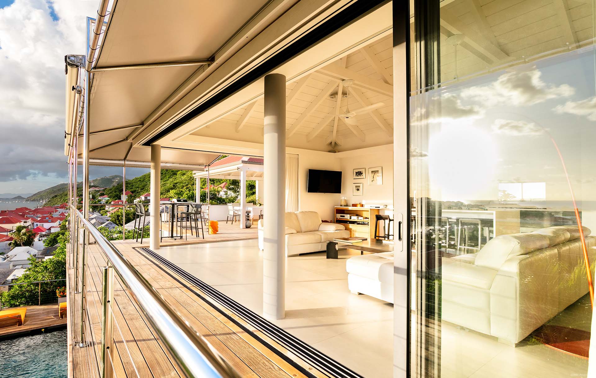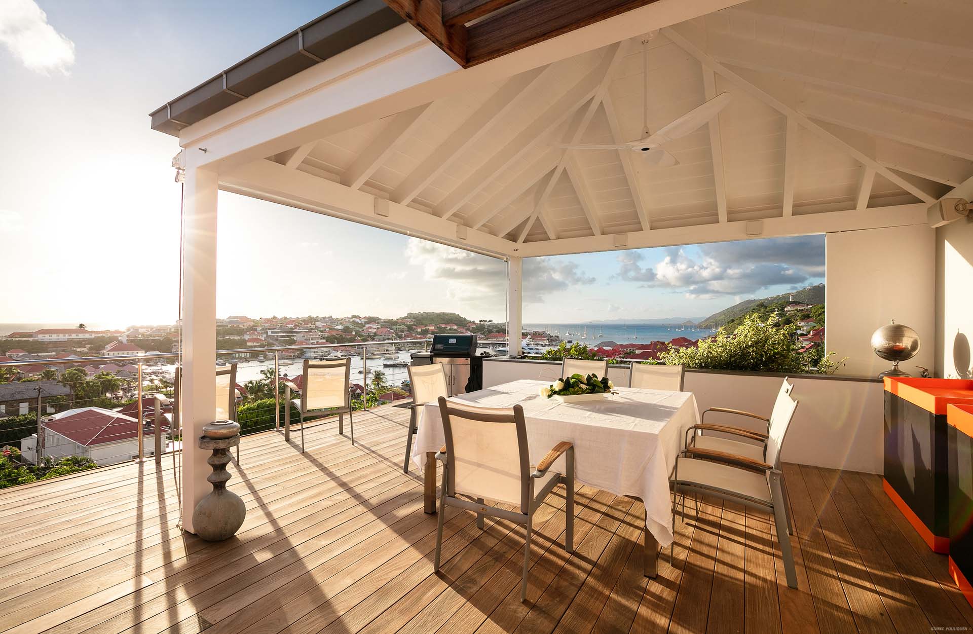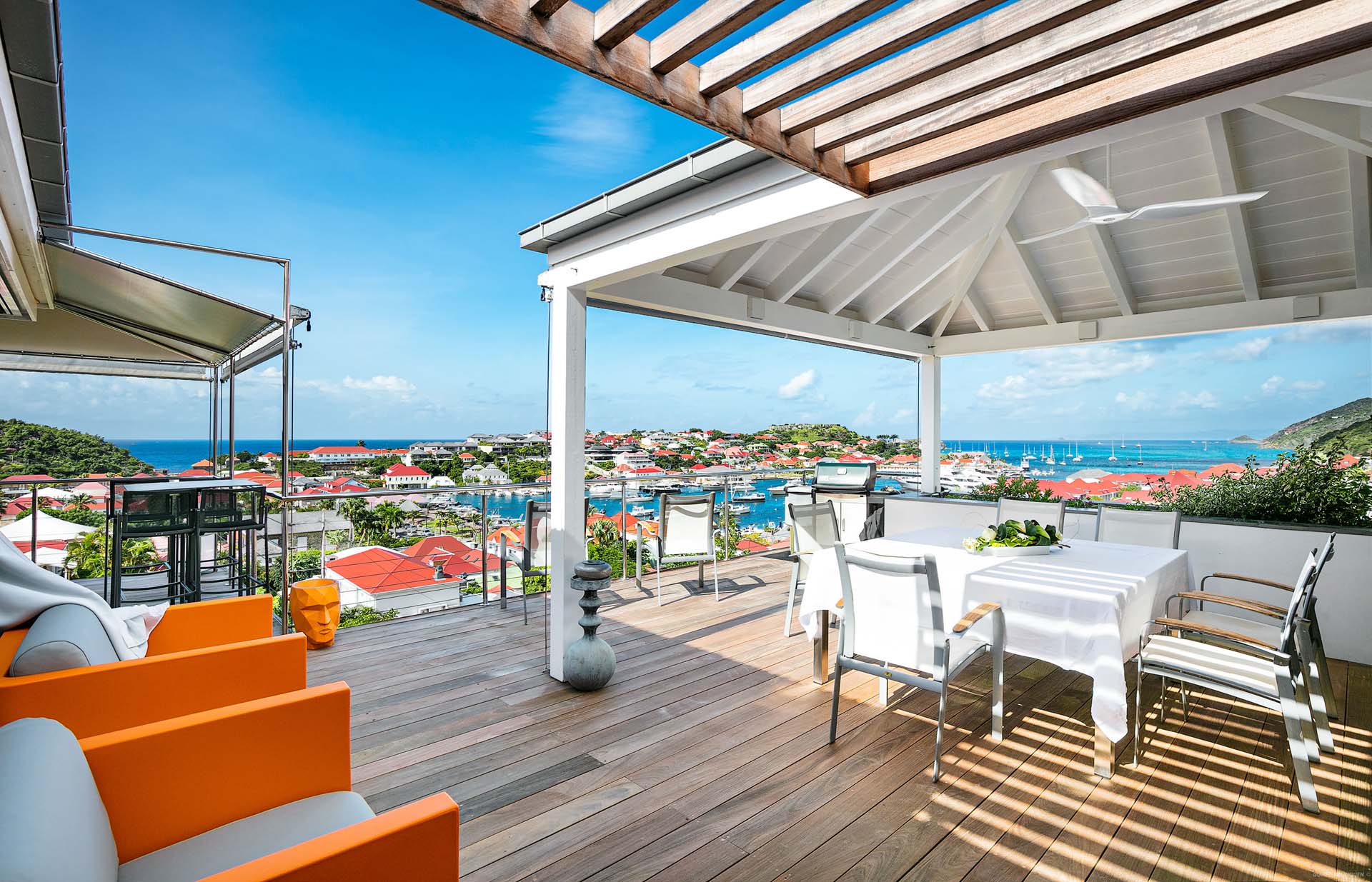 On the main level, the spacious terrace enjoys the best views in the home. Next to the dining table is a nice spot for a cocktail at sunset, watching as the shimmering golden hues fall across the red roofs of Gustavia below.