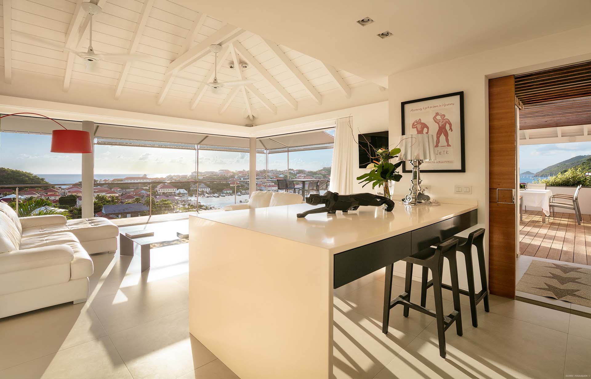 The breakfast bar itself is a great location for your morning coffee, gazing out at the shimmering ocean. For more formal meals, there’s a fantastic dining table on the covered terrace, letting you dine while perched above the bustle of Gustavia.
