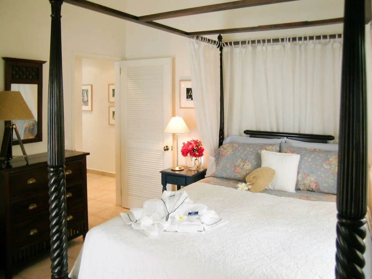 The master bedroom features an ensuite bathroom and direct access to the pool terrace, letting you start each day with an easy swim in the pool. The second bedroom comes with access to a bathroom across the hall. Both rooms have a four-poster, queen-sized bed.