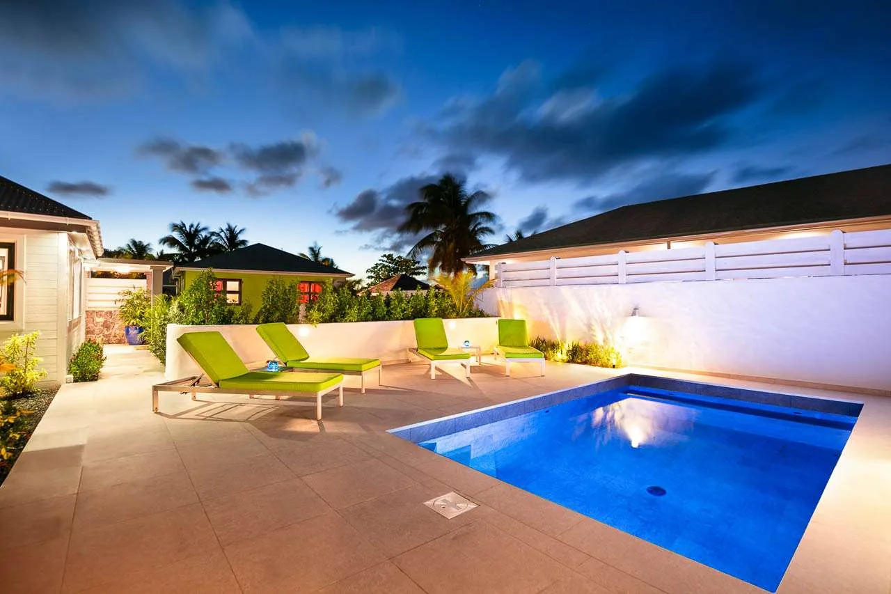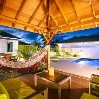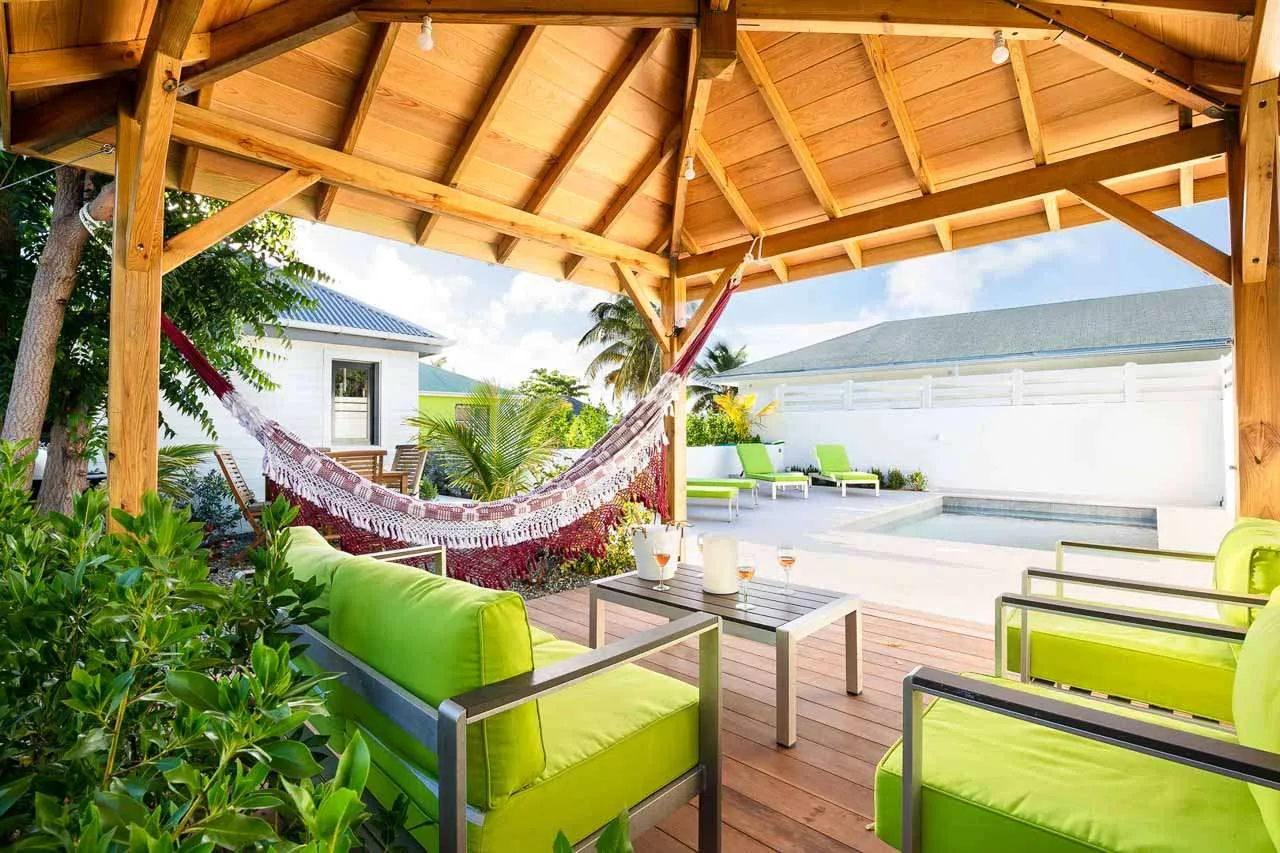 The outdoor living space at Villa Caza Lili is a cozy garden with a pool. You’ll be tempted to lounge outside here all day, enjoying the island sun between dips in the refreshing water. There are loungers for sunbathing, but also a shady gazebo with a lazy, swinging hammock.