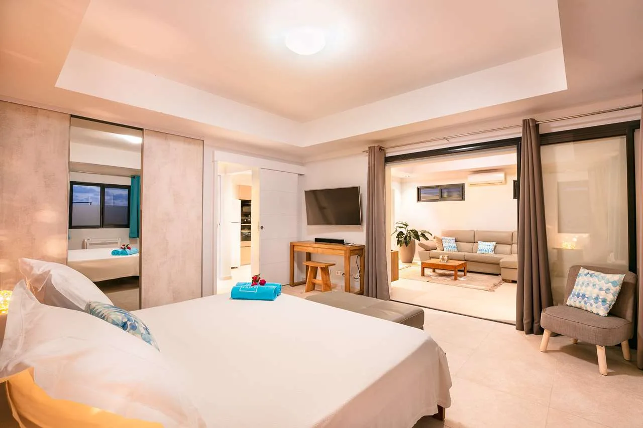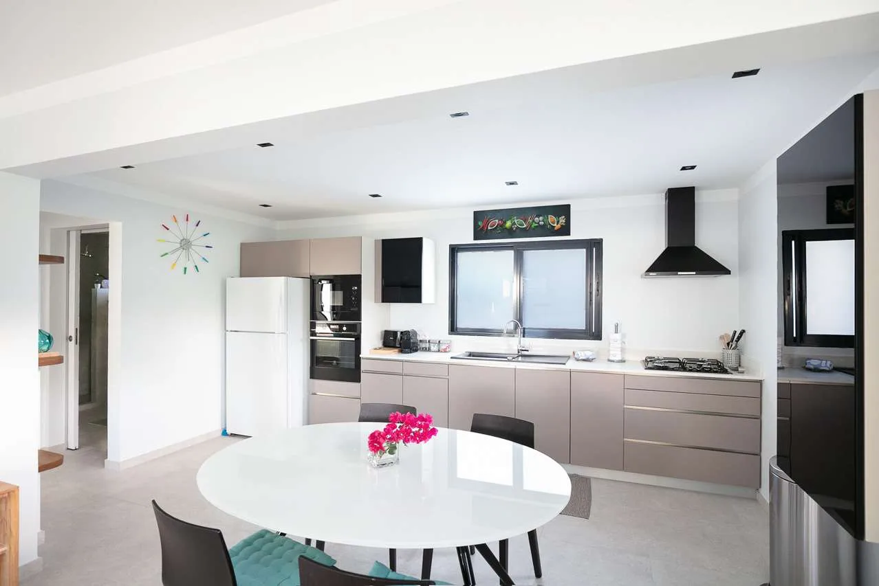 The well-equipped kitchen at Villa Caza Lili sits against one wall, with contemporary gray cabinetry and basalt-black appliances. If you’re eating in, there’s an indoor dining table that seats up to four guests, separating the kitchen from the living room.