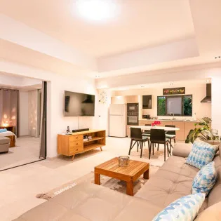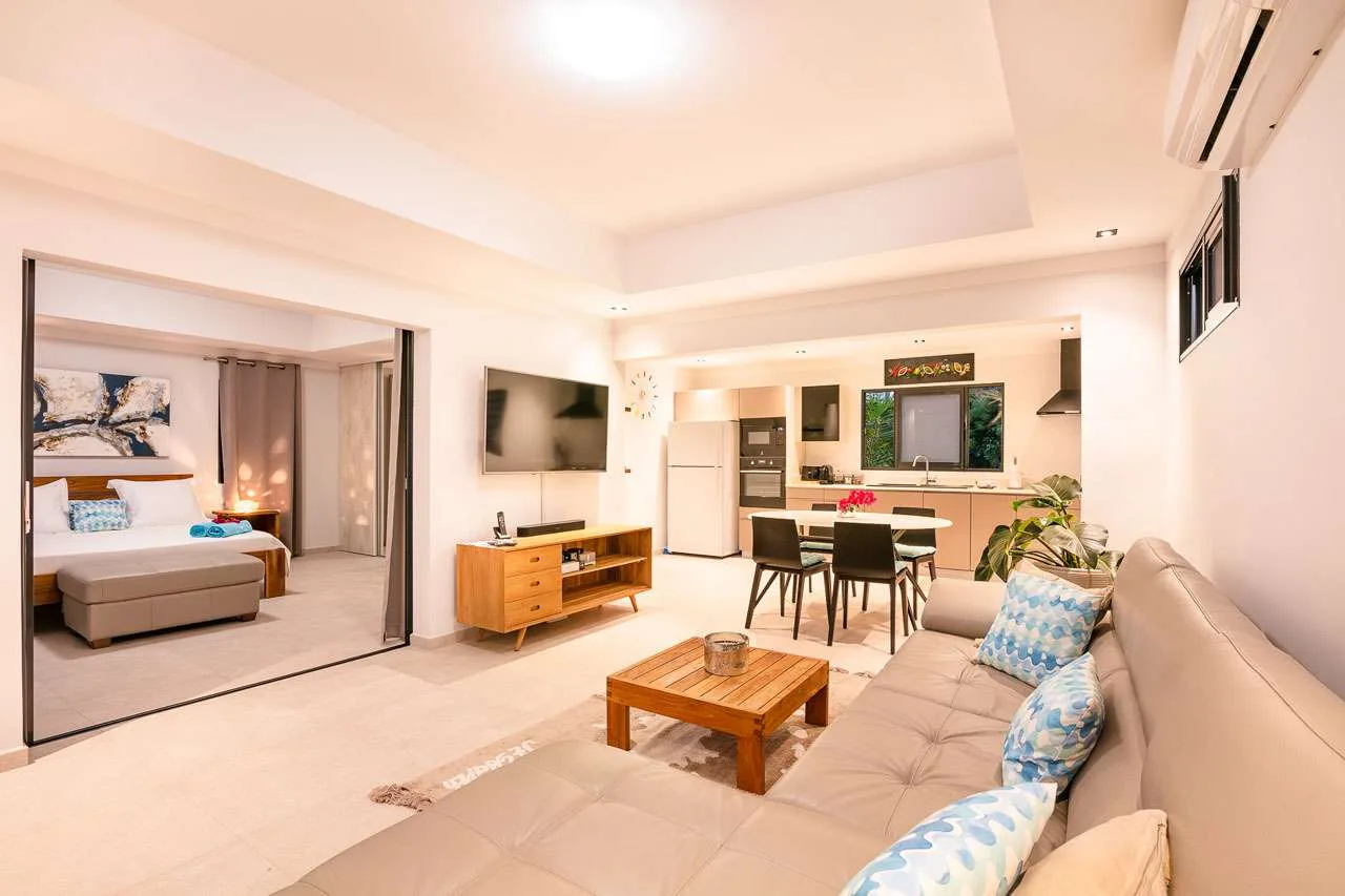The villa can be fully air-conditioned or opened to the breezes, and there are screens all around to keep the bugs out. The main room includes the living room, dining area, and kitchen in an open-plan layout.