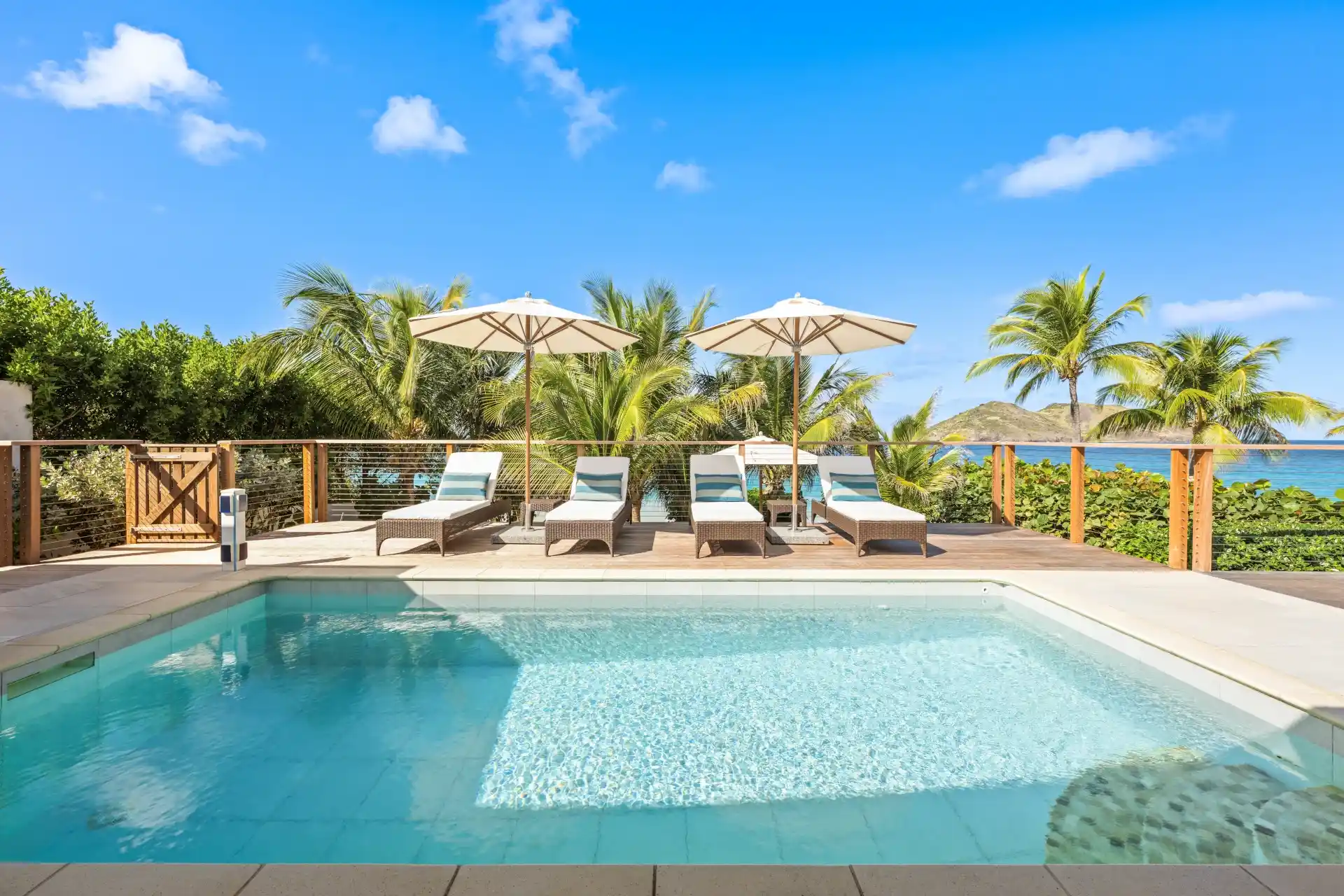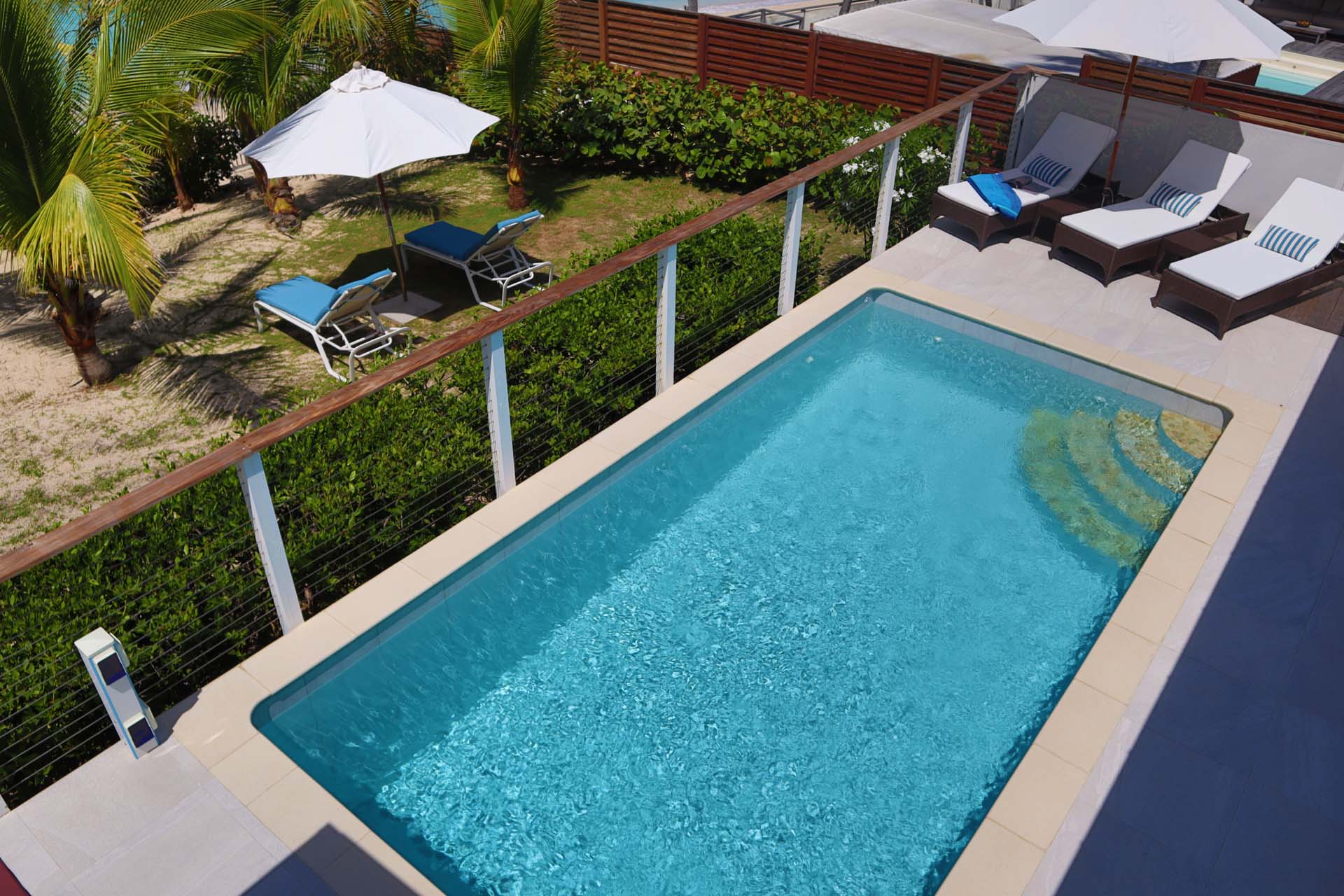 As you step outside Celina Villa, the inviting swimming pool is an ideal spot to cool off during the day. A mermaid sculpture is eye-catching; otherwise, it’s all about the ocean views.