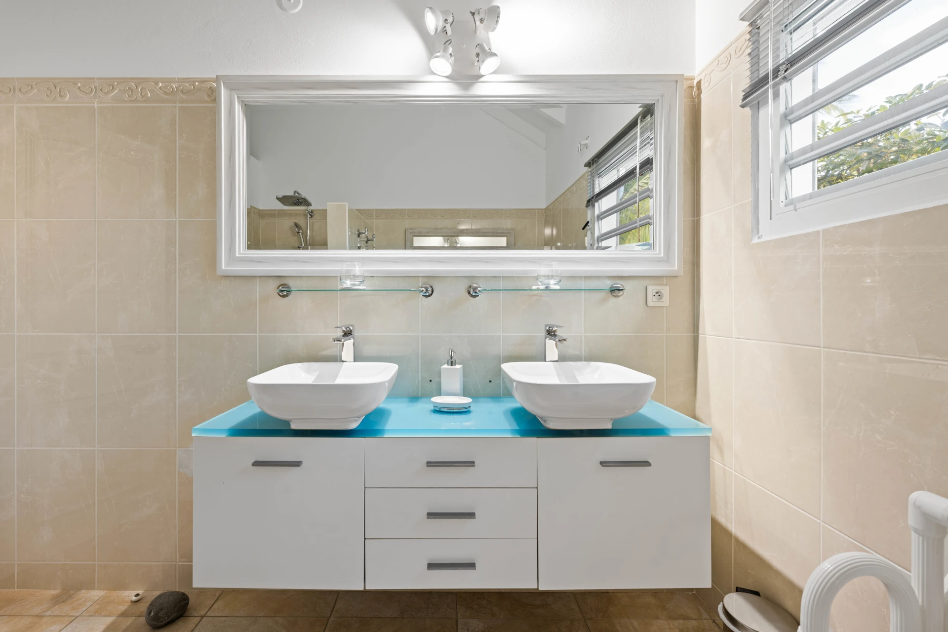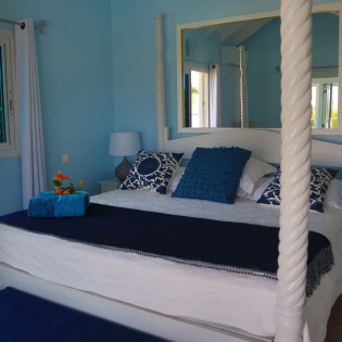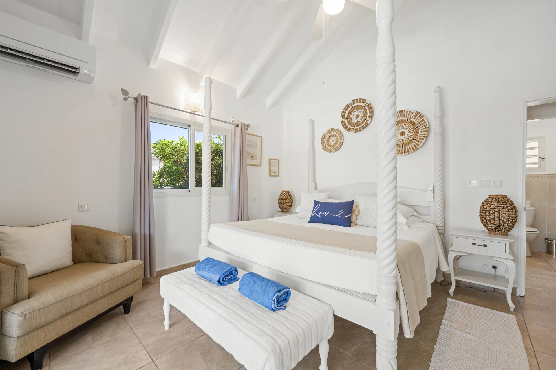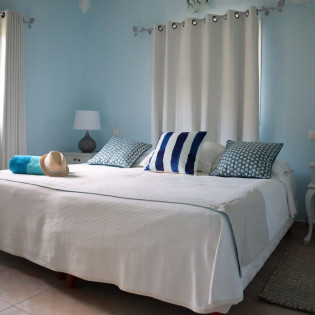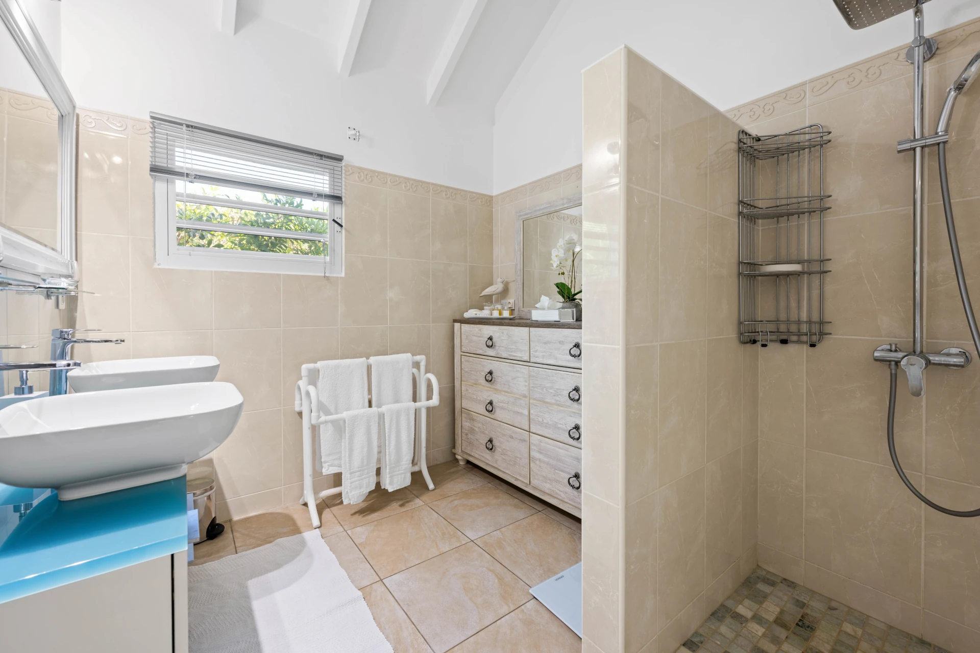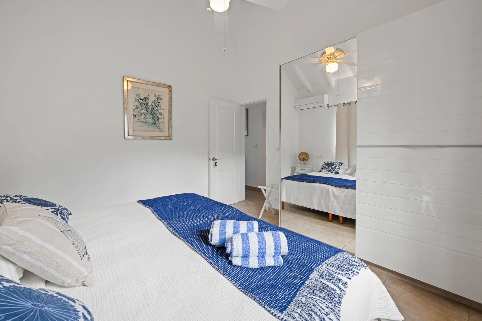 The bedrooms at Villa Celina, each a peaceful retreat one with a king-sized bed and one with a king that can be split into 2 twins both promises a great night’s sleep. With soft linens and the same calming ocean-blue color scheme, recharging here is easy. Both bedrooms share a bathroom.