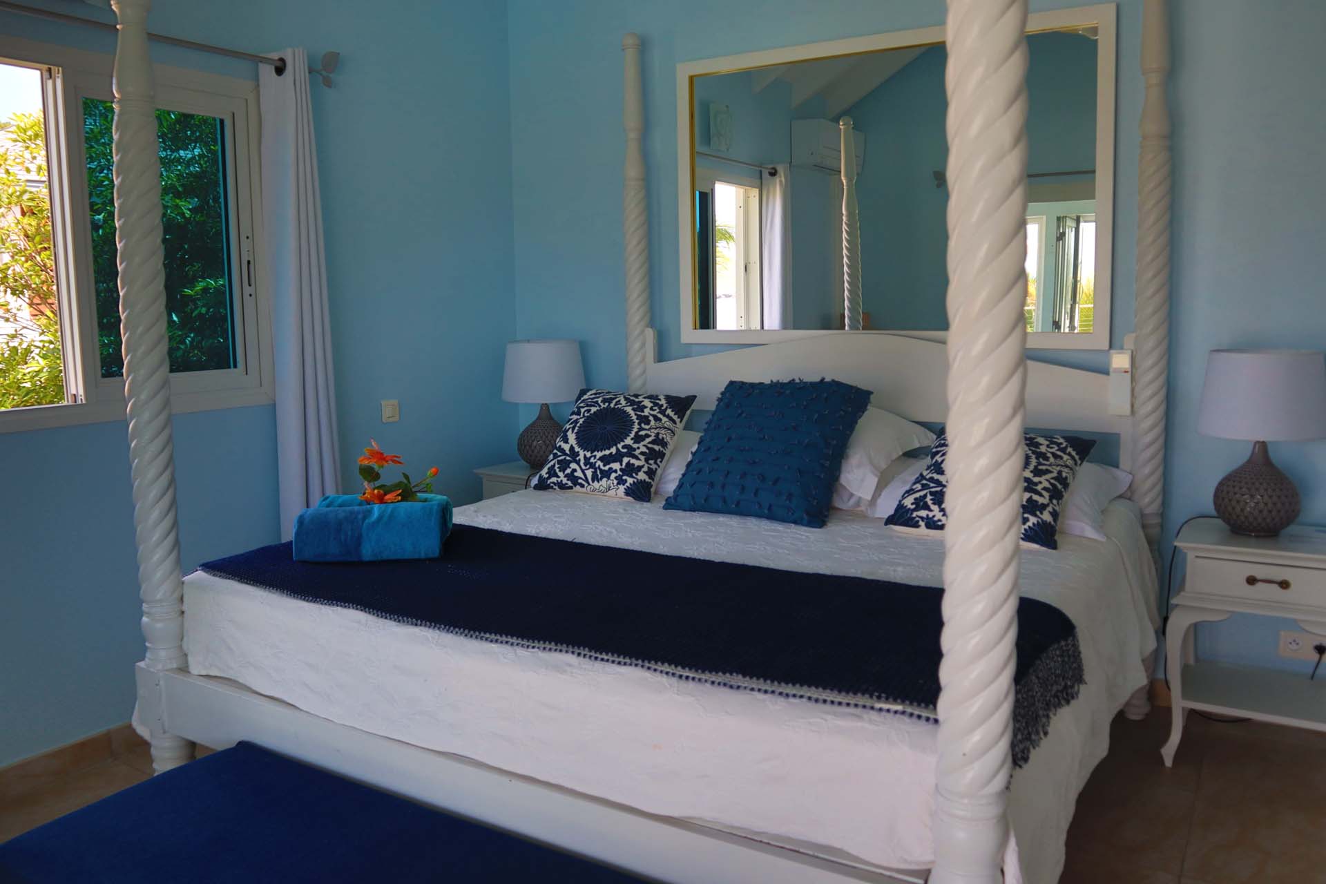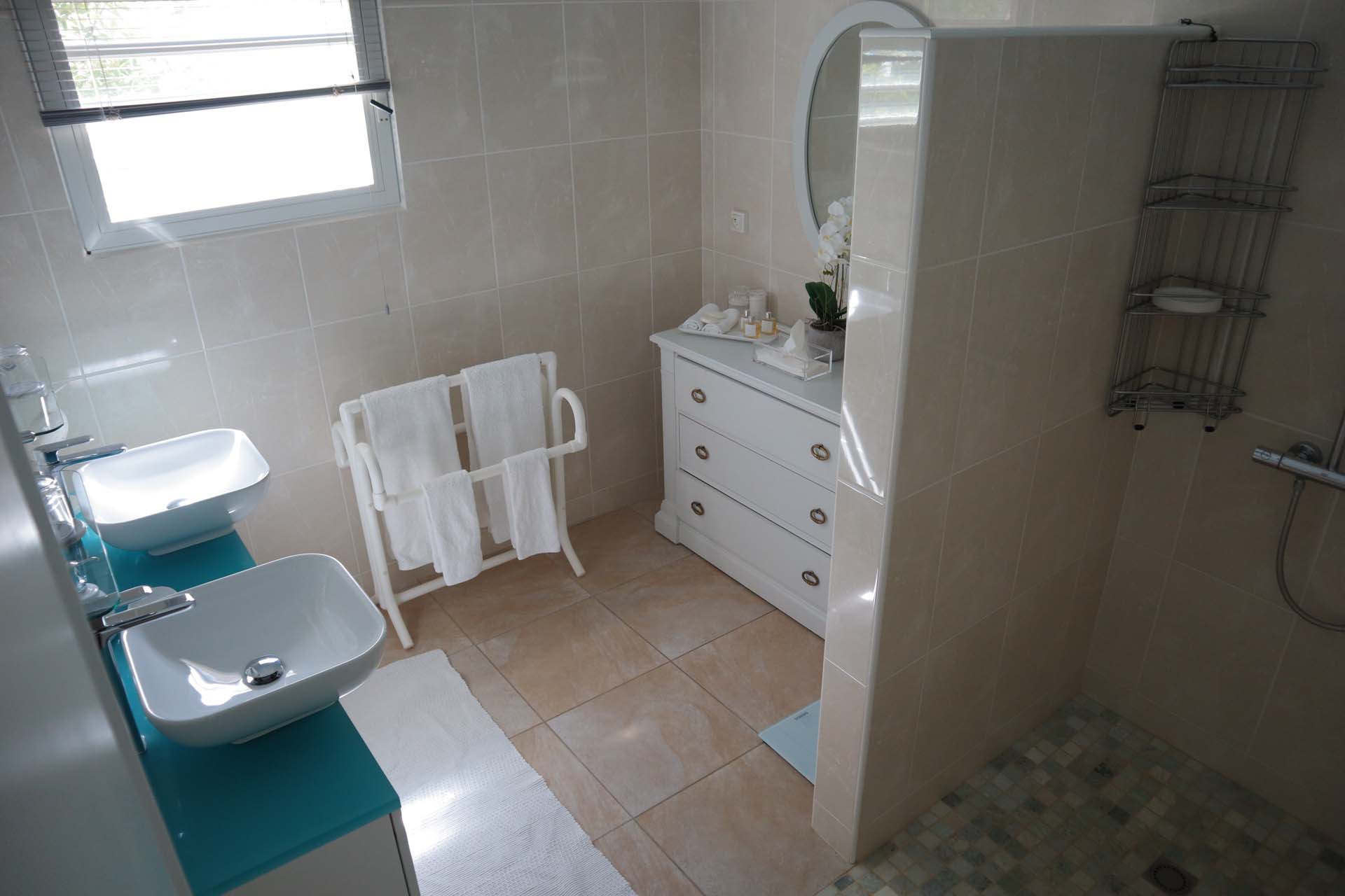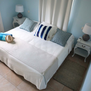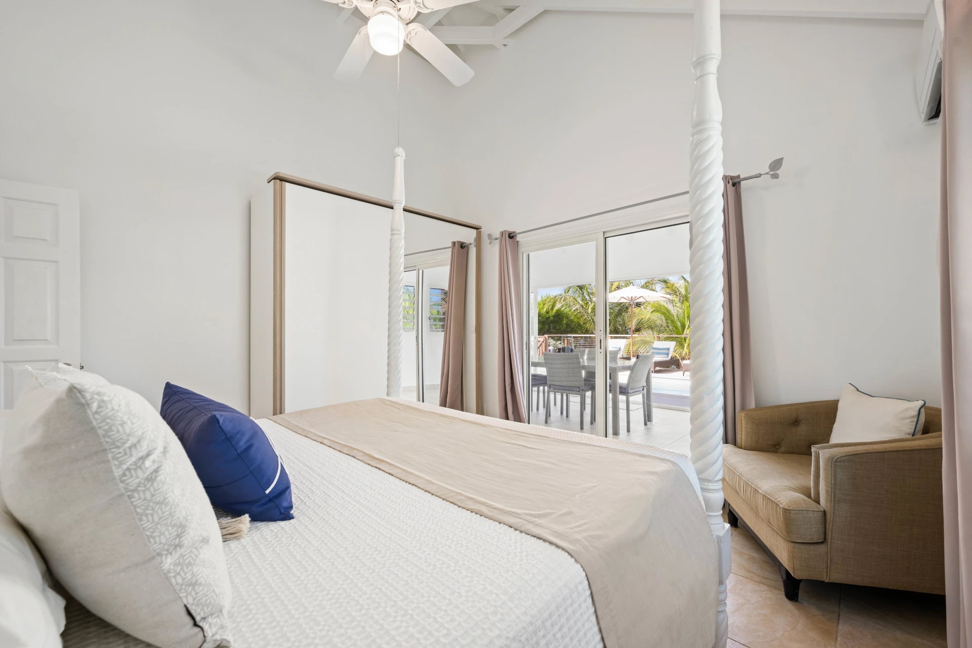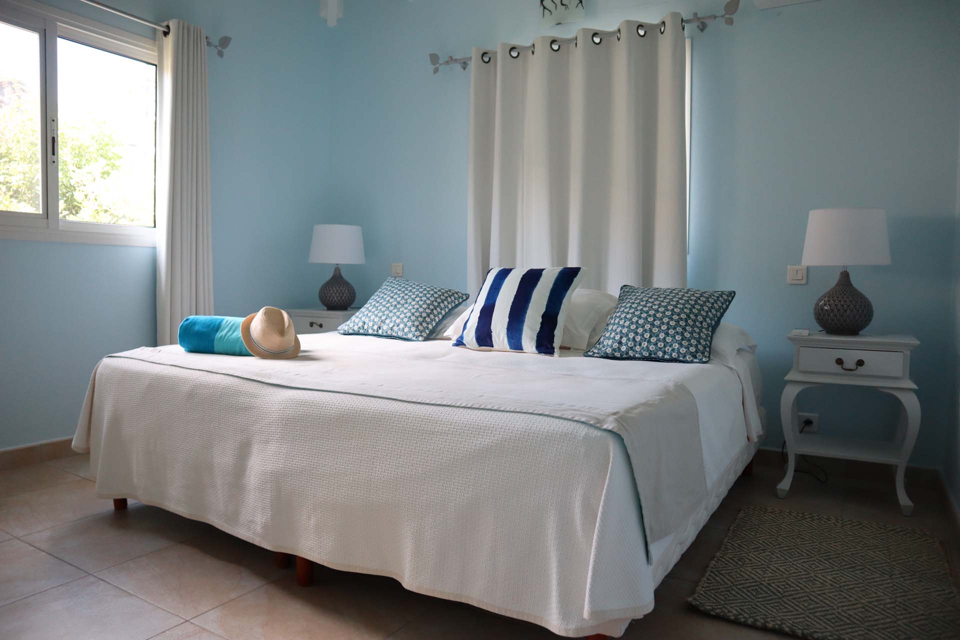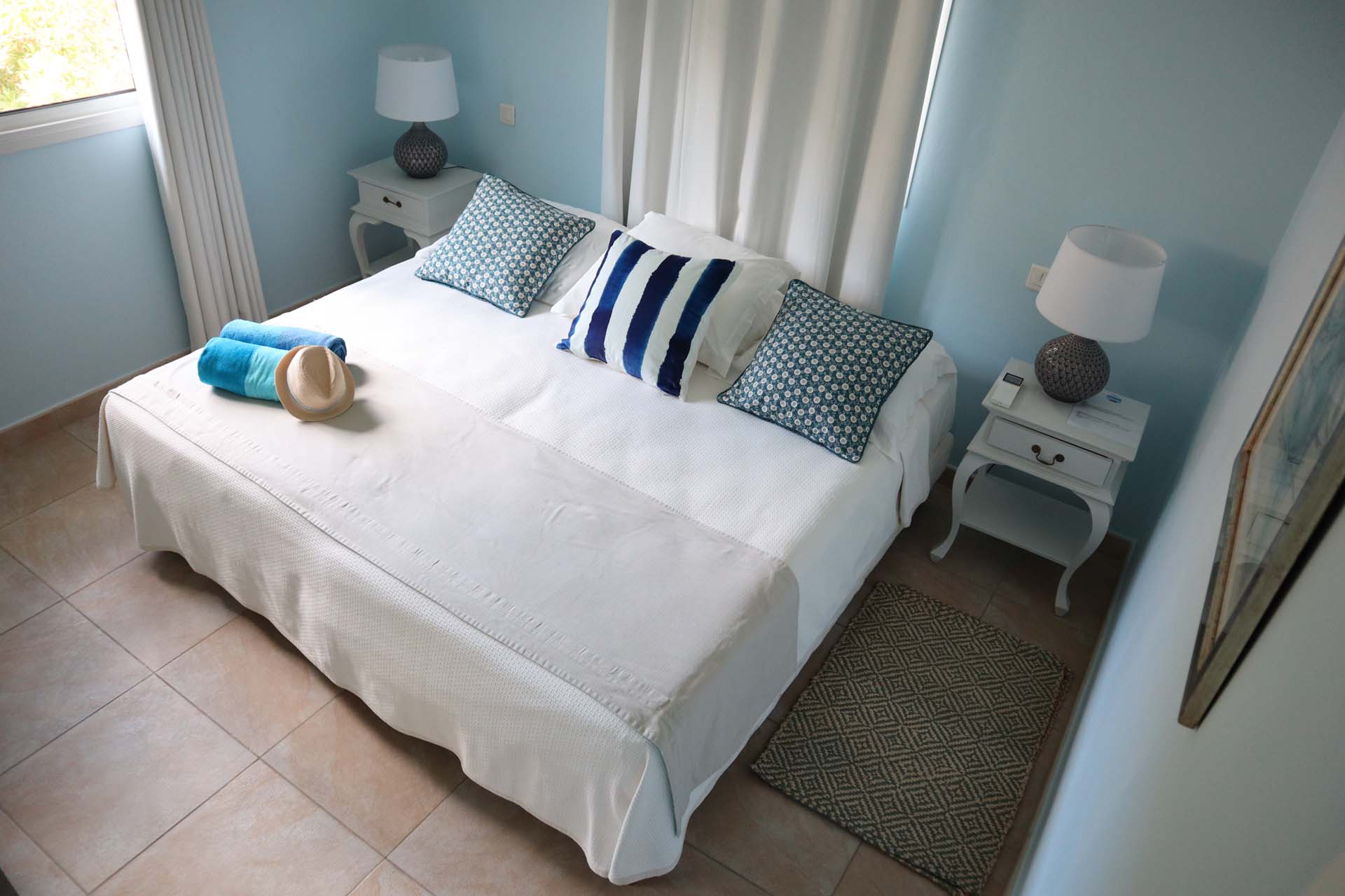 The bedrooms at Villa Celina, each a peaceful retreat one with a king-sized bed and one with a king that can be split into 2 twins both promises a great night’s sleep. With soft linens and the same calming ocean-blue color scheme, recharging here is easy. Both bedrooms share a bathroom.
