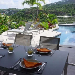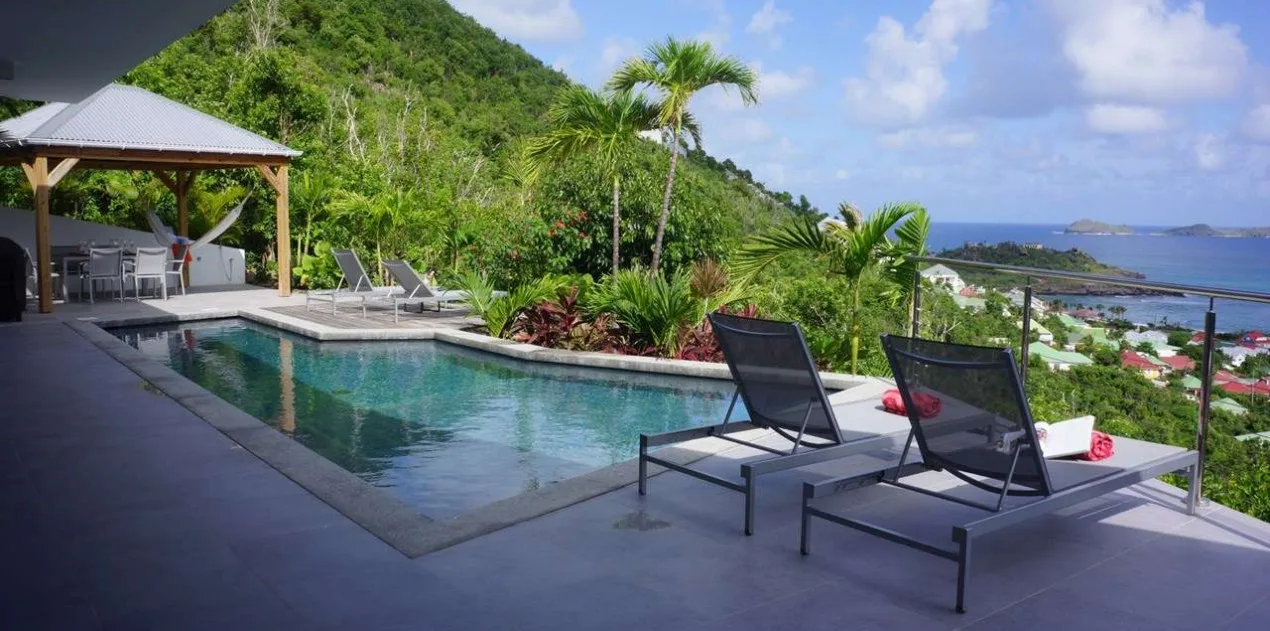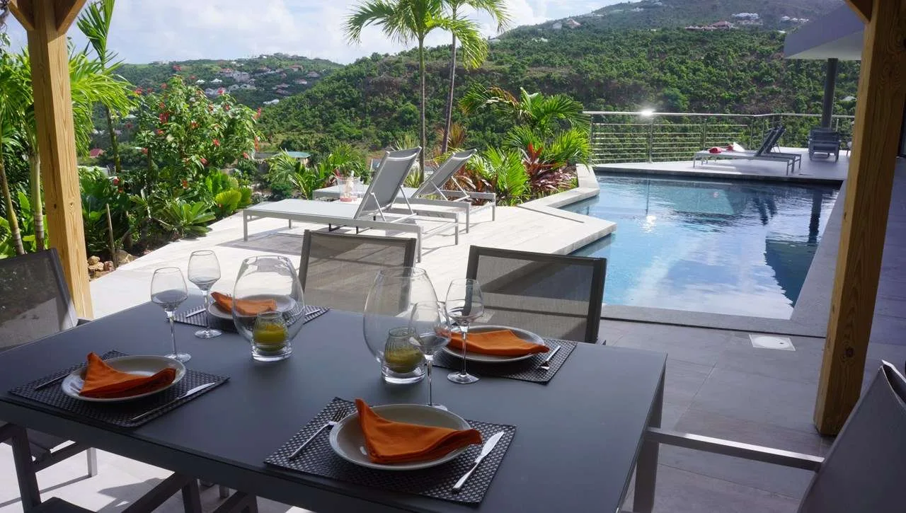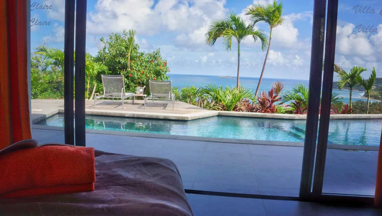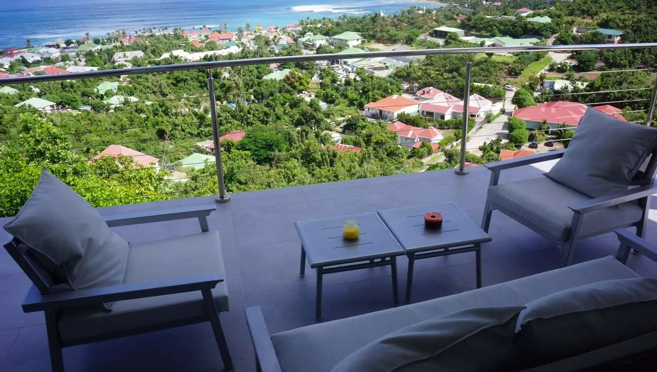 A terrace with several sitting areas wraps around the exterior of Villa Claire, coaxing you outside to enjoy extraordinary views over Lorient. Verdant green hills and crystalline Caribbean waters make this a dreamy place to spend a day chilling out, sipping on a cool drink, sunbathing, or enjoying quality time with family and friends.