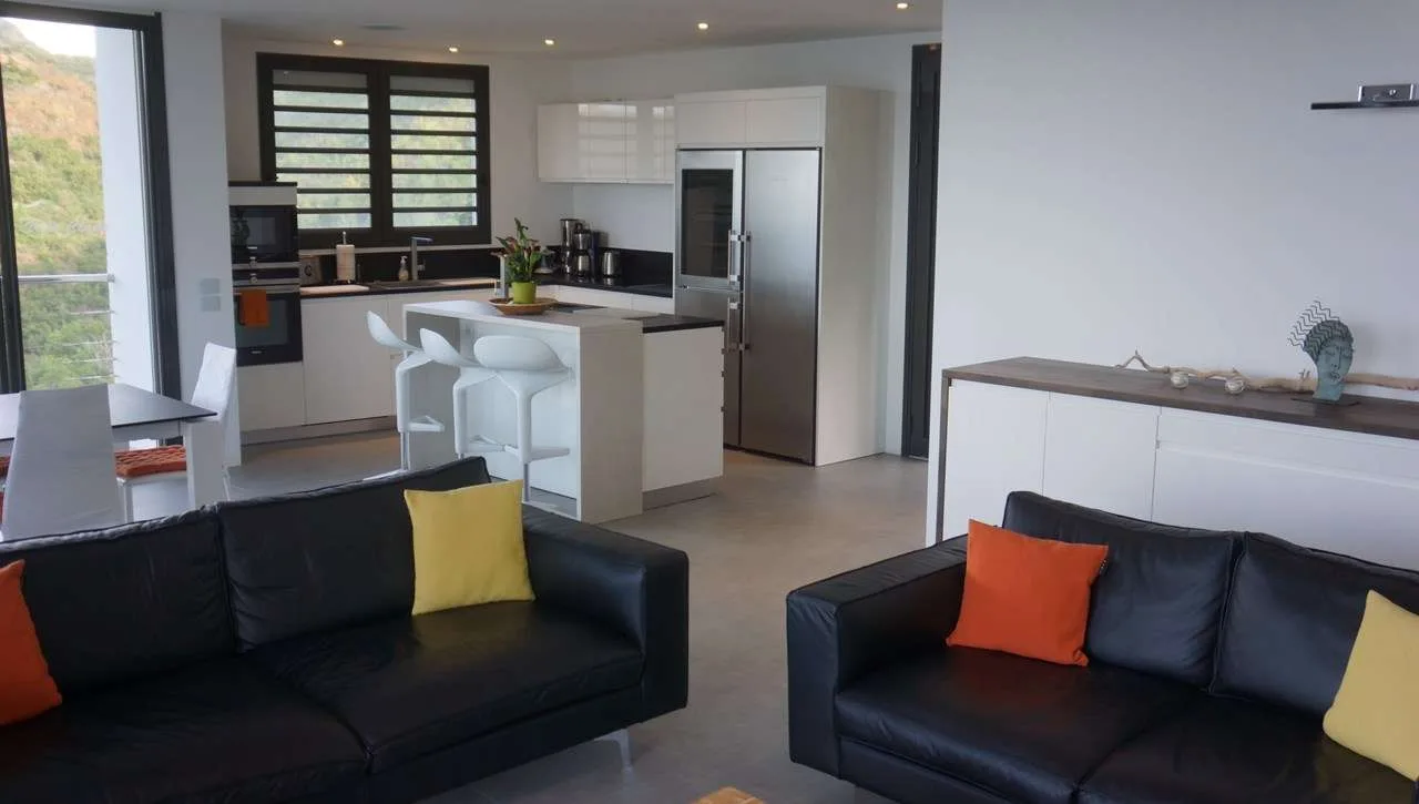 In the living room, a pair of sleek black sofas provide a wonderful spot to unwind, letting the relaxing pace of St. Barts slip over you. Behind, floor-to-ceiling windows open to the view, inviting in the cooling sea breezes at all times of the day.