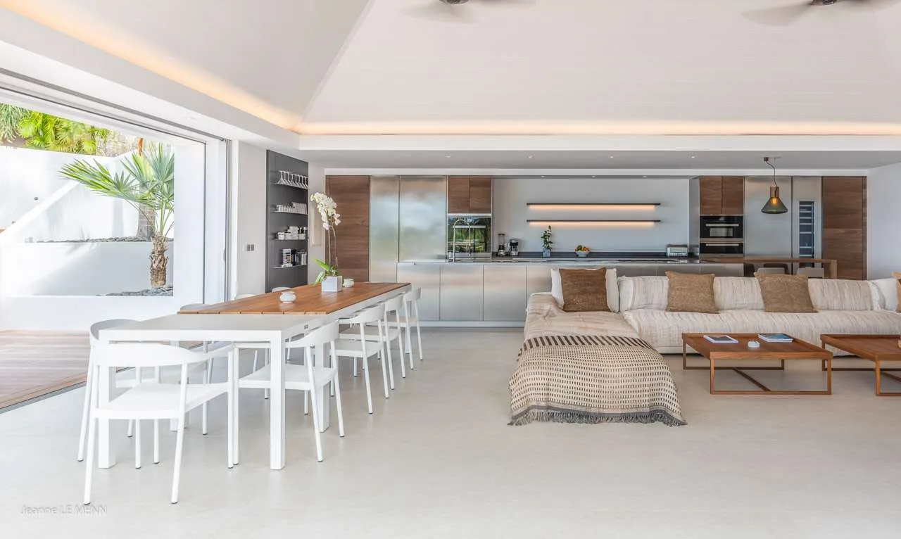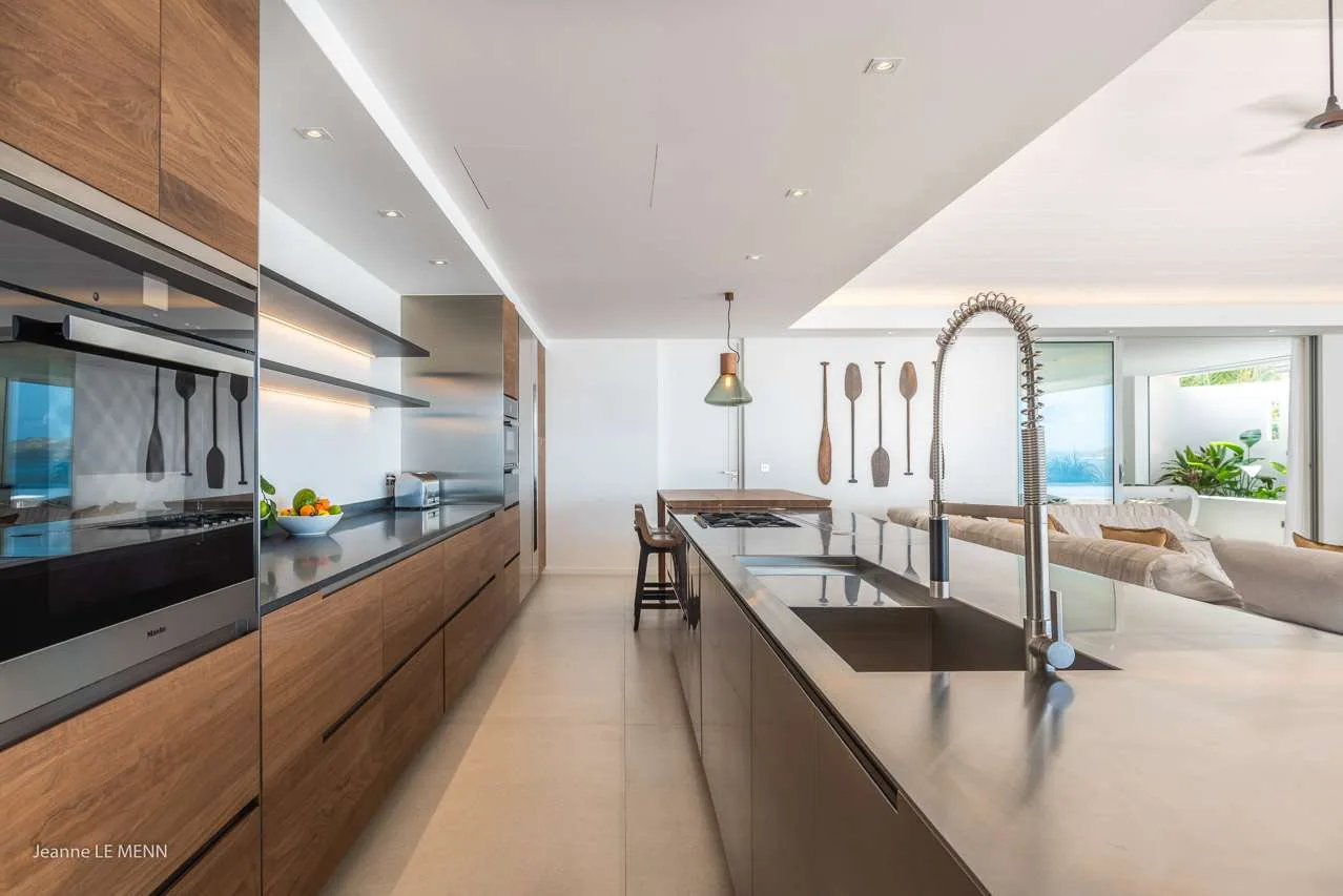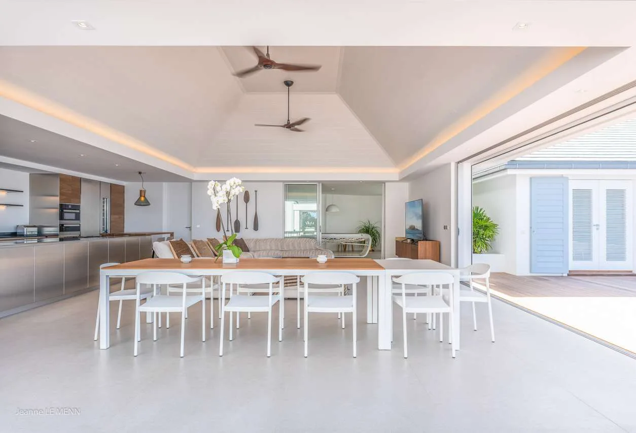 The main room at Villa Coco was designed to enjoy the stunning views over Lorient Bay, with large windows on all sides. Here you’ll find the living room, dining table, and kitchen. In the living room, a comfortable sectional sofa in front of the entertainment center is an inviting place to relax.