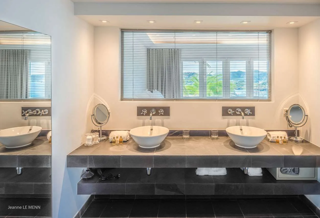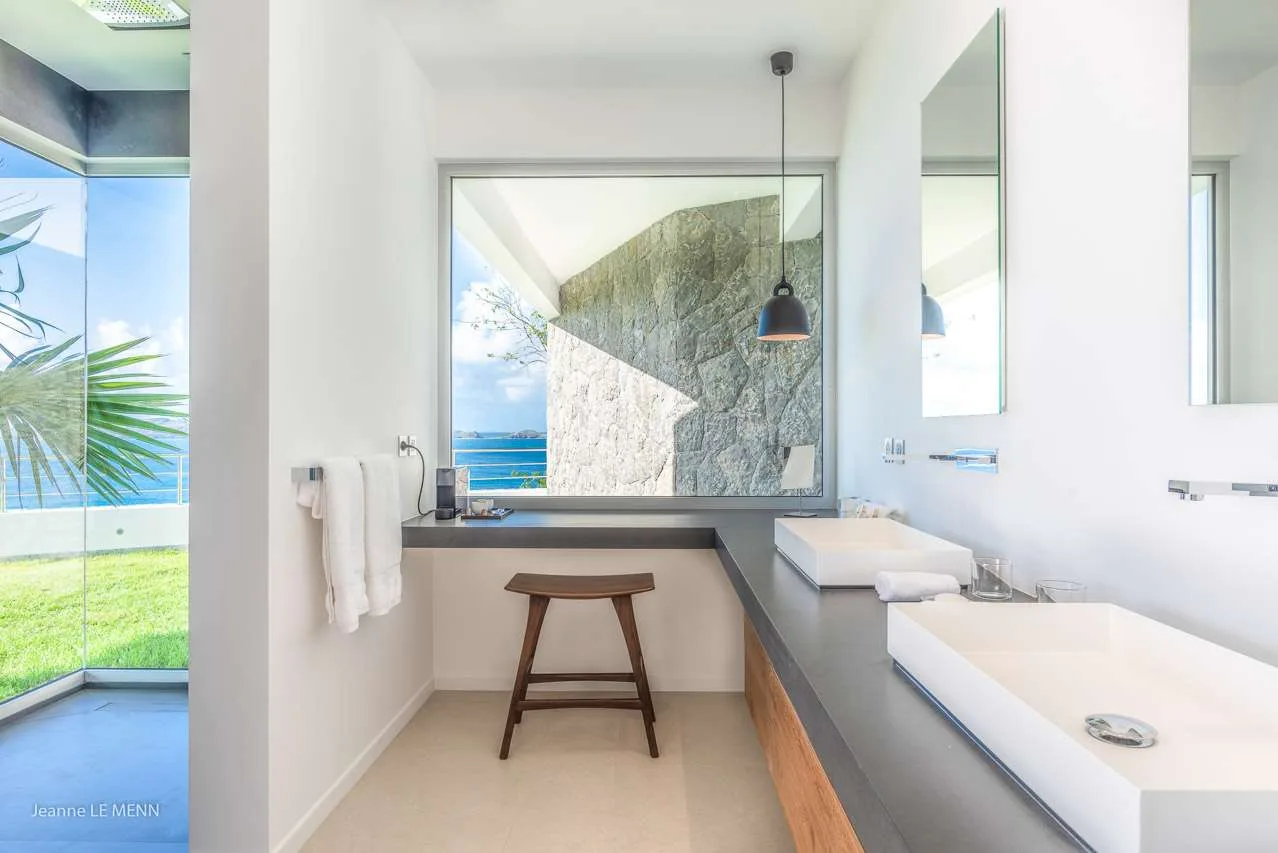 There are 3 bedrooms at Villa Coco, spread out across the villa to ensure privacy for guests. Each room has a Euro king-sized bed, views over the ocean, and an ensuite bathroom. Decorated in the classic Caribbean style, they’re exquisite places to relax and recharge at the end of a day exploring. The first bedroom is off the main terrace, next to the living area. The second bedroom is below the first on the lower level, while the third bedroom is on the other side of the property in a separate unit. This room is larger than the others and enjoys gorgeous views over the ocean and rugged hills of Lorient Bay.