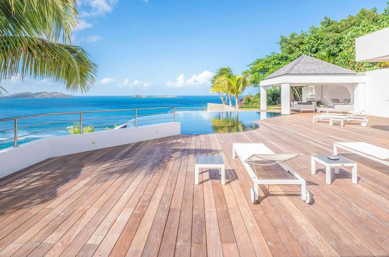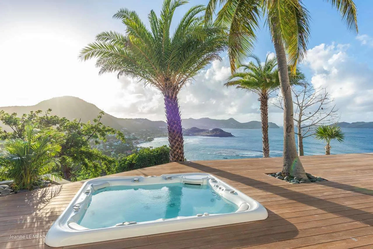 The centerpiece of the outdoor area is the large, heated infinity pool, in the shape of a Nautilus shell. Scattered around the terrace are ample options to relax in the sun or shade. An outdoor living room under a gazebo is ideal for entertaining, while sunseekers will love the loungers lining the water. The lower-level terrace features more loungers overlooking the bay, and a cozy hot tub. From all the outdoor spaces at Coco Villa, the views are enchanting. Offshore are the islands of Île Toc Vers, Île Frégate, and Île Bonhomme, while in the distance you can even see St. Martin and Anguilla.