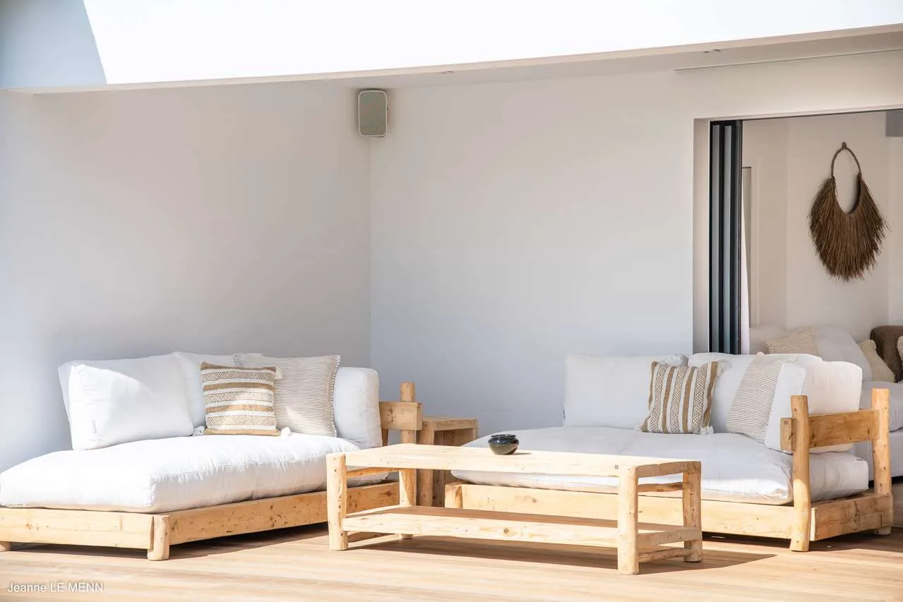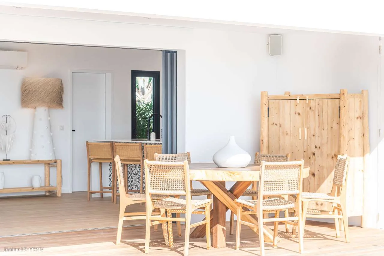 Outside the main room is the outdoor dining and seating area and the deck with loungers by the heated pool.