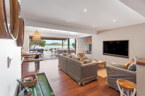 As you enter the front door, you’re immediately delivered into Villa D’zir’s spacious great room. Wall-to-wall doors slide open to let in the ocean breeze, washing over the living room, dining area, and kitchen.