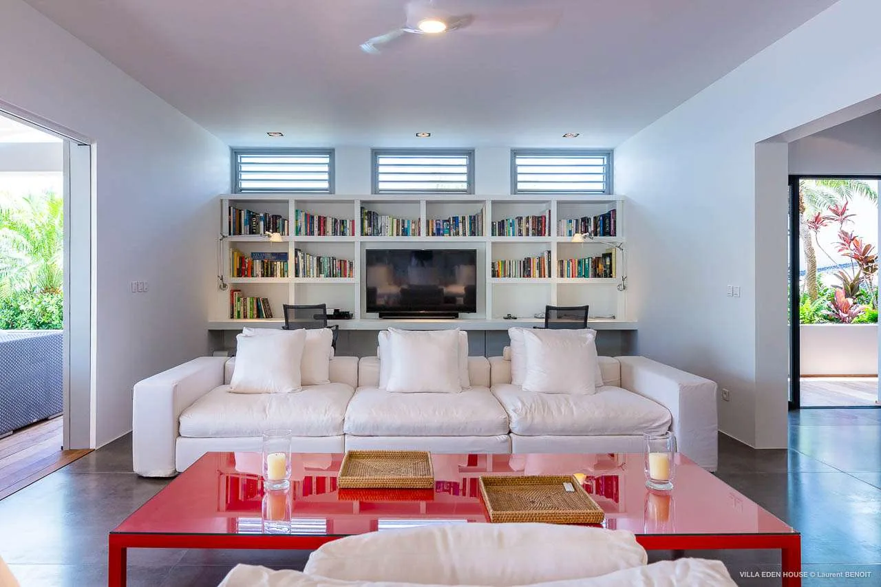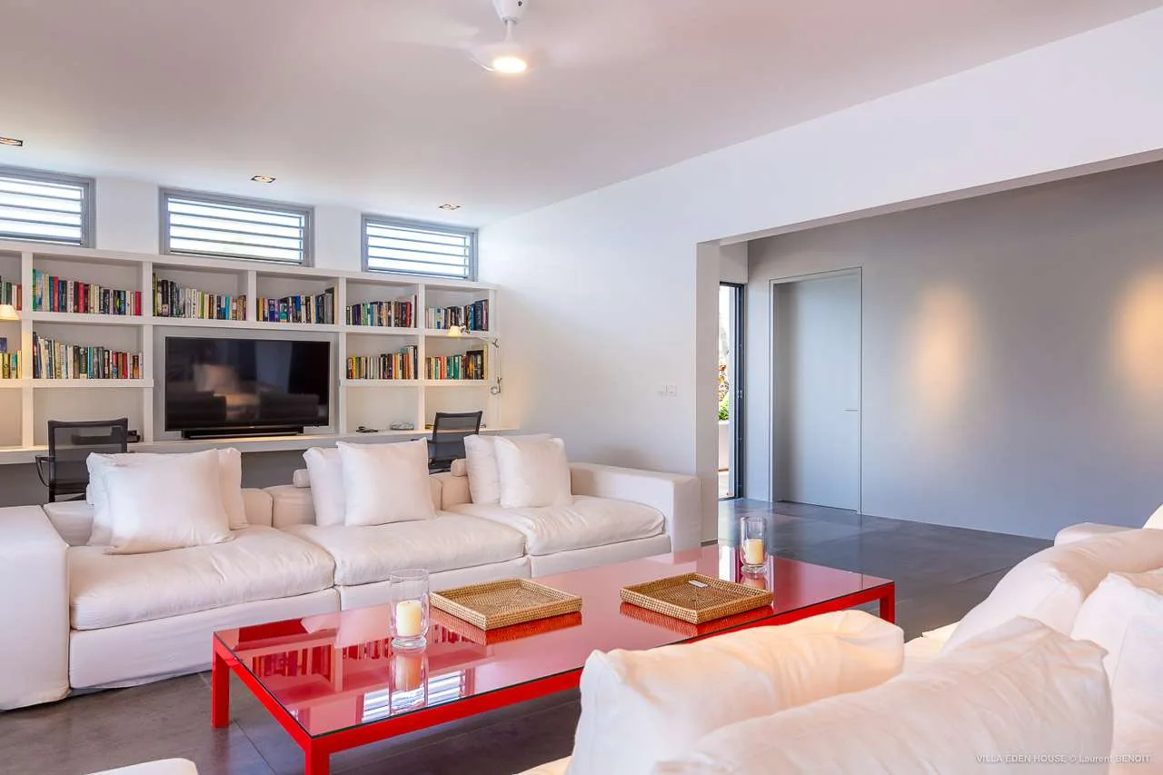 Open and airy, the interior living spaces of Villa Eden House are tranquil and calm. A contemporary gray color scheme contrasts with a vibrant accent of color in each space, creating a home that’s at once stylish and welcoming. Add to this superb attention to detail and design, and this is one of the most inviting villas in St. Barts.