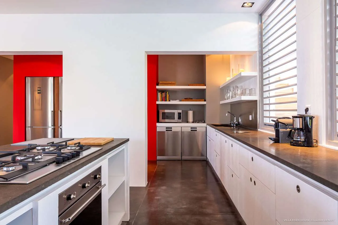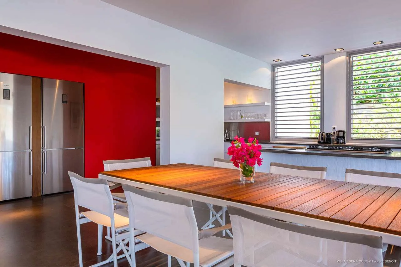 Sharing the space with the living room is Villa Eden House’s gourmet kitchen. Here you’ll find top-of-the-line equipment, including two stainless-steel refrigerators and two Miele dishwashers. The striking red feature wall is a highlight, contrasted by the steel appliances.
