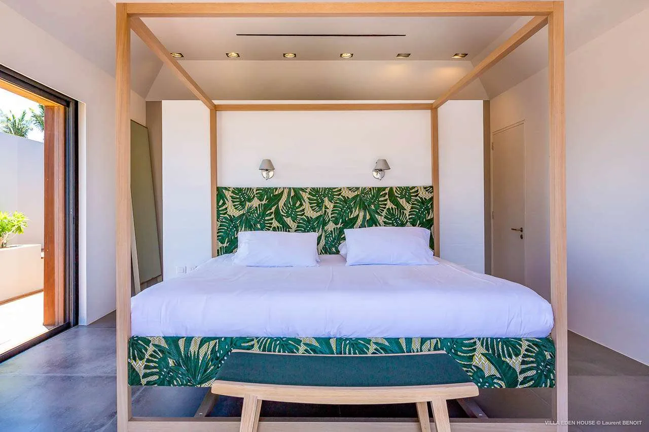 The three bedrooms at Villa Eden House each enjoy a different color scheme: bougainvillea pink, turquoise, and banana-leaf green. The beautiful design continues here, with elegant lighting above illuminating the soft wooden bed frames and minimalist details.