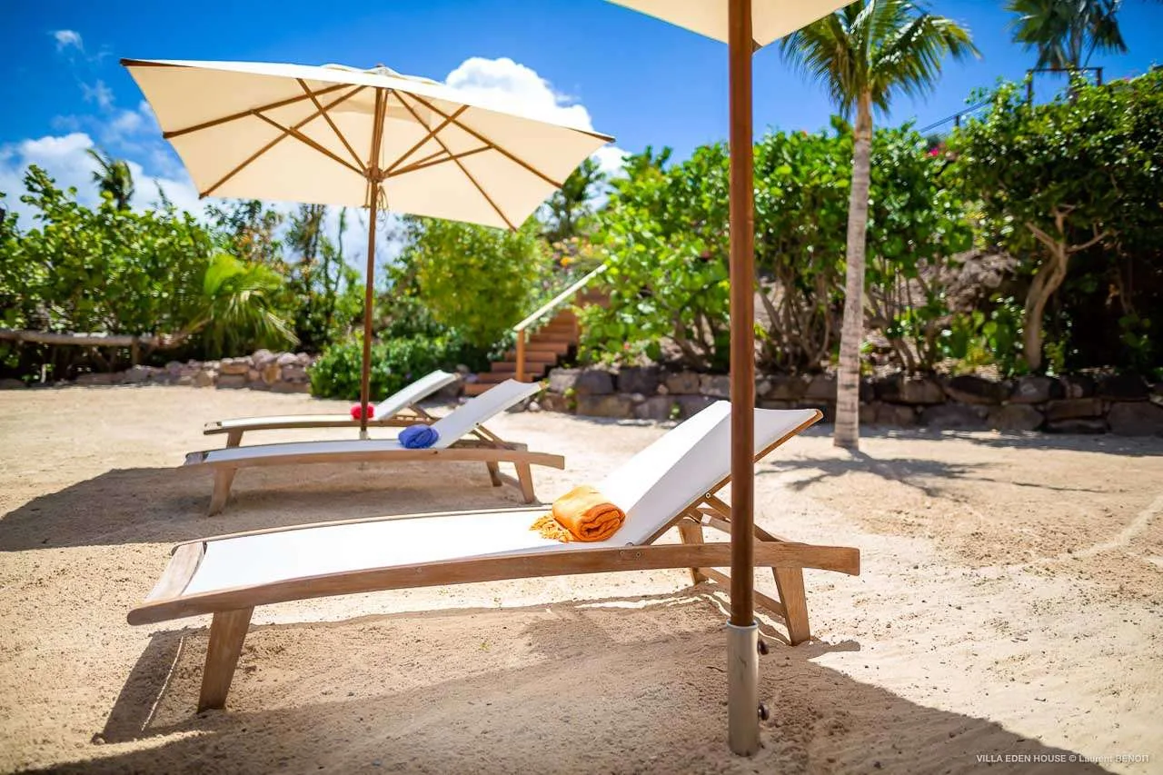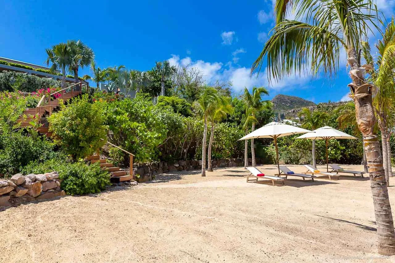 Following a path from the villa leads through a lush garden to the property’s private coconut grove, where a sandy area with loungers provides easy access to the inviting Caribbean Sea.