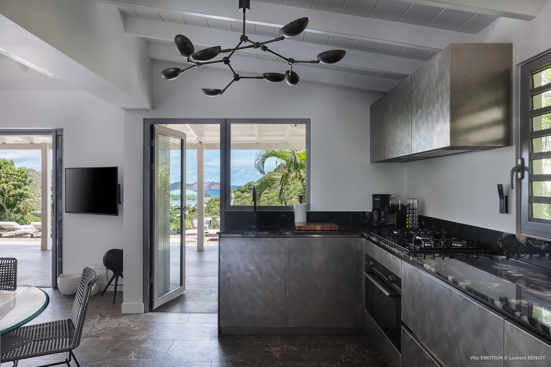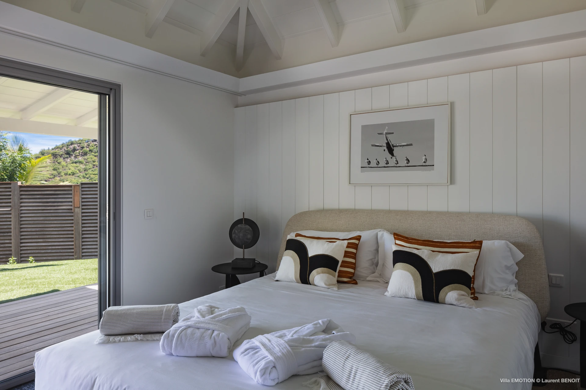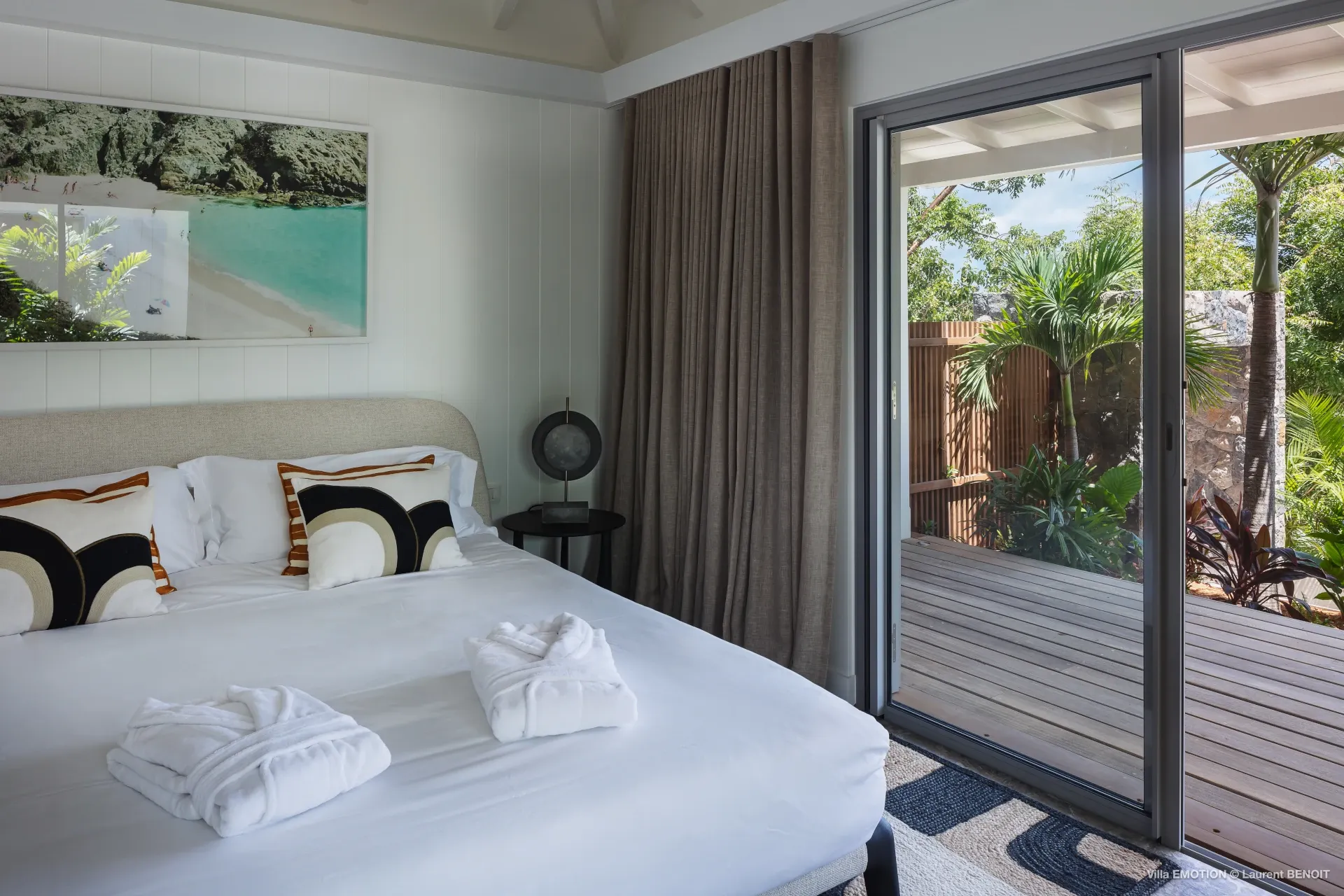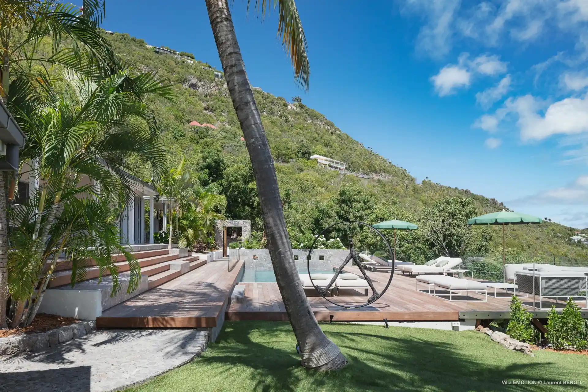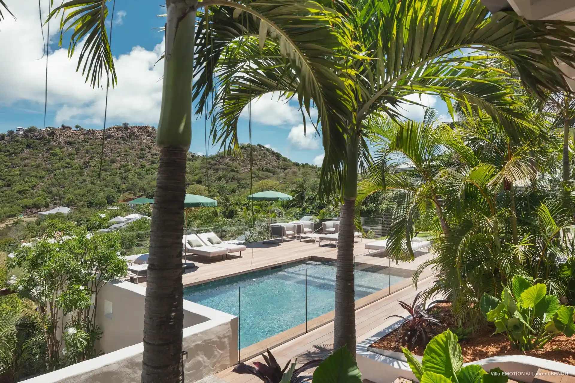 Outdoors, Villa Emotion truly comes into its own. The spacious terrace features a heated swimming pool, sun loungers, shaded lounge areas, and an al fresco dining space—perfect for leisurely lunches or sunset dinners overlooking the bay. A beautifully landscaped tropical garden surrounds the villa, enhancing the peaceful and intimate ambiance of this private retreat.